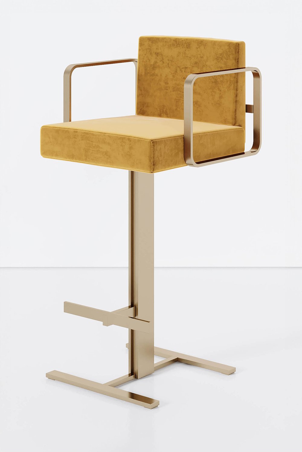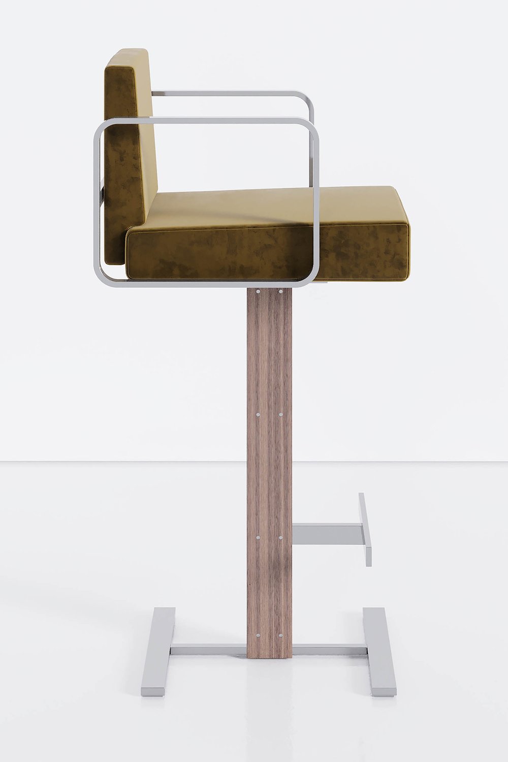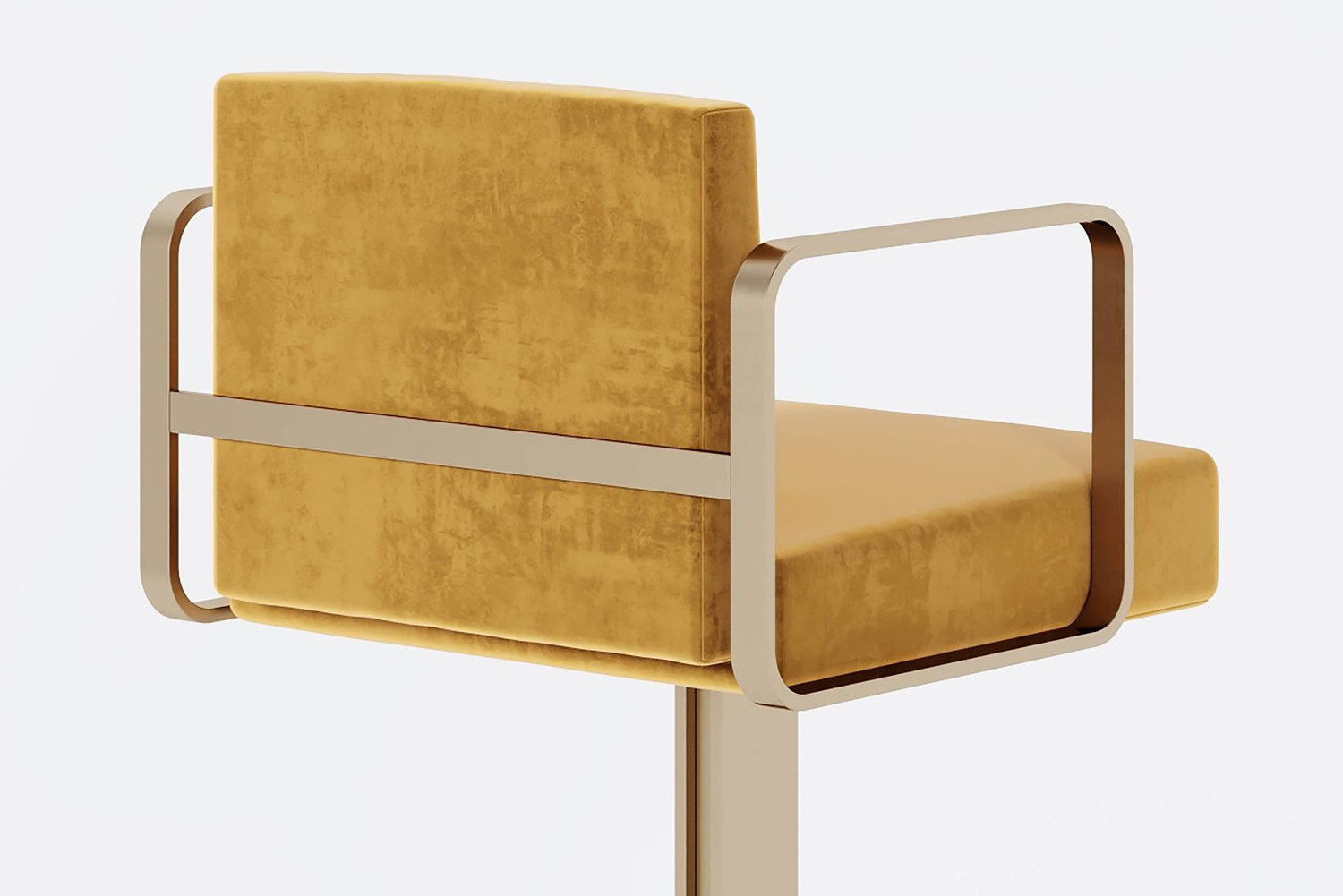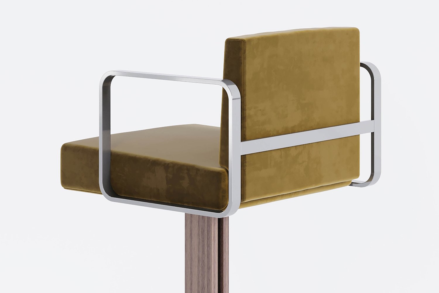 The juno barstool is a carefully proportioned series of sliding and intersecting planes, culminating in a 360 degree pivoting seat that introduces a luxe softness to juxtapose against the unapologetically architectural support.