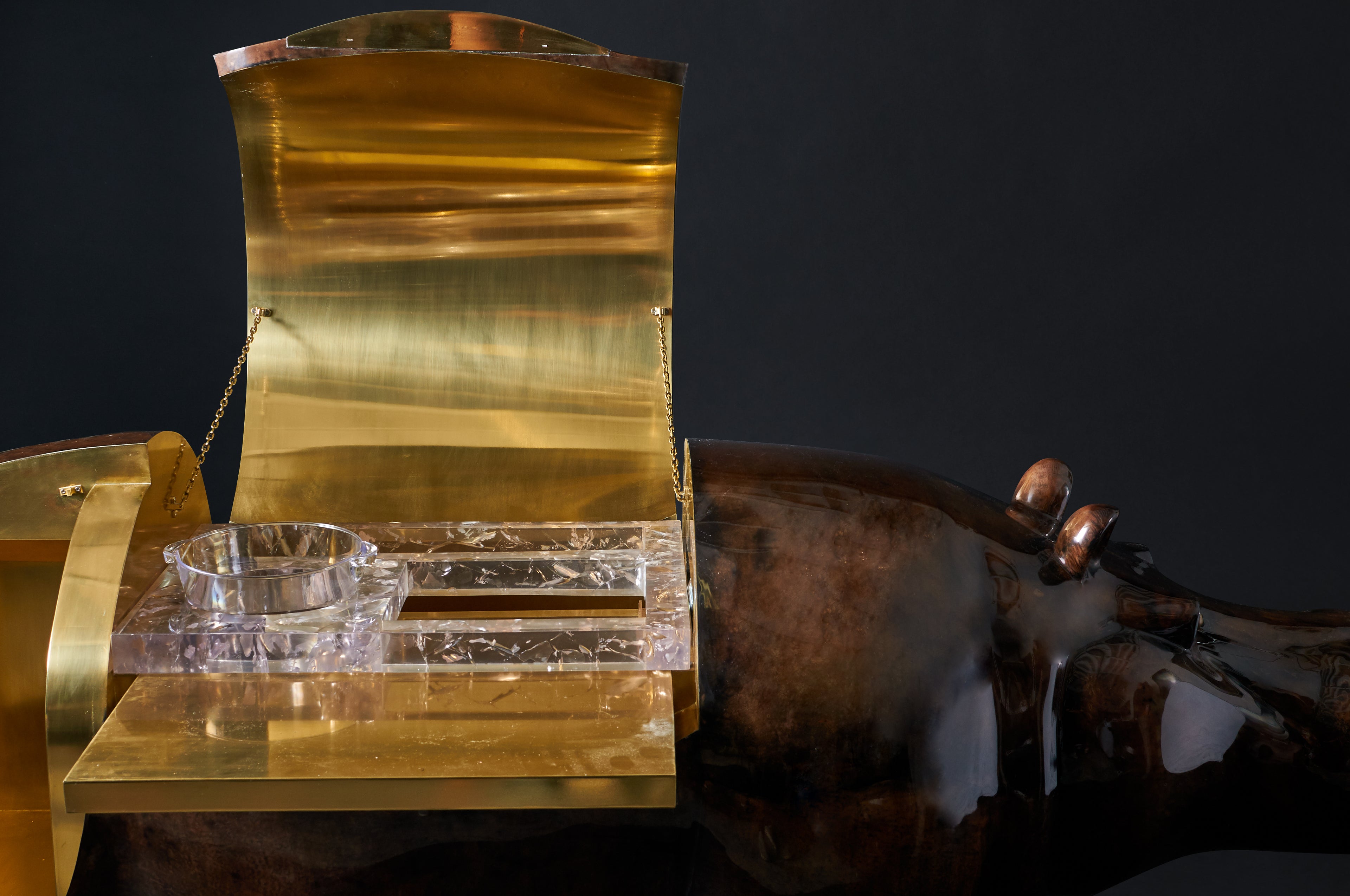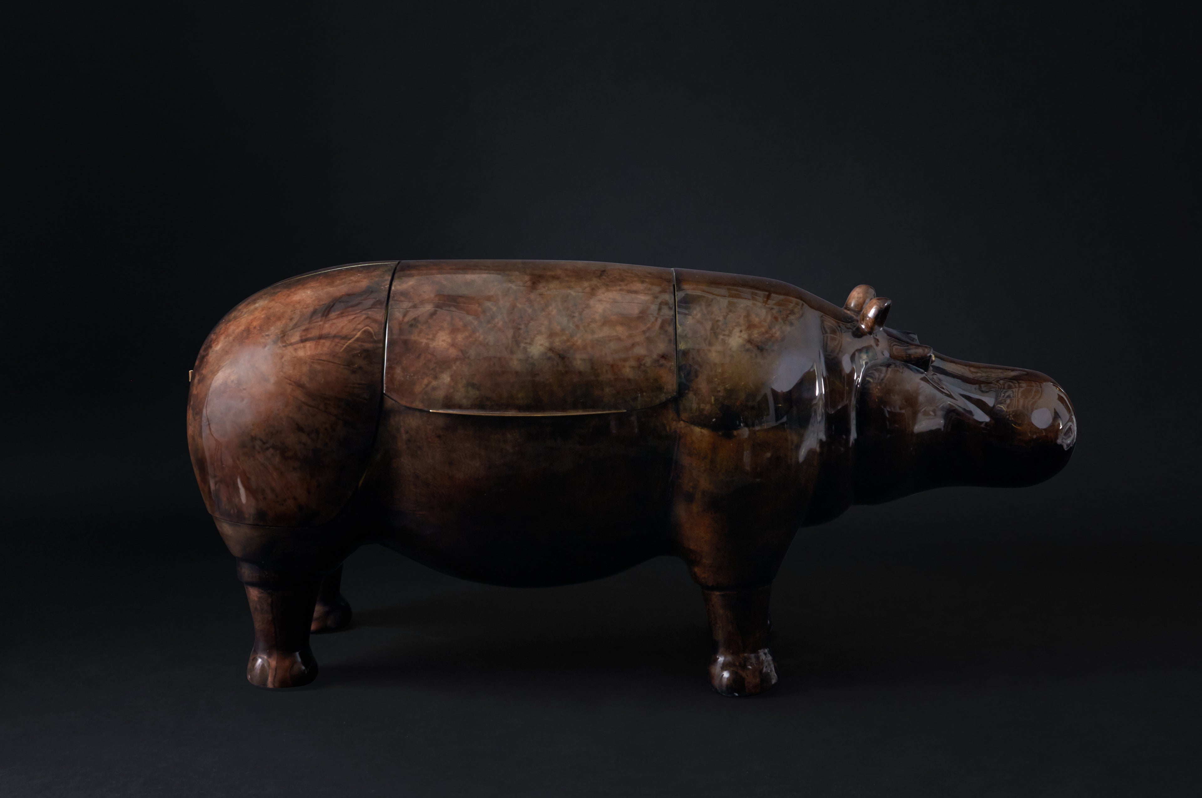 This coutoure hippo dry bar is mantled in a rich brown parchment with a high-gloss resin glaze