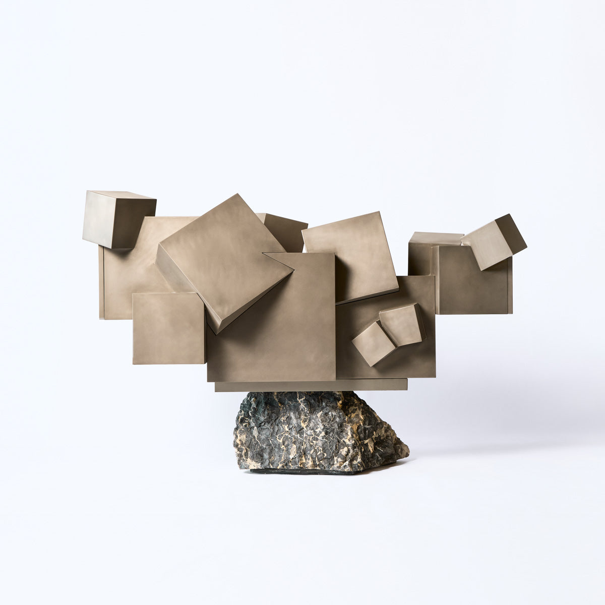 Also known as ‘fool’s gold’, the mineral presents itself as a cuboid crystalline structure and is represented in the piece through an assembly of multiple cubic containers of different volumes and sizes, meeting at odd angles to bring the ‘crystalline inspiration to life