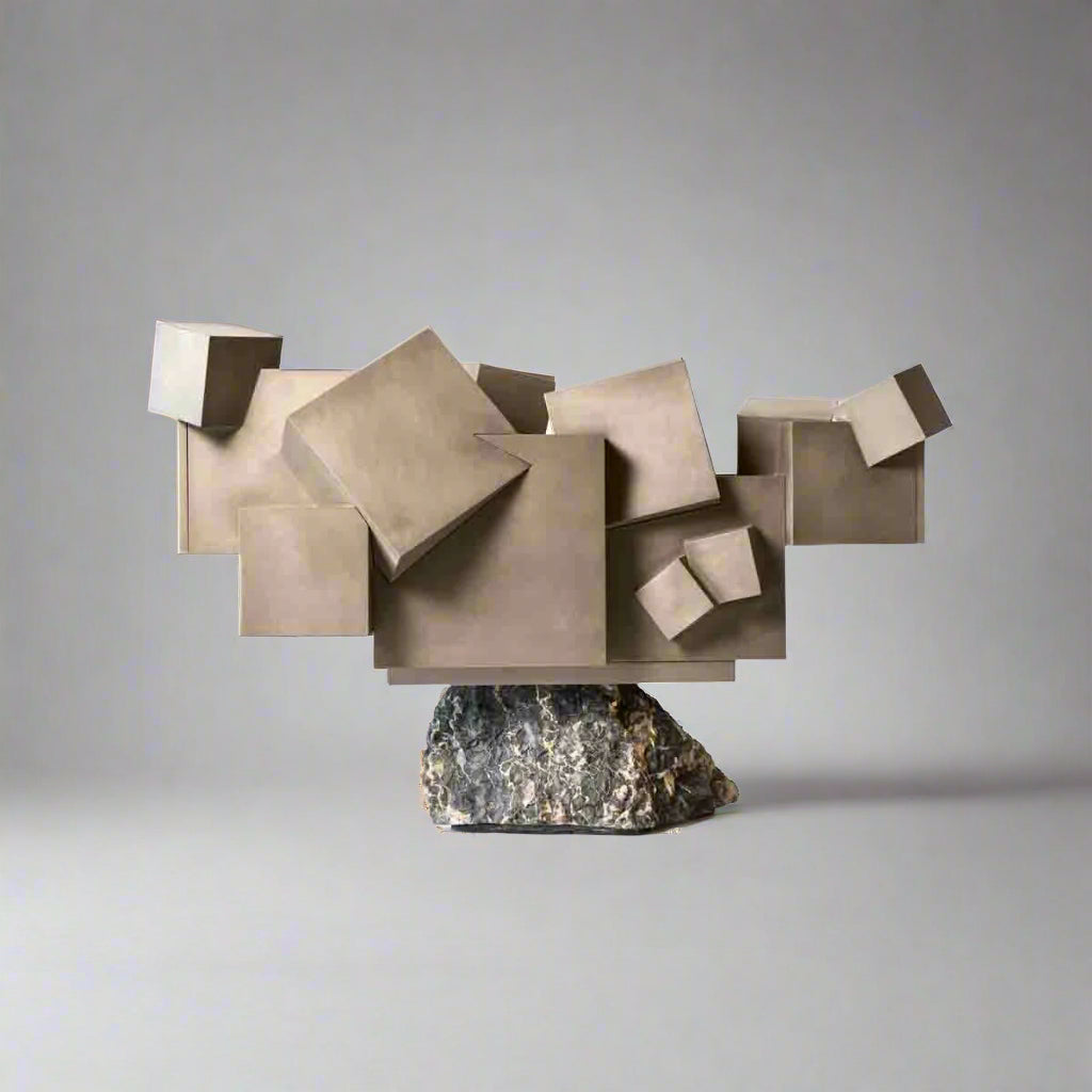 The stoney and irregular base supports the cubist set perfectly, with the structure of pyrite resting on top