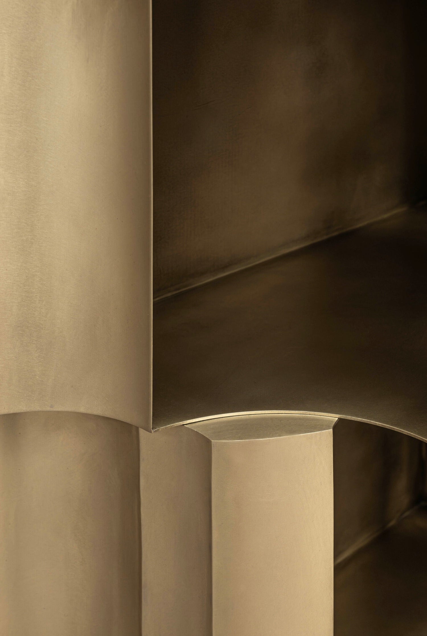 Comprised of sculptural forms, the cabinet is shaped with curves of patinated brass. The piece embodies the transition between the solid and void, open and closed, light and shadow, concrete and imaginary.