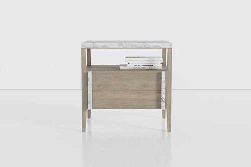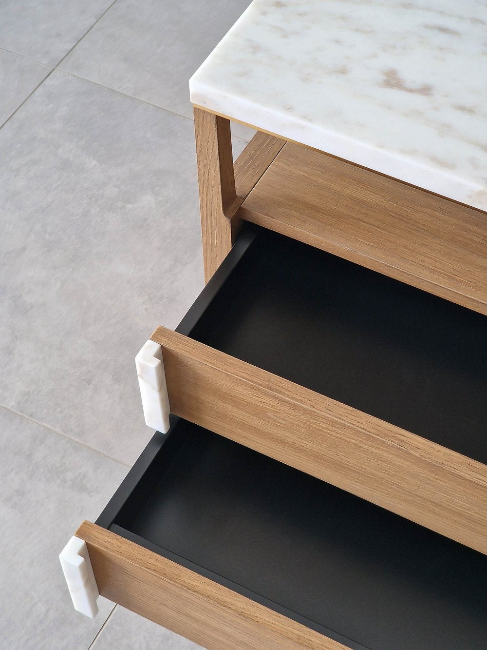 The Komodo Side Cabinet features sensuously carved marble pulls to echo the heavy marble top. In addition to drawers, an open shelf creates an ideal space for a book or ipad