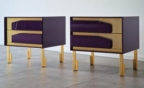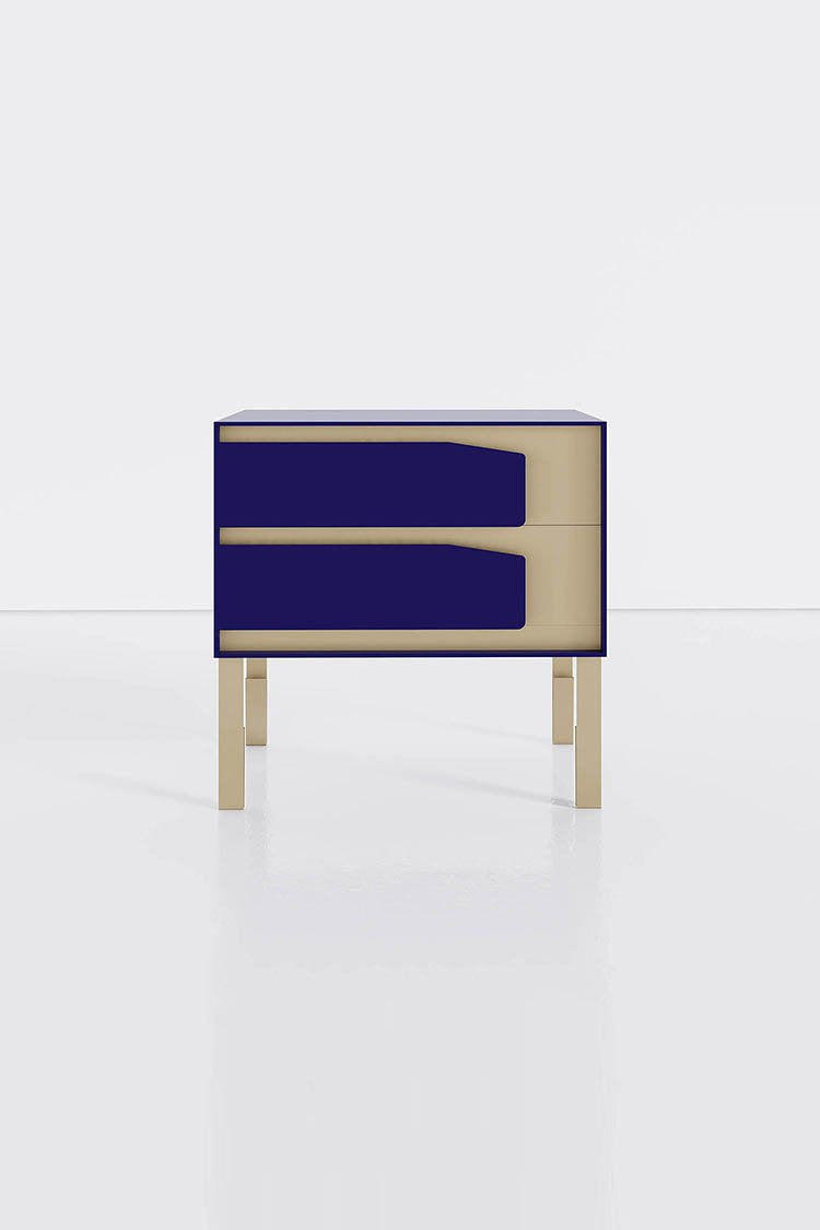 The asymmetry of the paraiso side cabinet makes it the perfect piece to flank a bed or sofa. Its lacquered exterior is clad in an armor of brass plate which seamlessly transitions to a footed leg