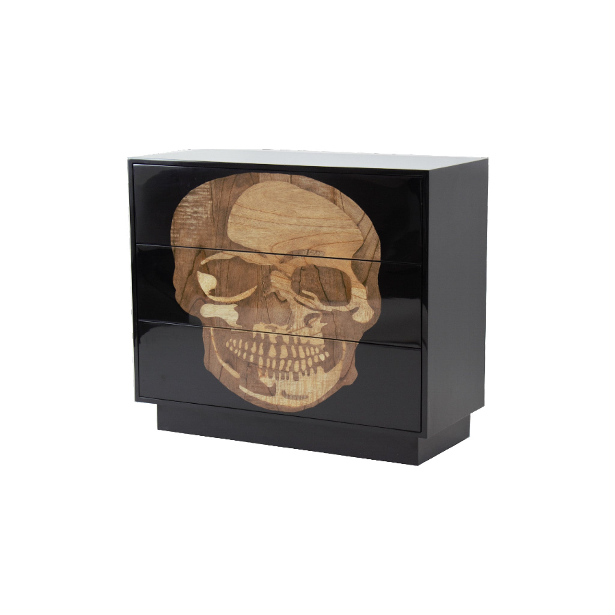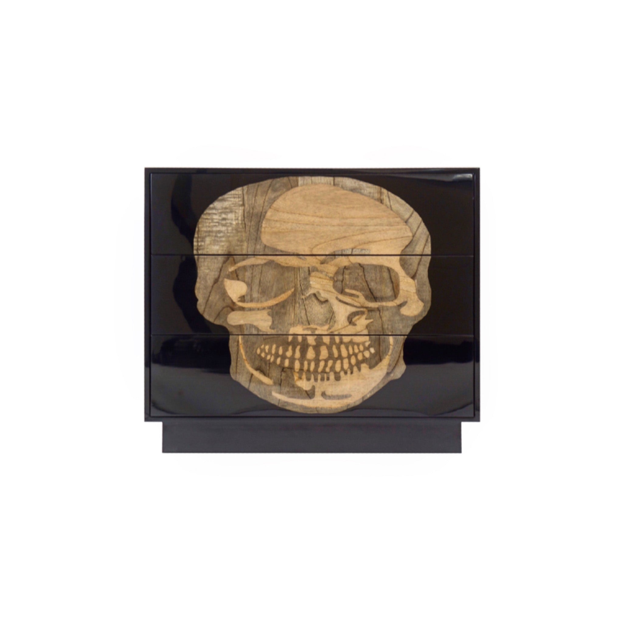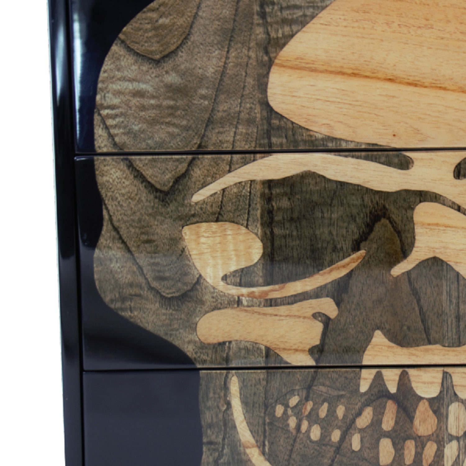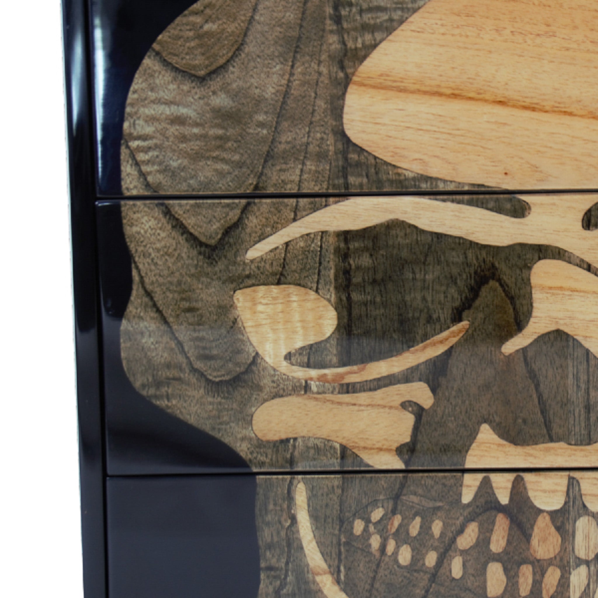 Skull Scene Chest of Drawers finished in polished black resin with a elaborate animal motif made from Mango and Mahogany contrasting wood inlay