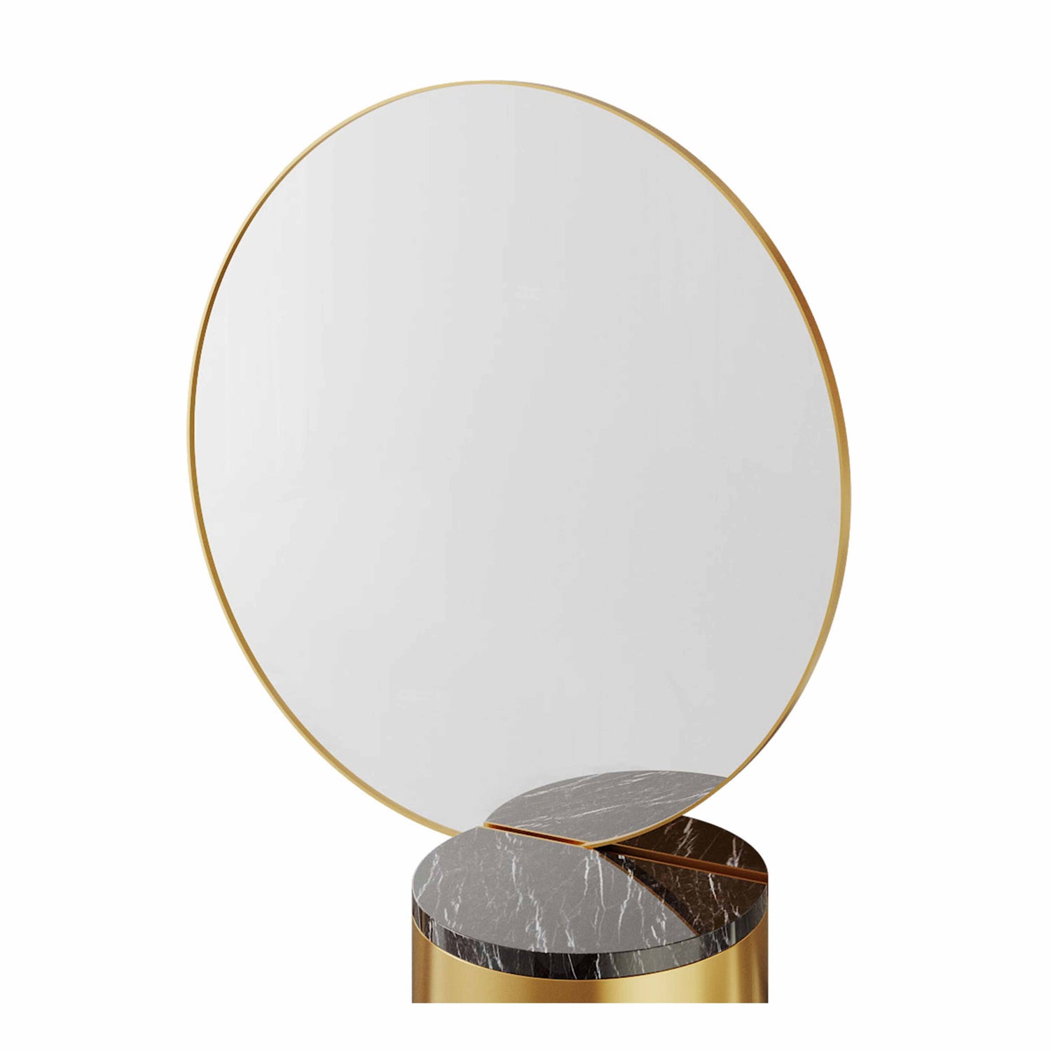 Strings Beauty Table is a vanity table with a surprising form, its circular metal drawers with a large mirror look stunning with the Strings Pouffe.