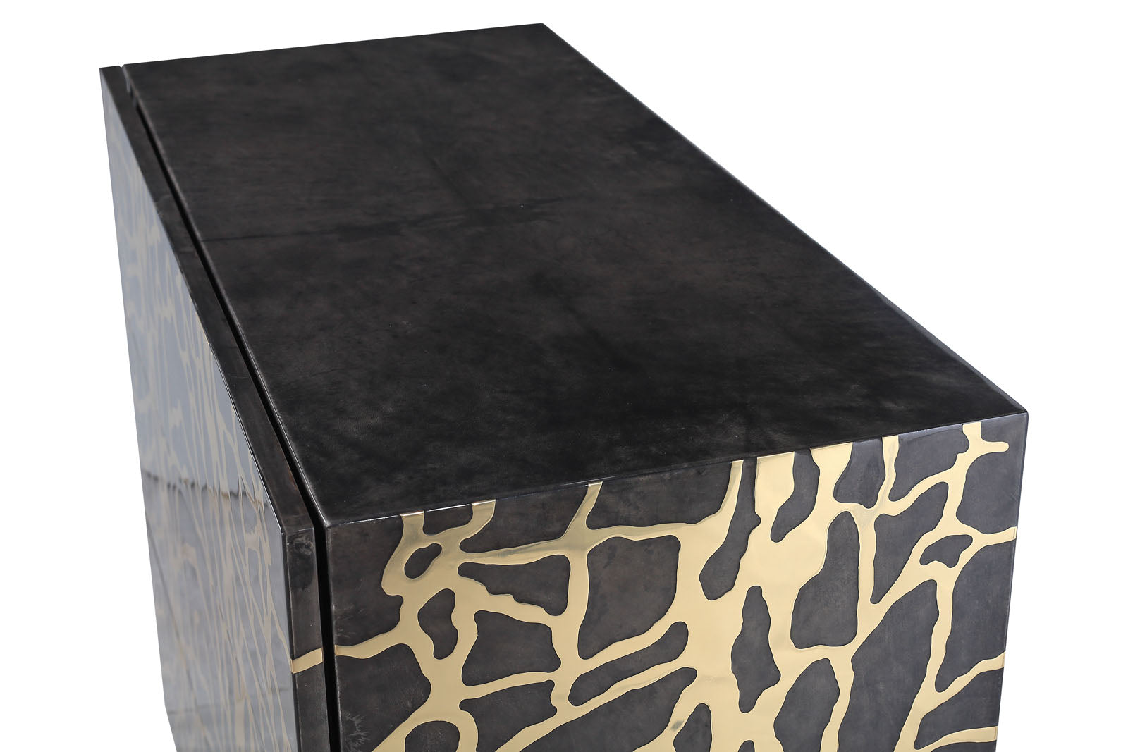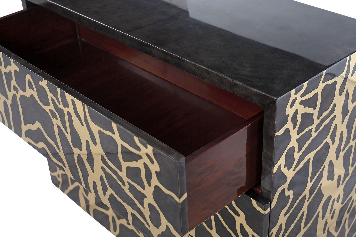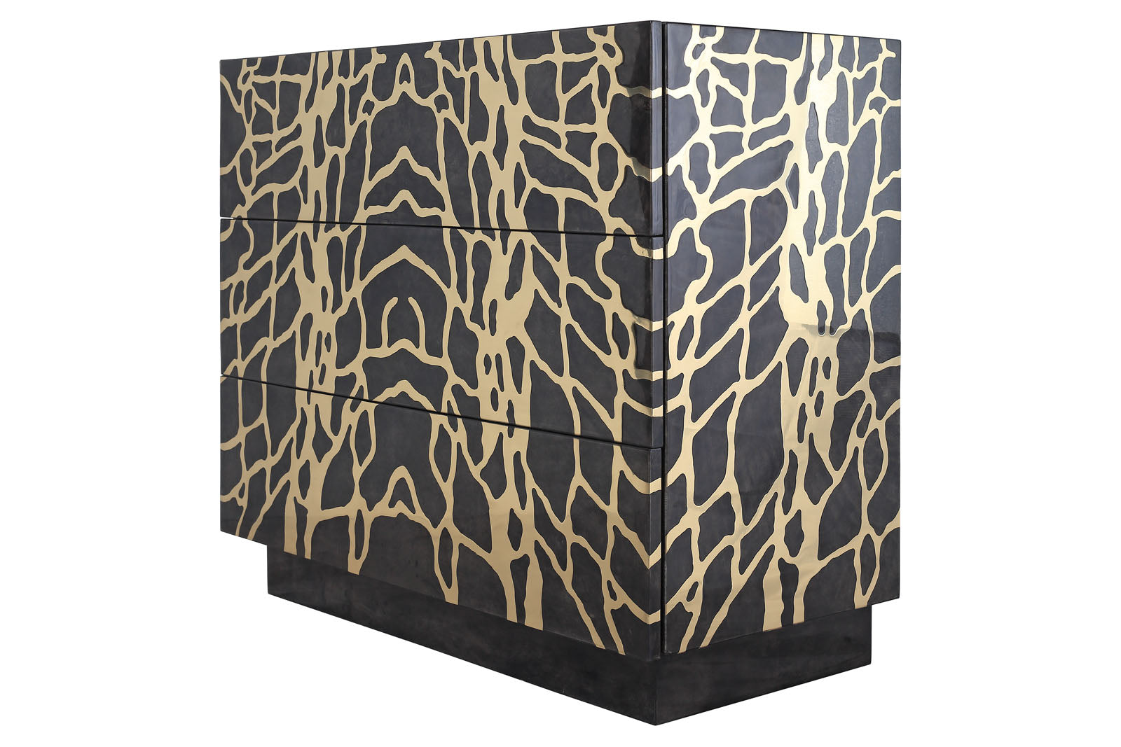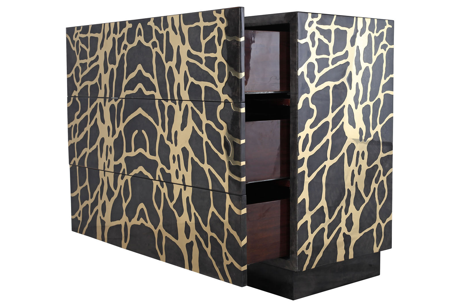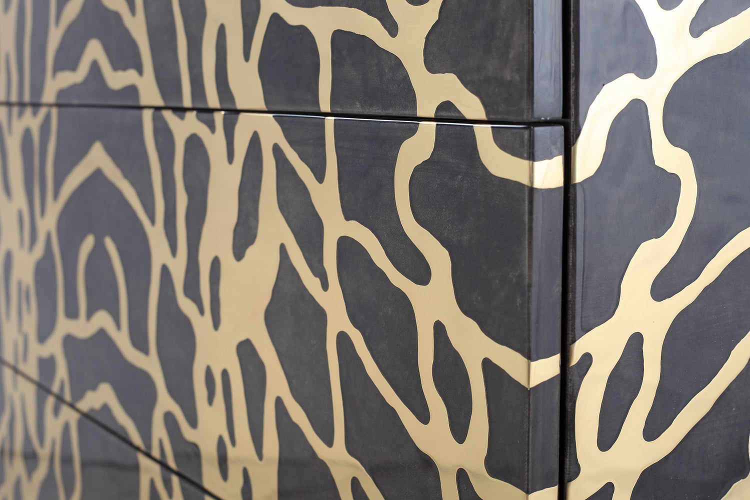 The flowing brass inlay design progresses across drawer fronts seamlessly addiing to the elequence of this piece