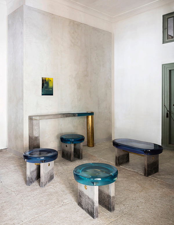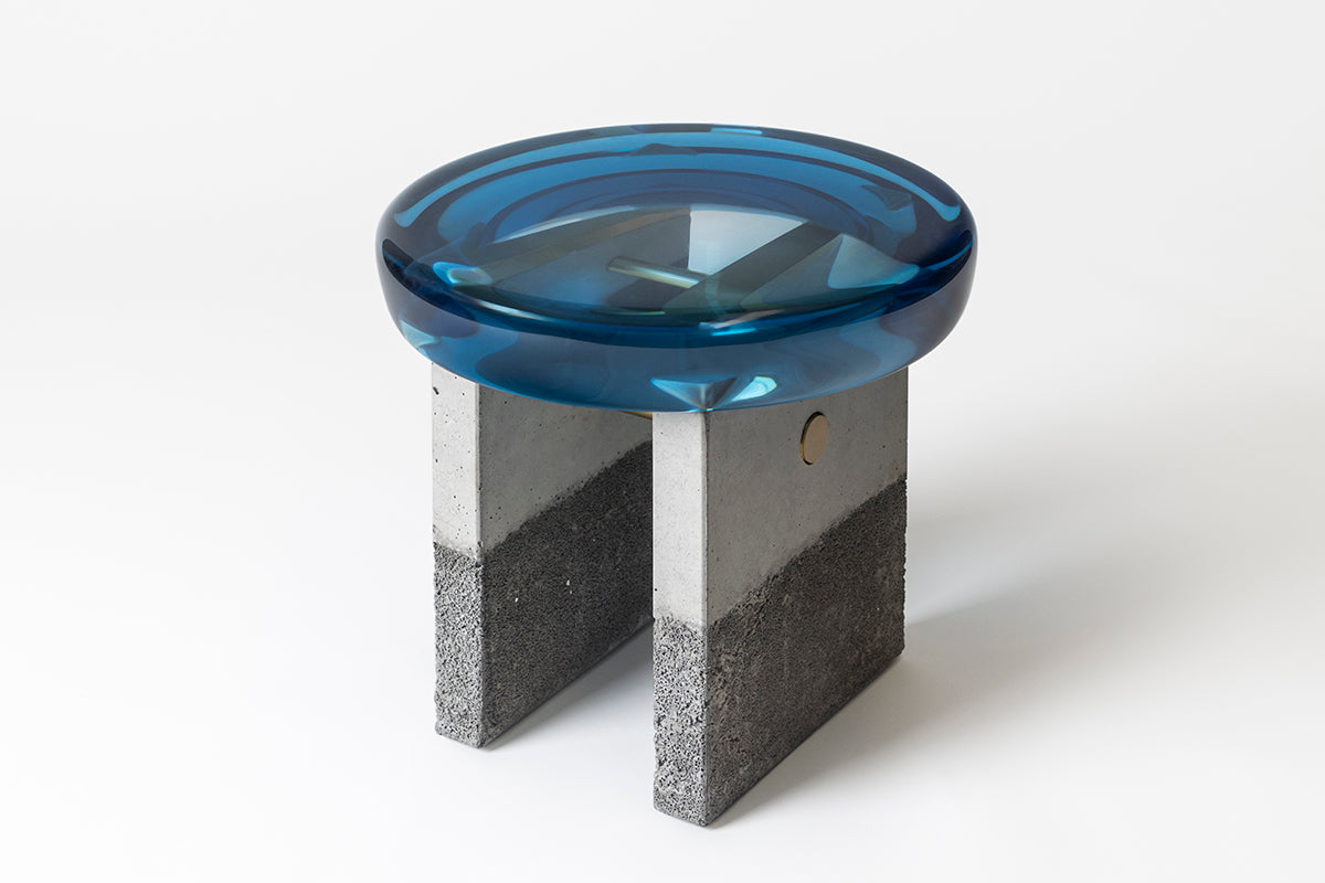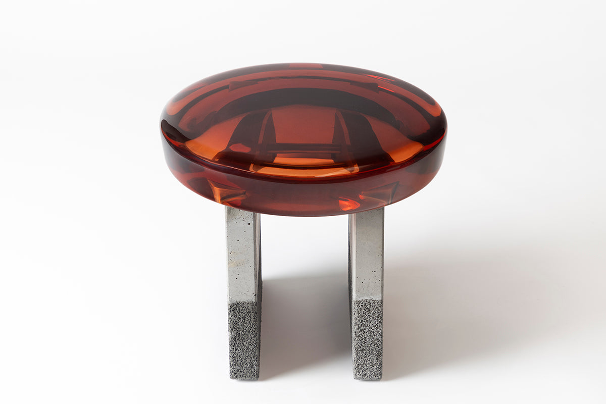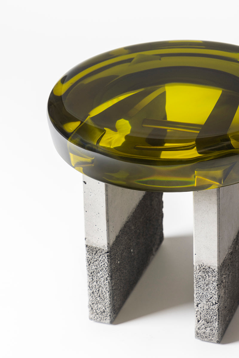 Comprising a stylized formal composition, Golia stool presents a thick round epoxy resin seat resting upon two squared concrete legs.