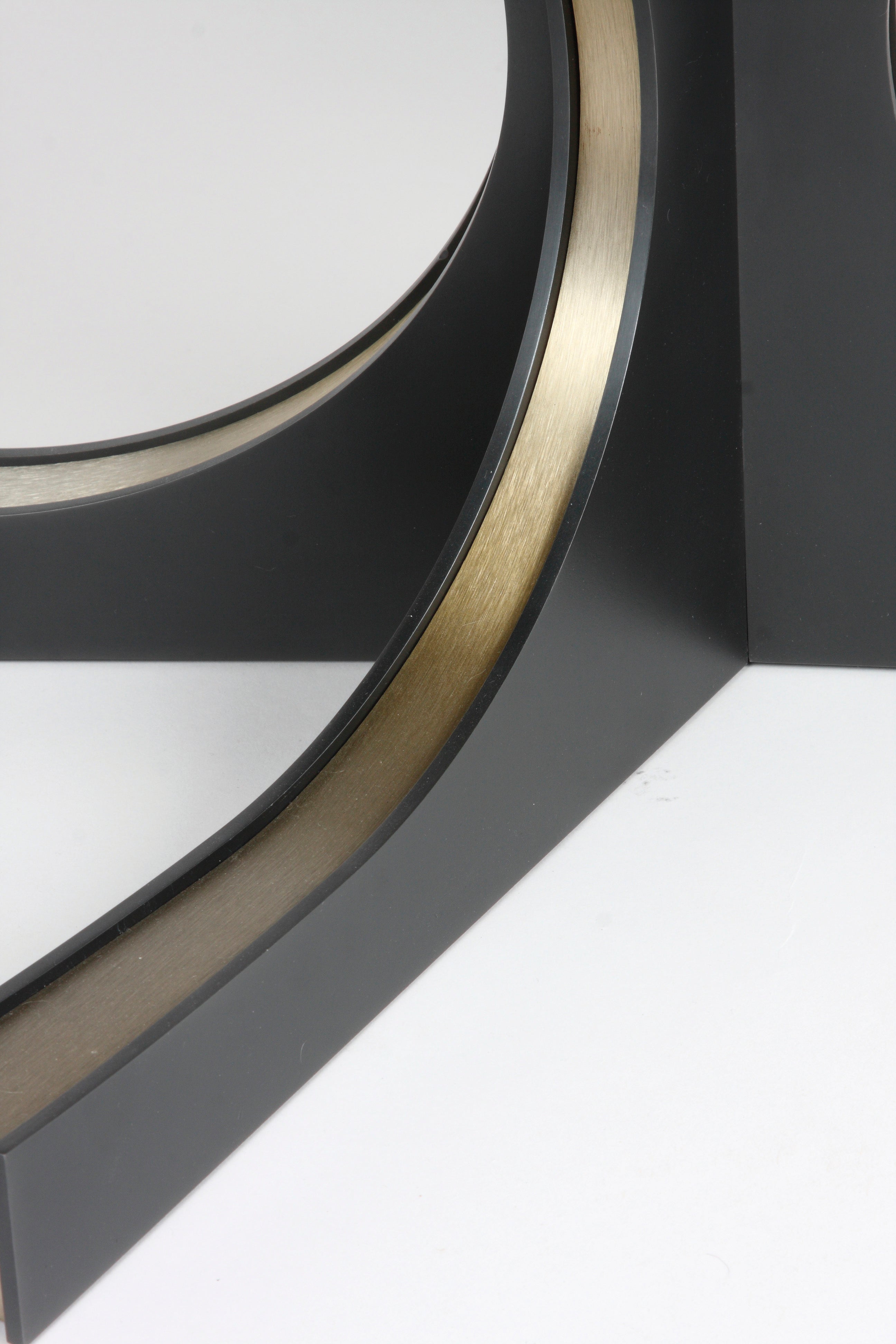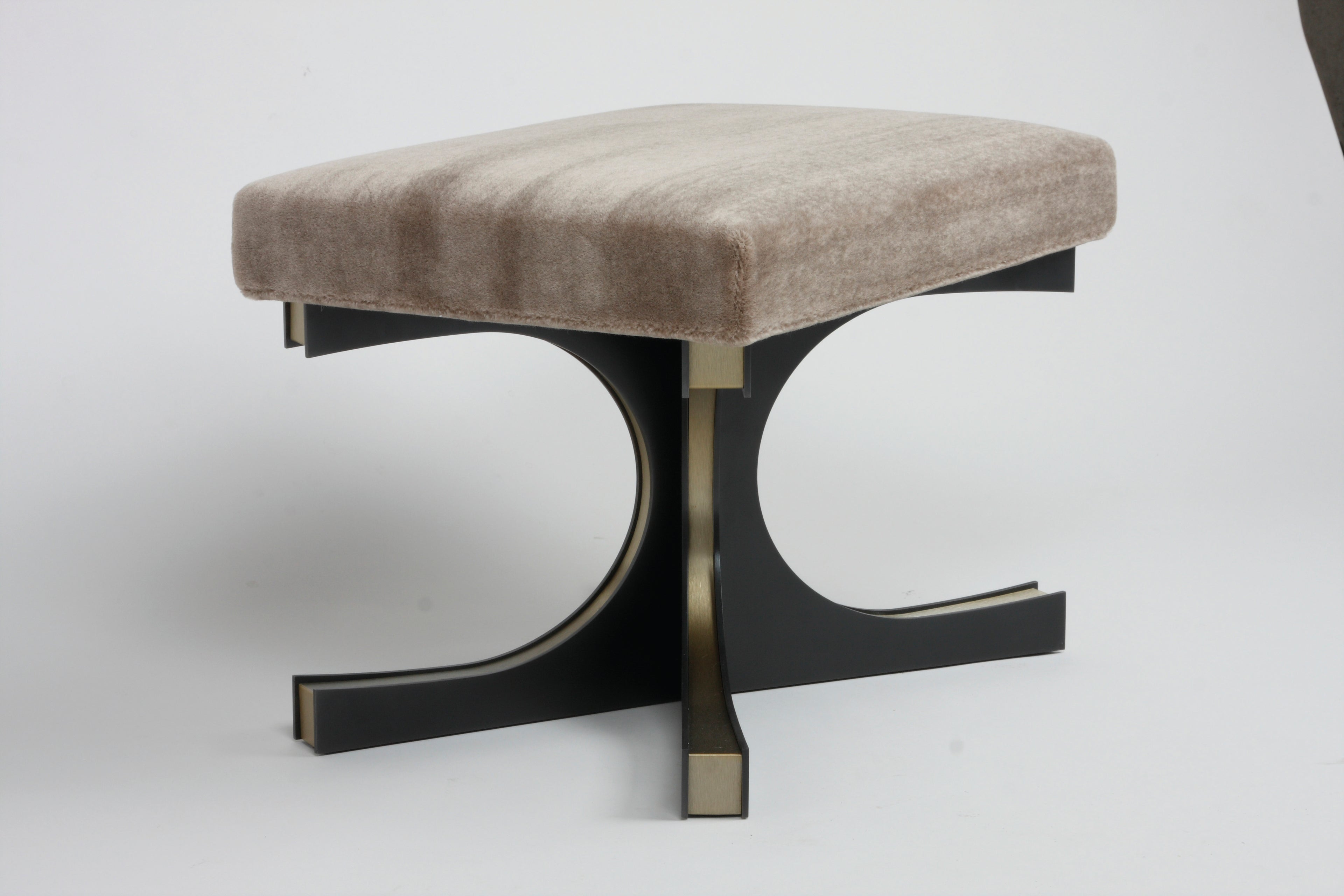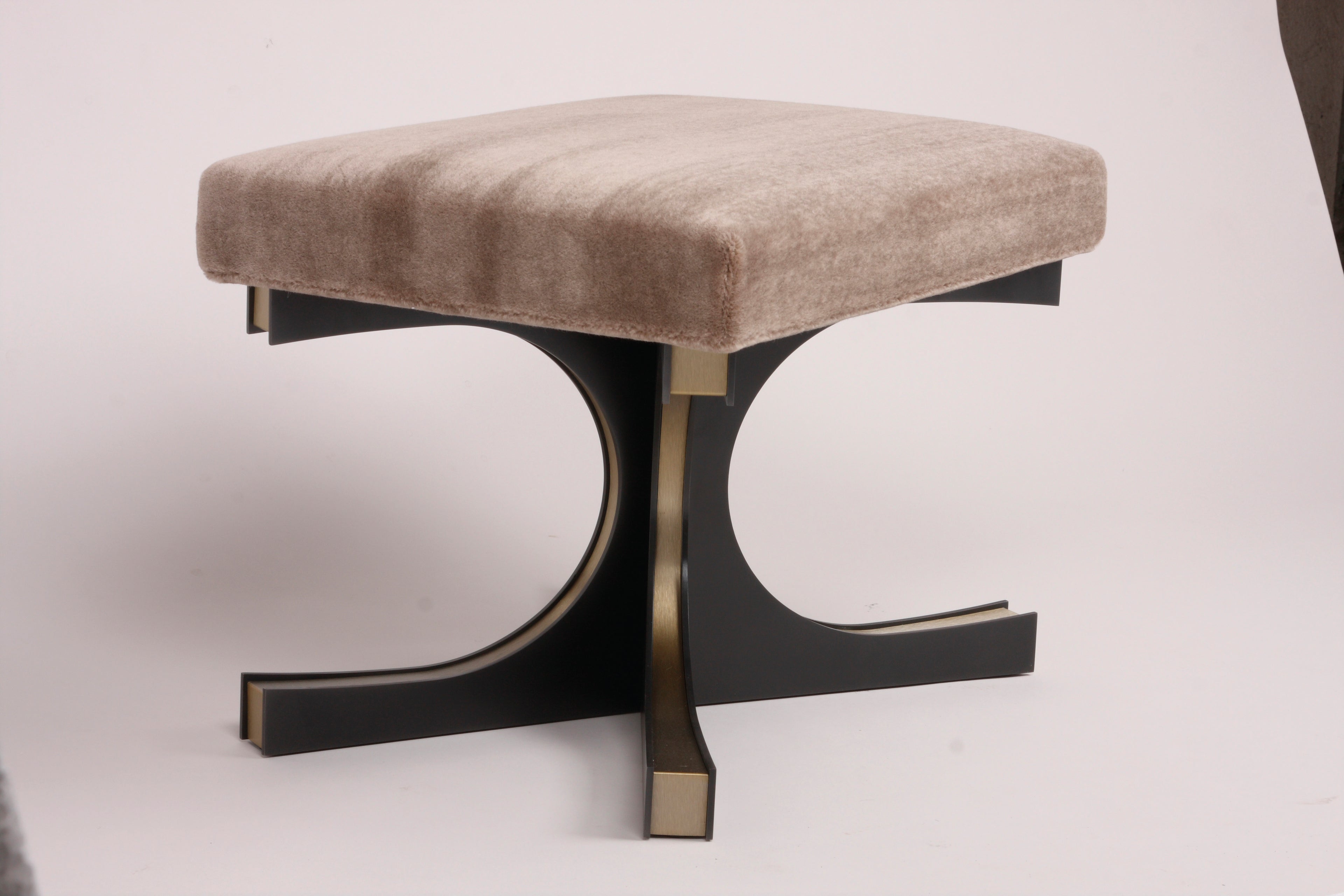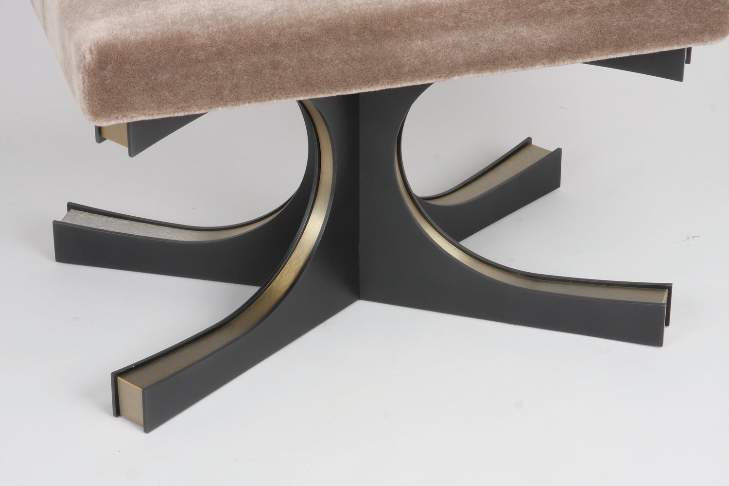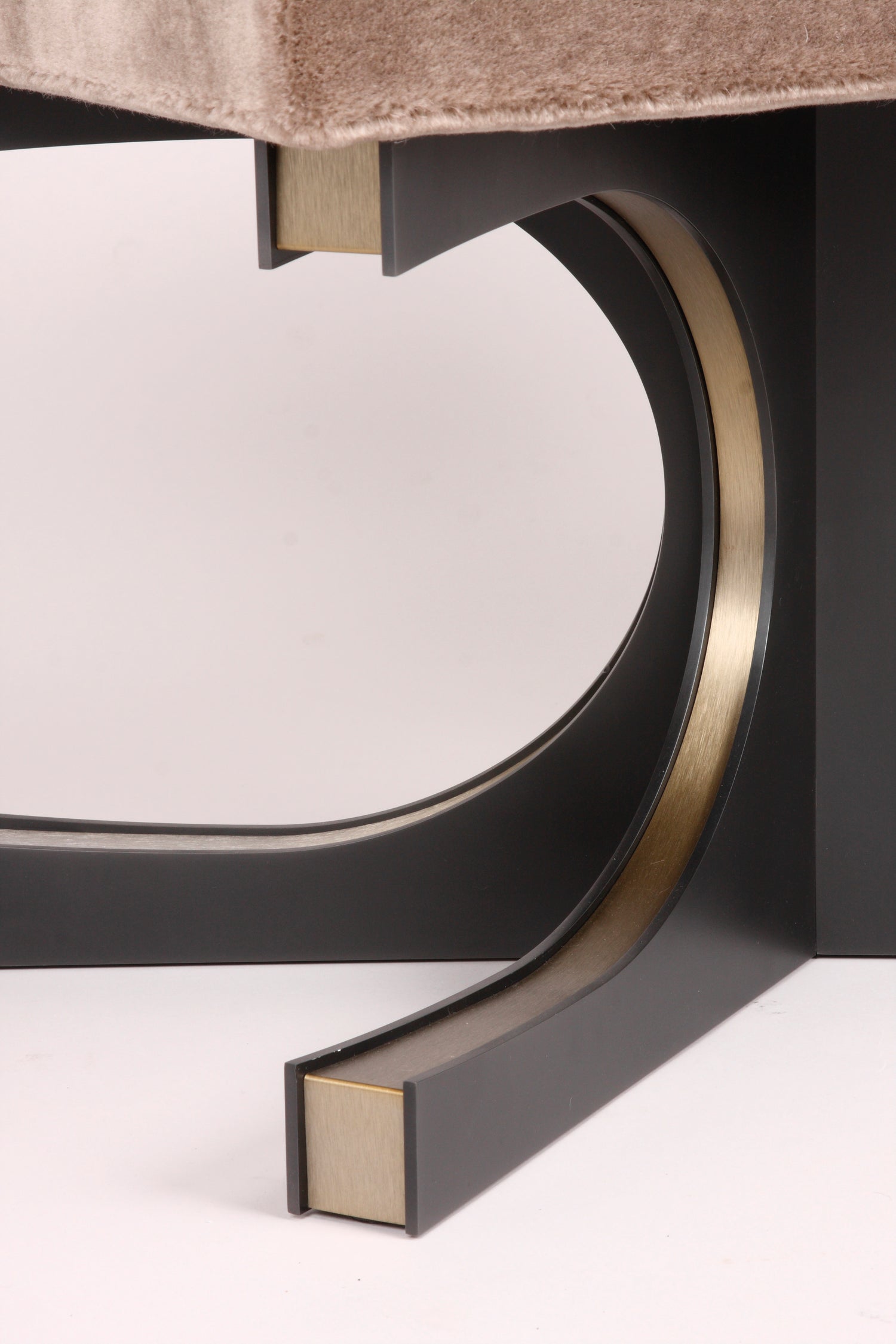 The shape and brushed gold edges of the steel base, as if clasped together, make this stool a talisman between the cross and the horseshoe