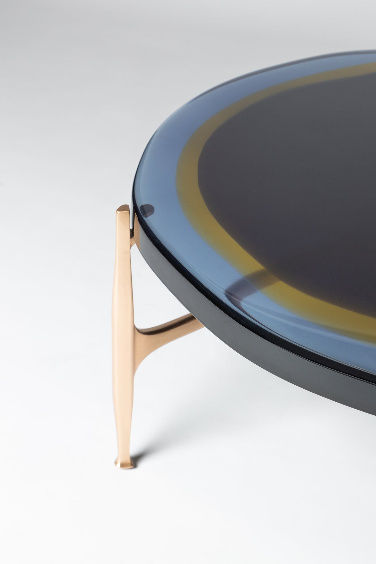 Agatha coffee table series is enlivened by an irregular circular top in transparent epoxy resin that holds a dialogue with light.