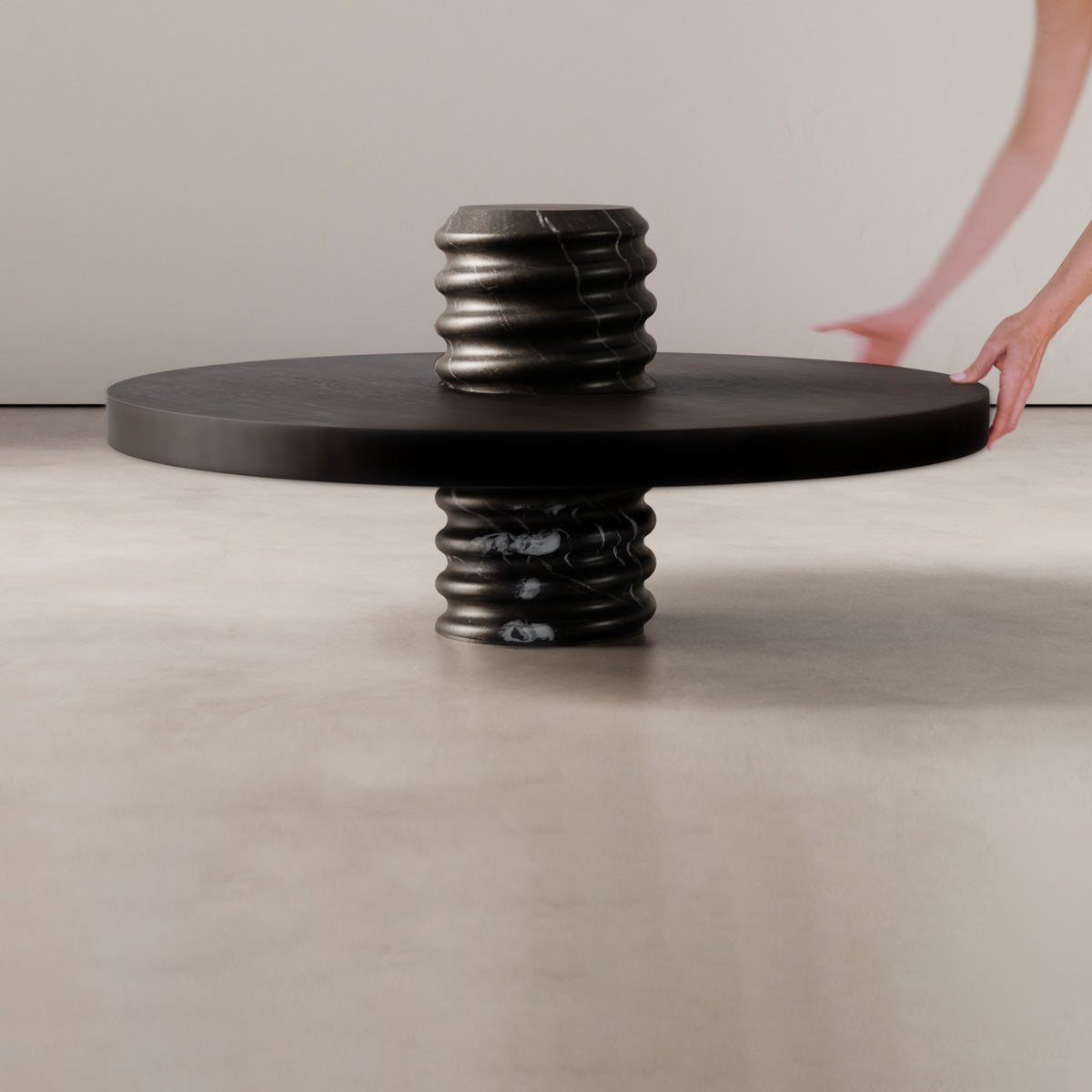 The threaded collar in the tabletop mates with the threaded base