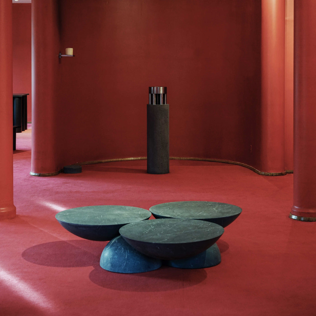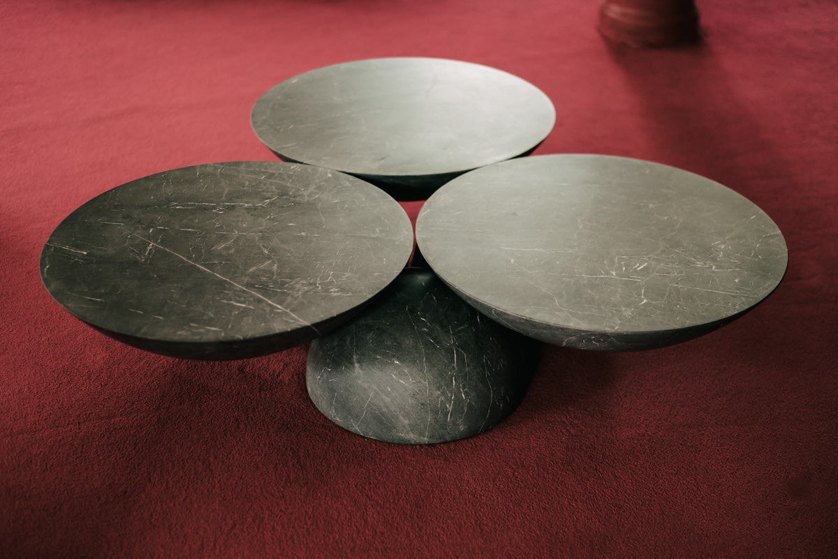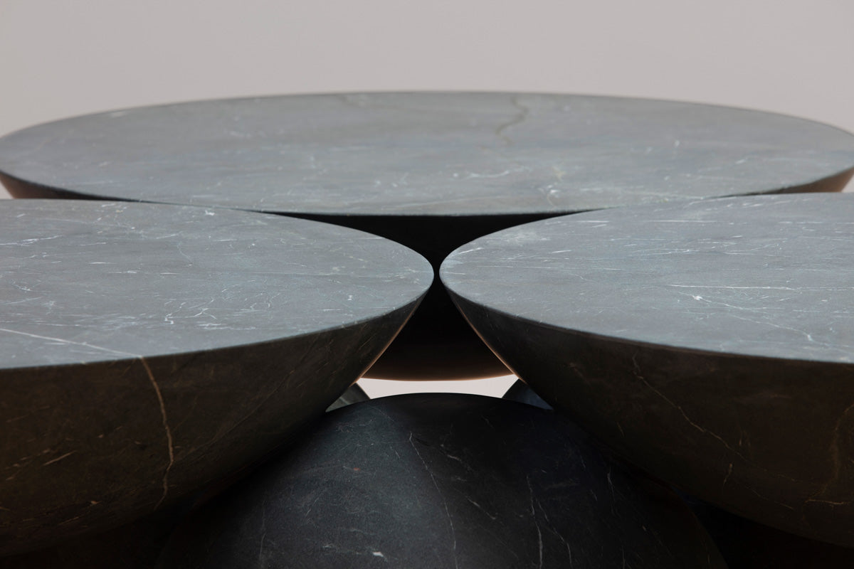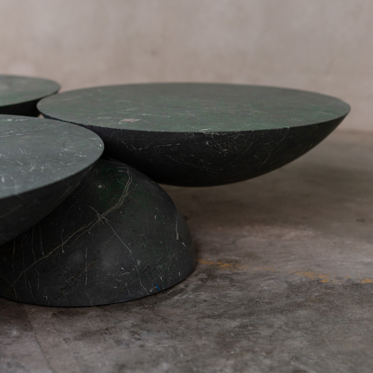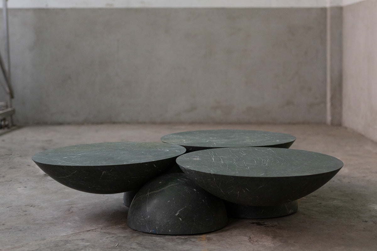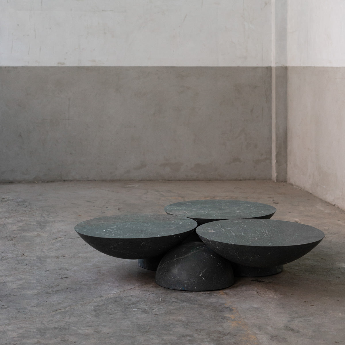The coffee table of EWE Studio is made out six half spheres, three smaller half and three large half spheres, that are assembled together