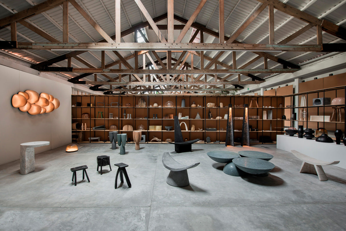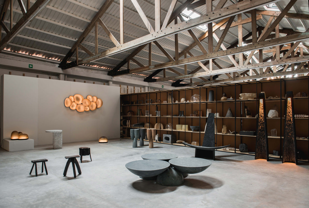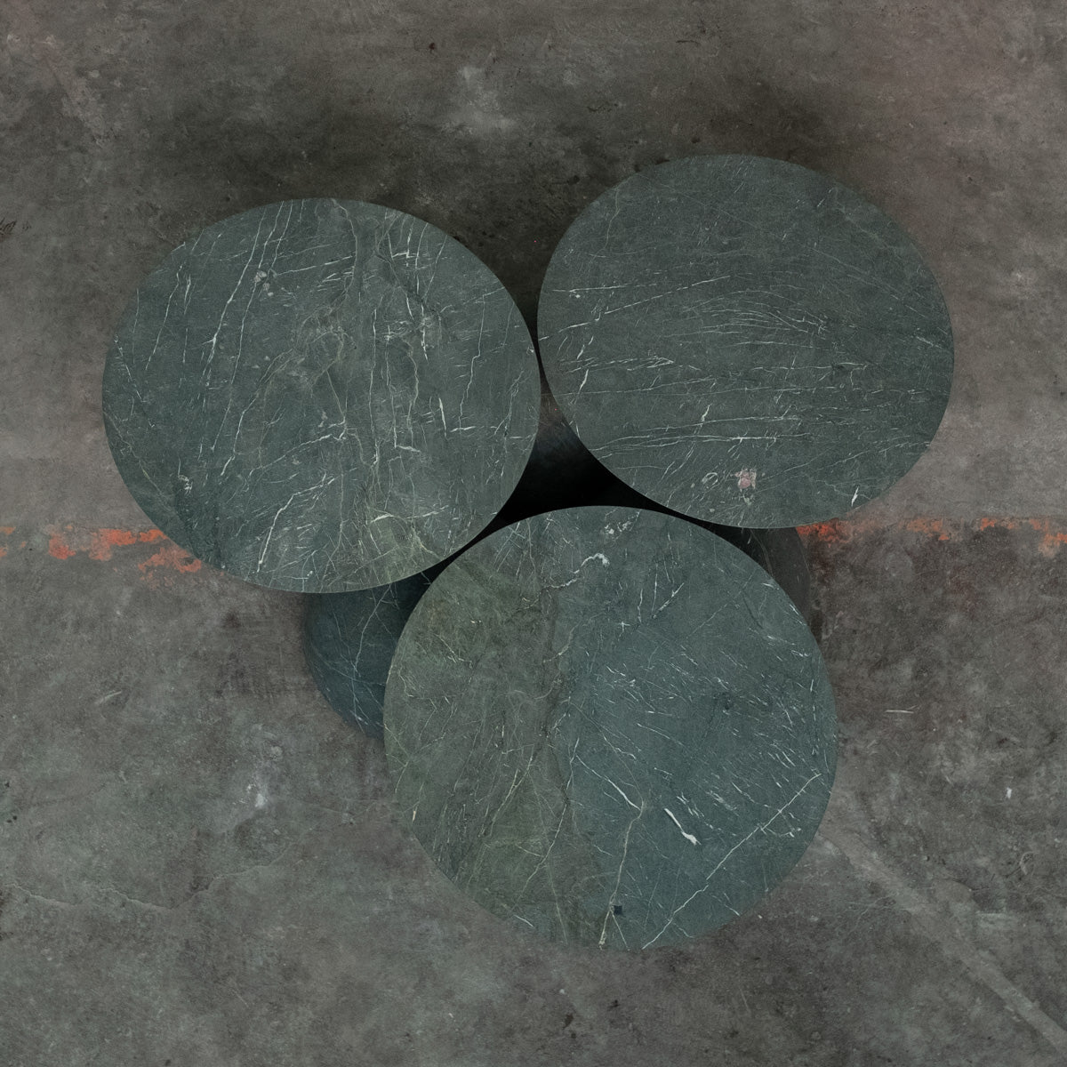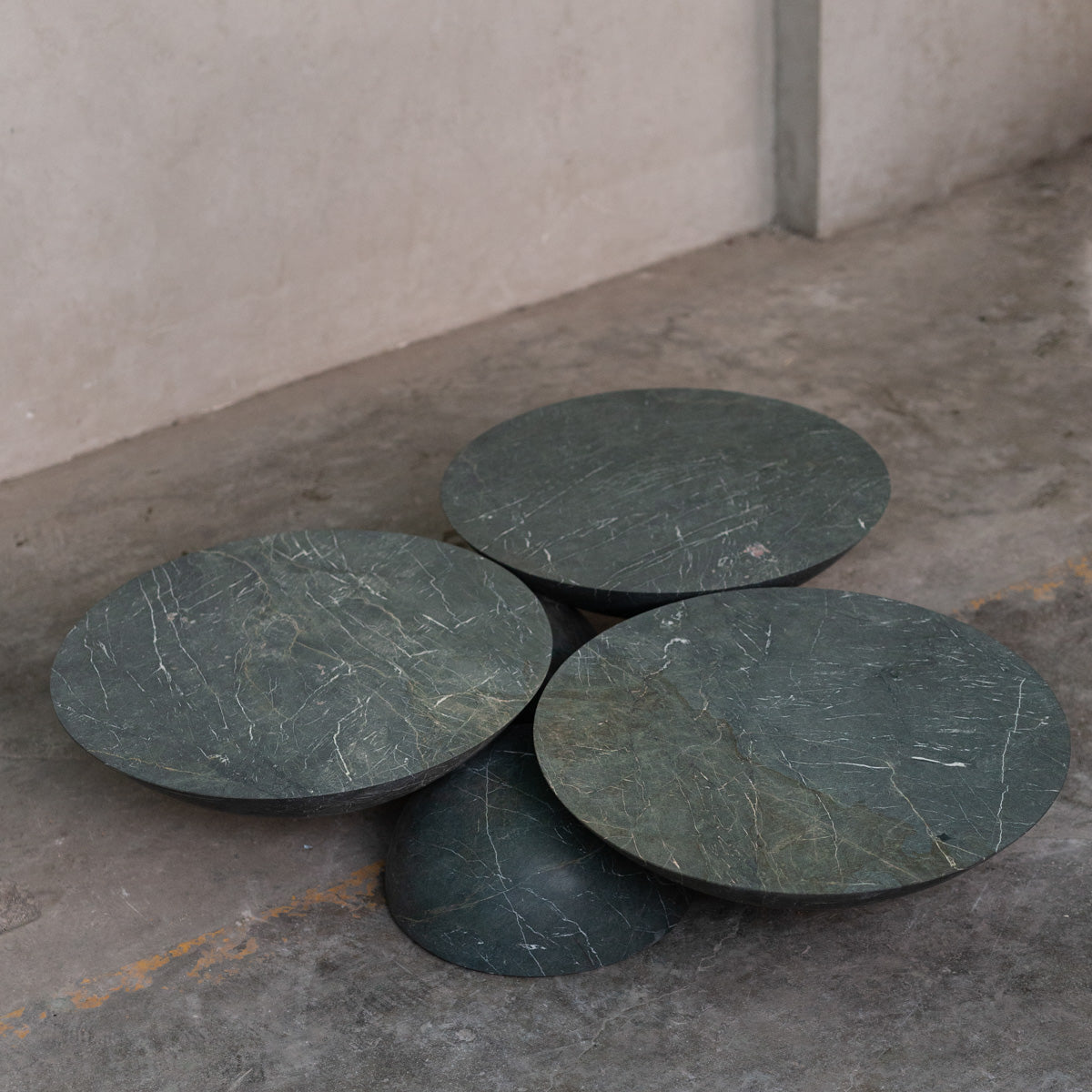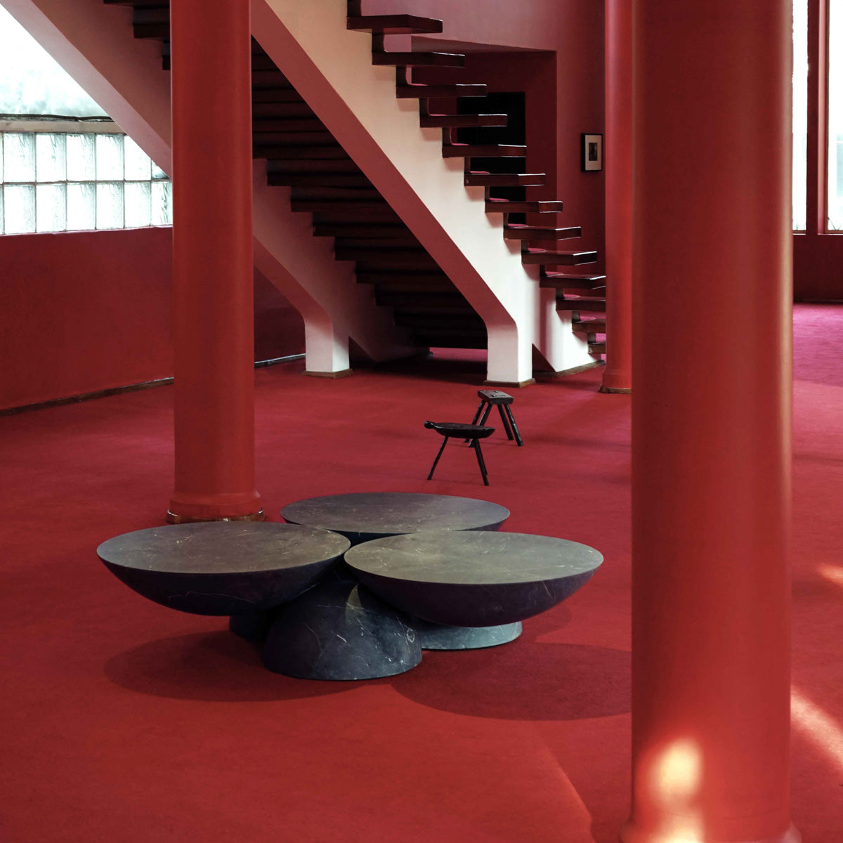 The coffee table of EWE Studio is made out six half spheres, three smaller half and three large half spheres, that are assembled together