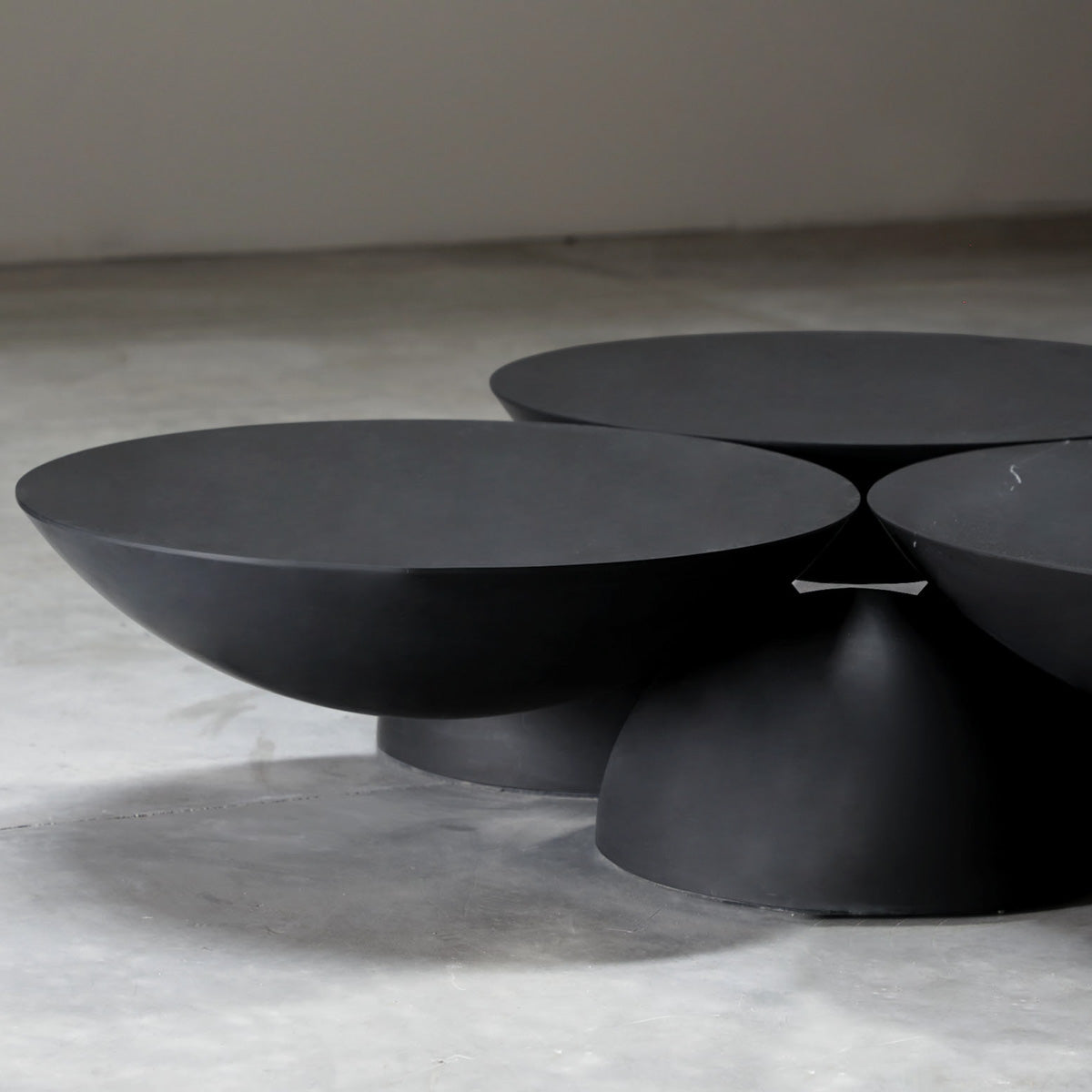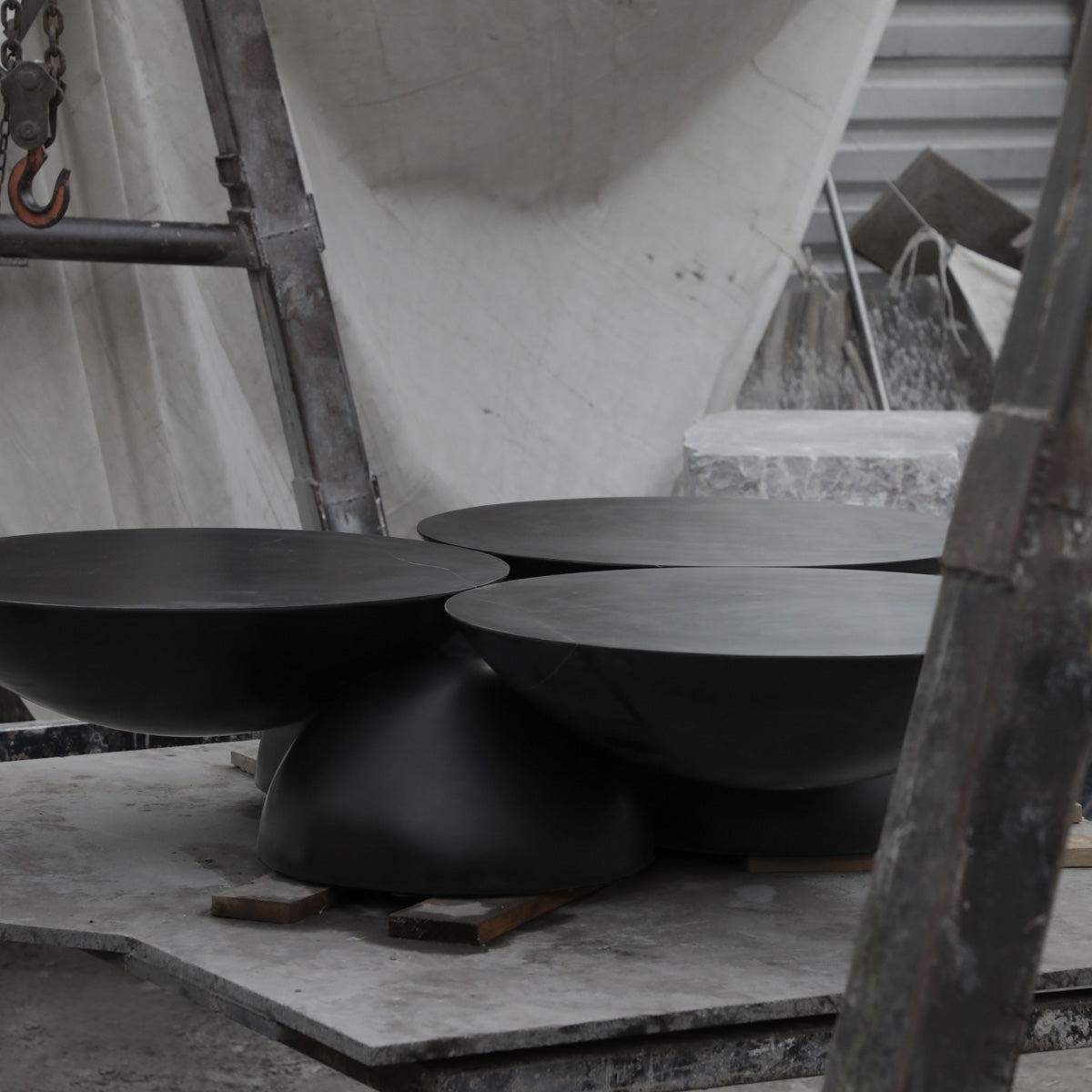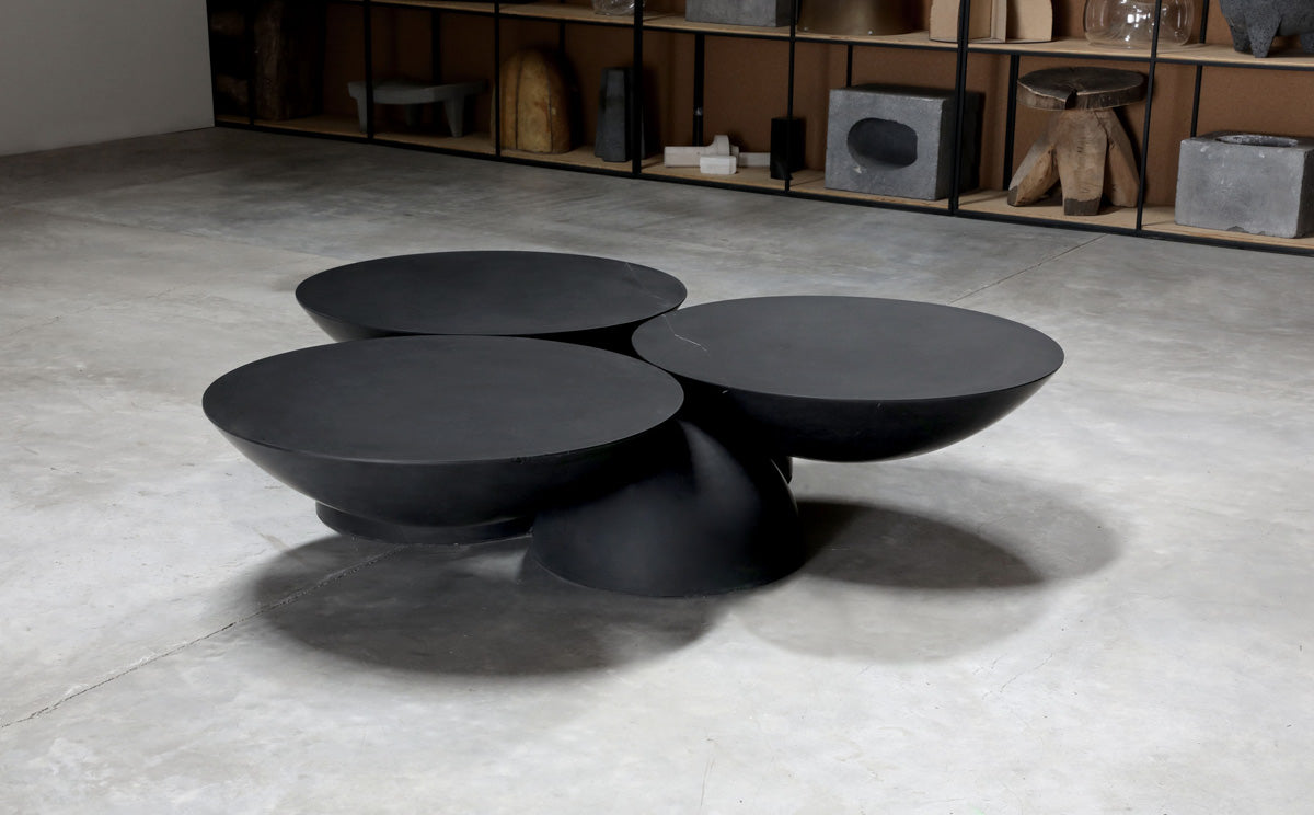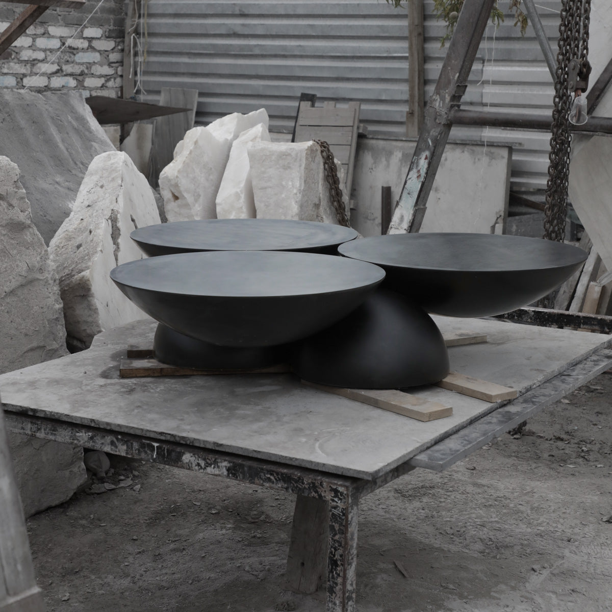The coffee table of EWE Studio is made out six half spheres, three smaller half and three large half spheres, that are assembled together