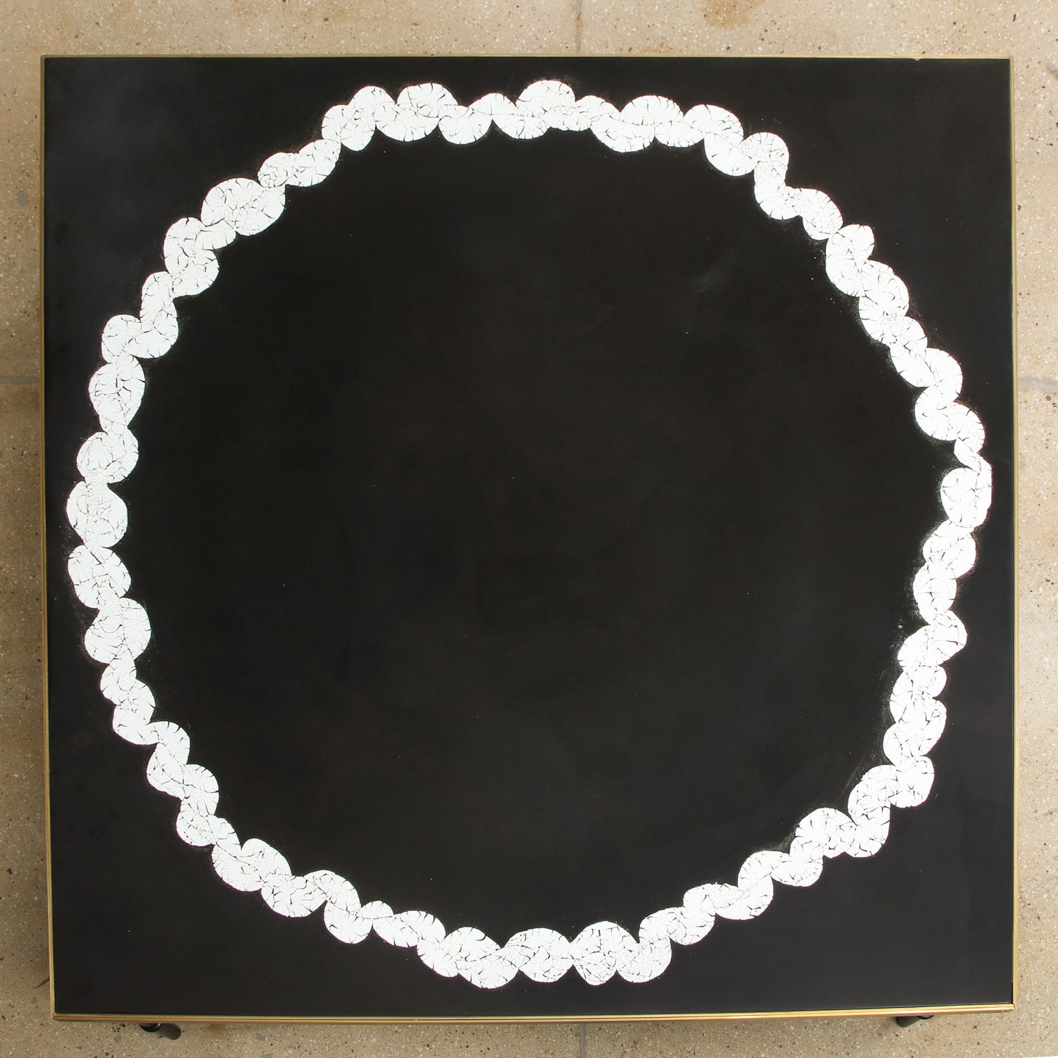Grounded by the dark smooth resin within which it is embedded, trimmed in a satin brass frame