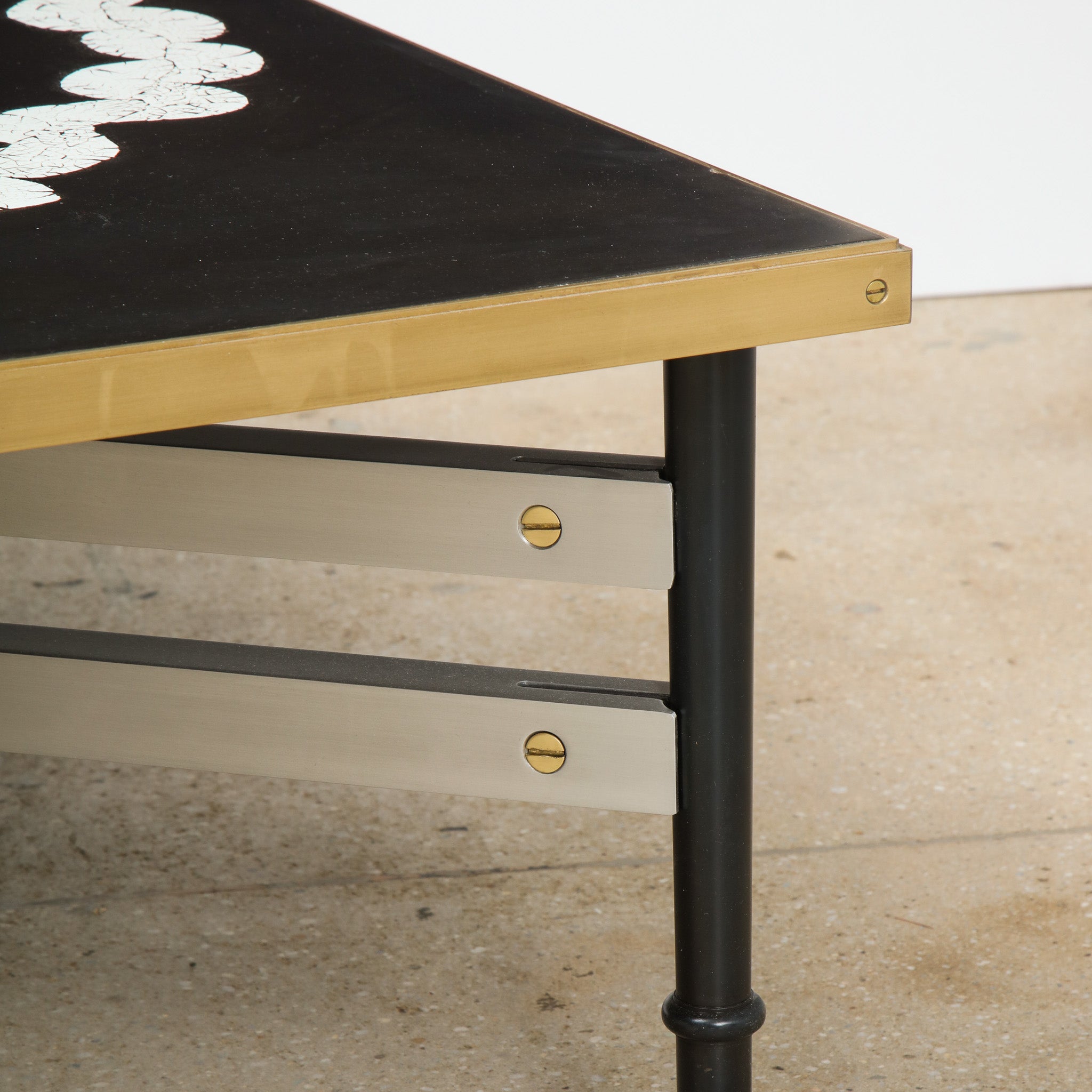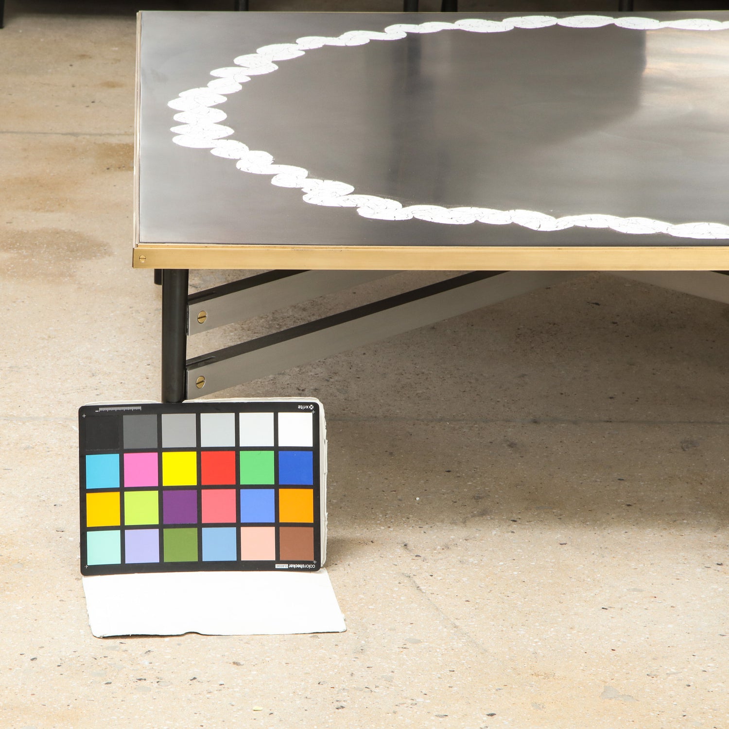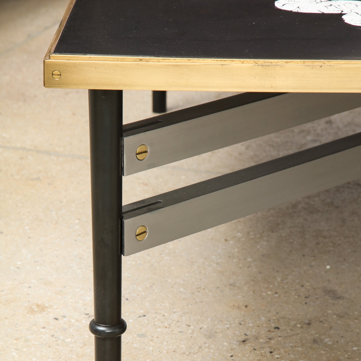 The base is mixed materials of gunmetal steel, brushed aluminum stretchers and a polished brass screw detail