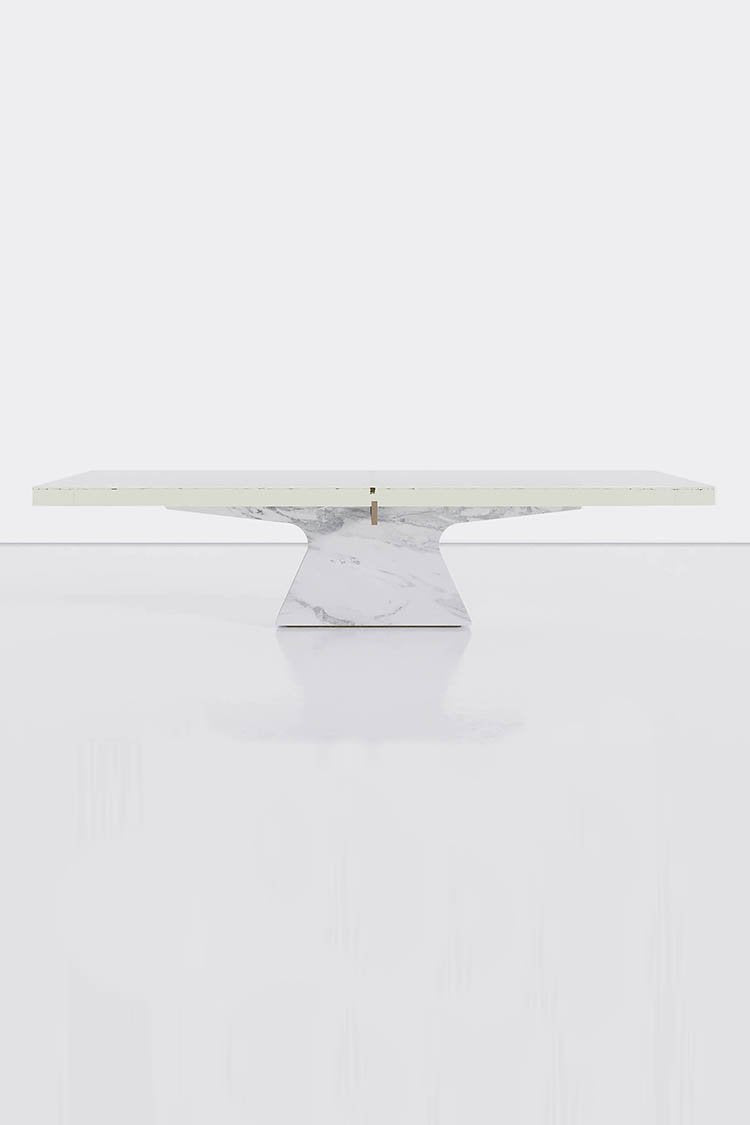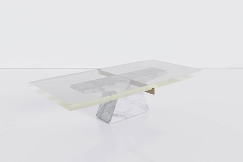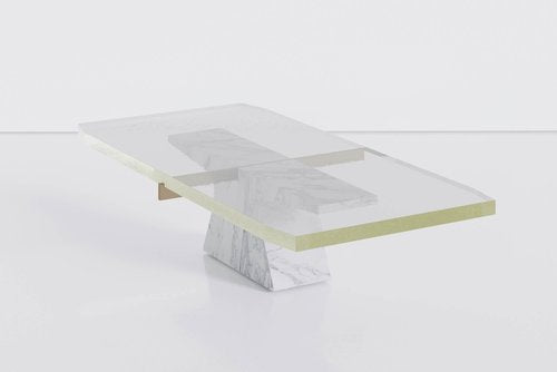 The Cumberland Coffee Table features a massively thick, quartz crown glass top carefully poised over a solid block of hewn marble