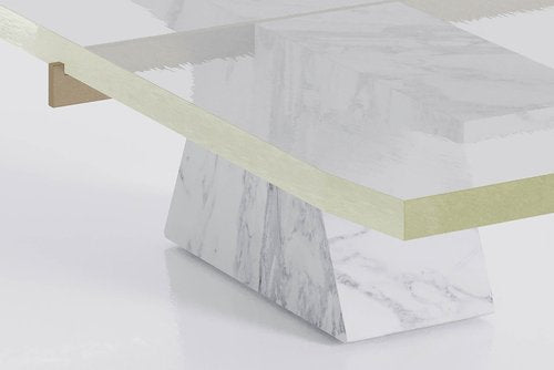 As shown - 1-5/8” thick, quartz crown glass top - Bianco carrara marble base - Brass supports