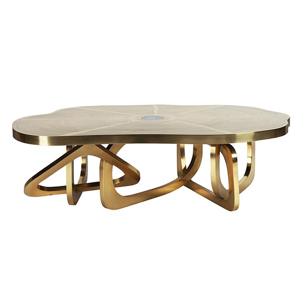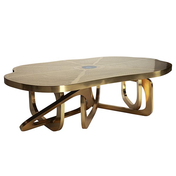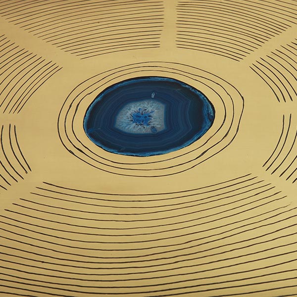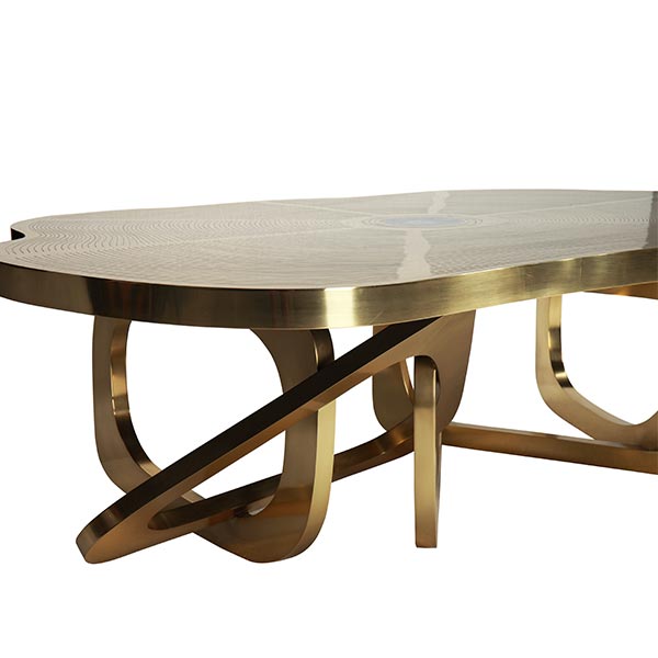 Hand-dyed in brown the luxurious table top is finished with a high gloss resin glaze that adds dimension while protecting the precious goatskin material