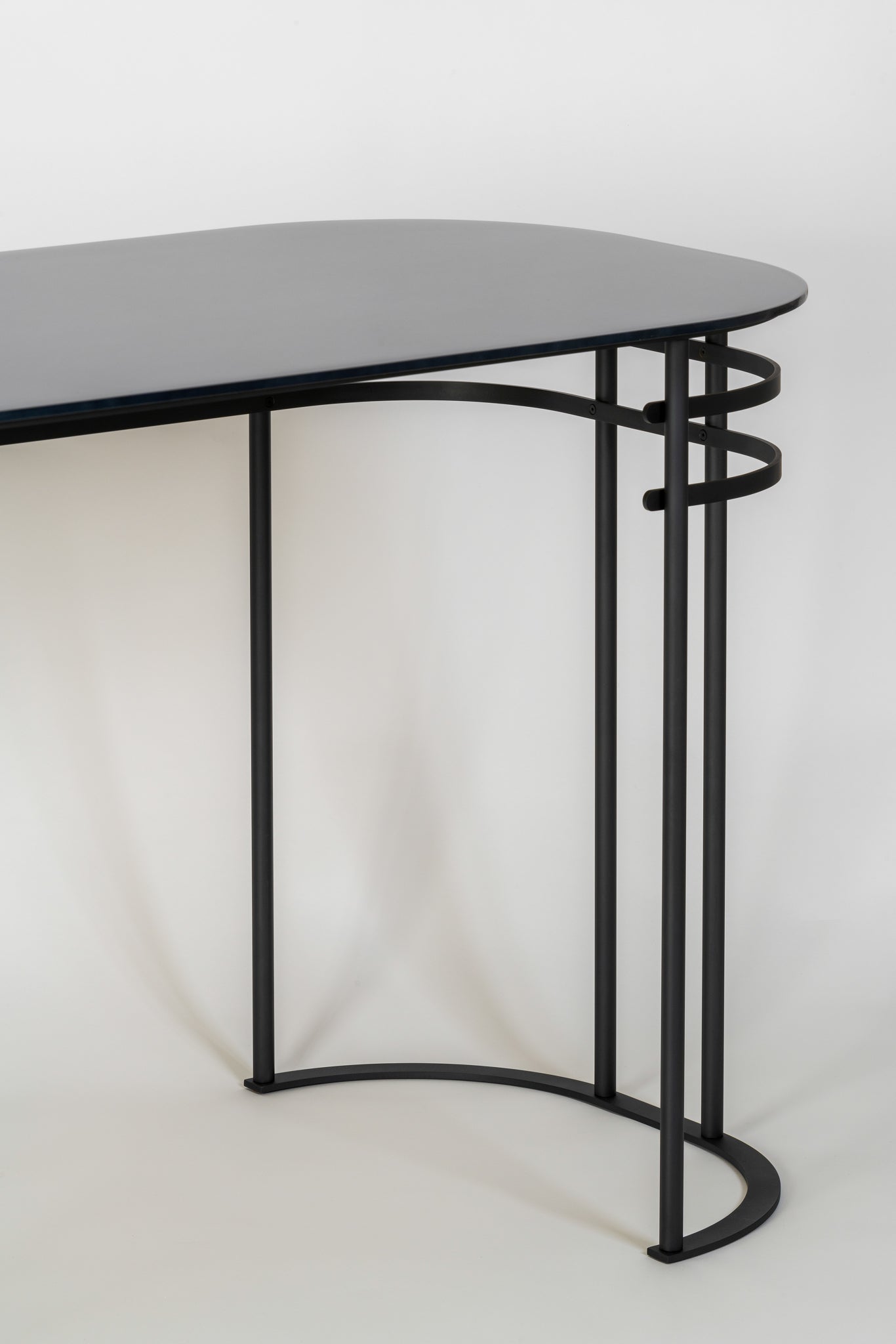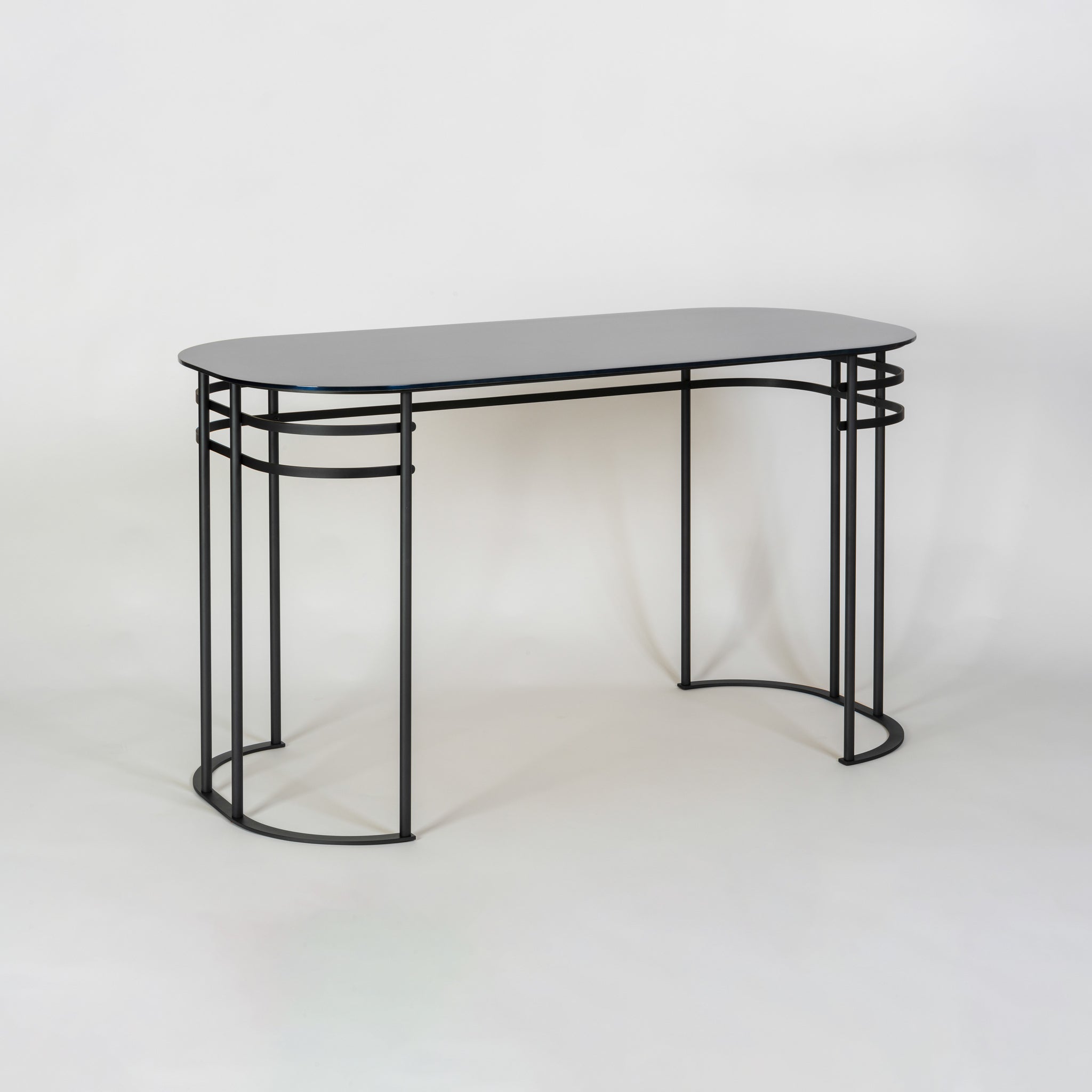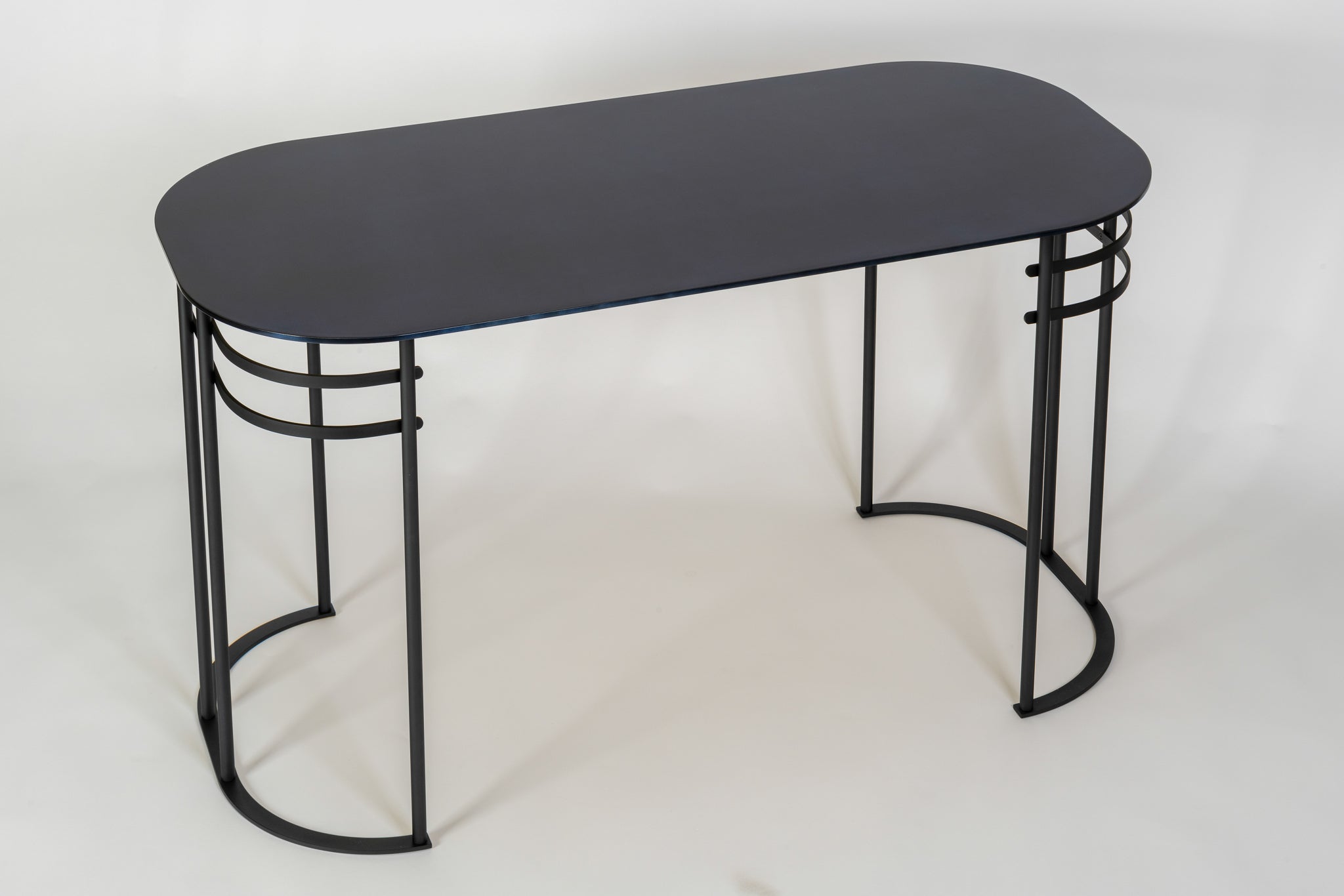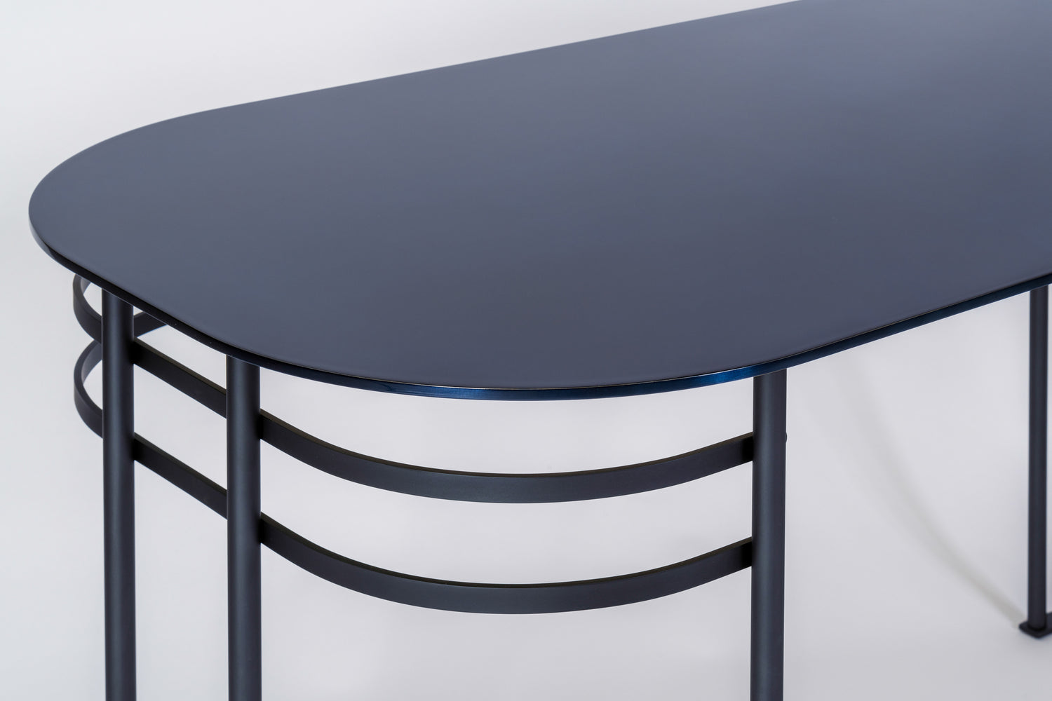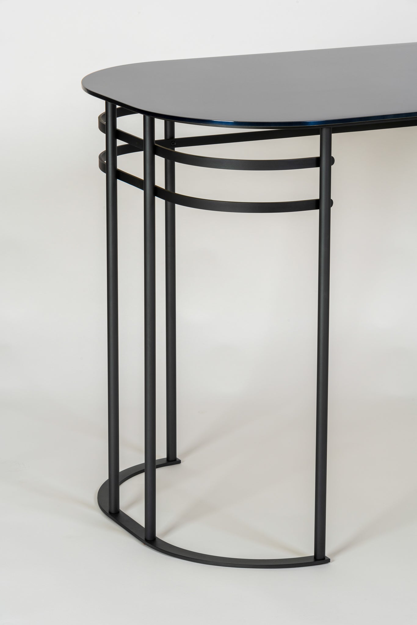 In pure continuity with the rounded Octant collection, inspired by Giotto's perfect circle, this elegant desk with its magnificent blue cross-brushed brass worktop rests on slate-finish steel legs