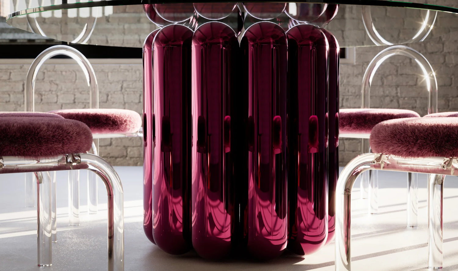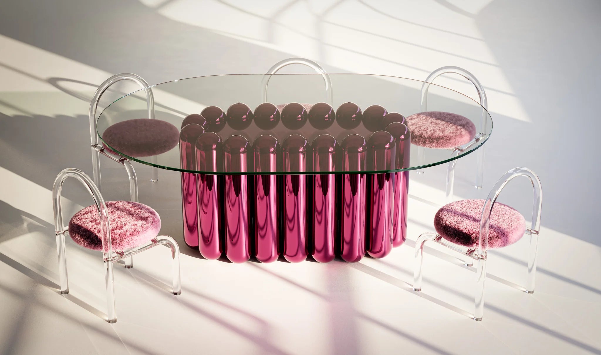 The Kupoli Dining 26 features a mesmerising body of eighteen domed steel tubes, delicately finished with a glass top.