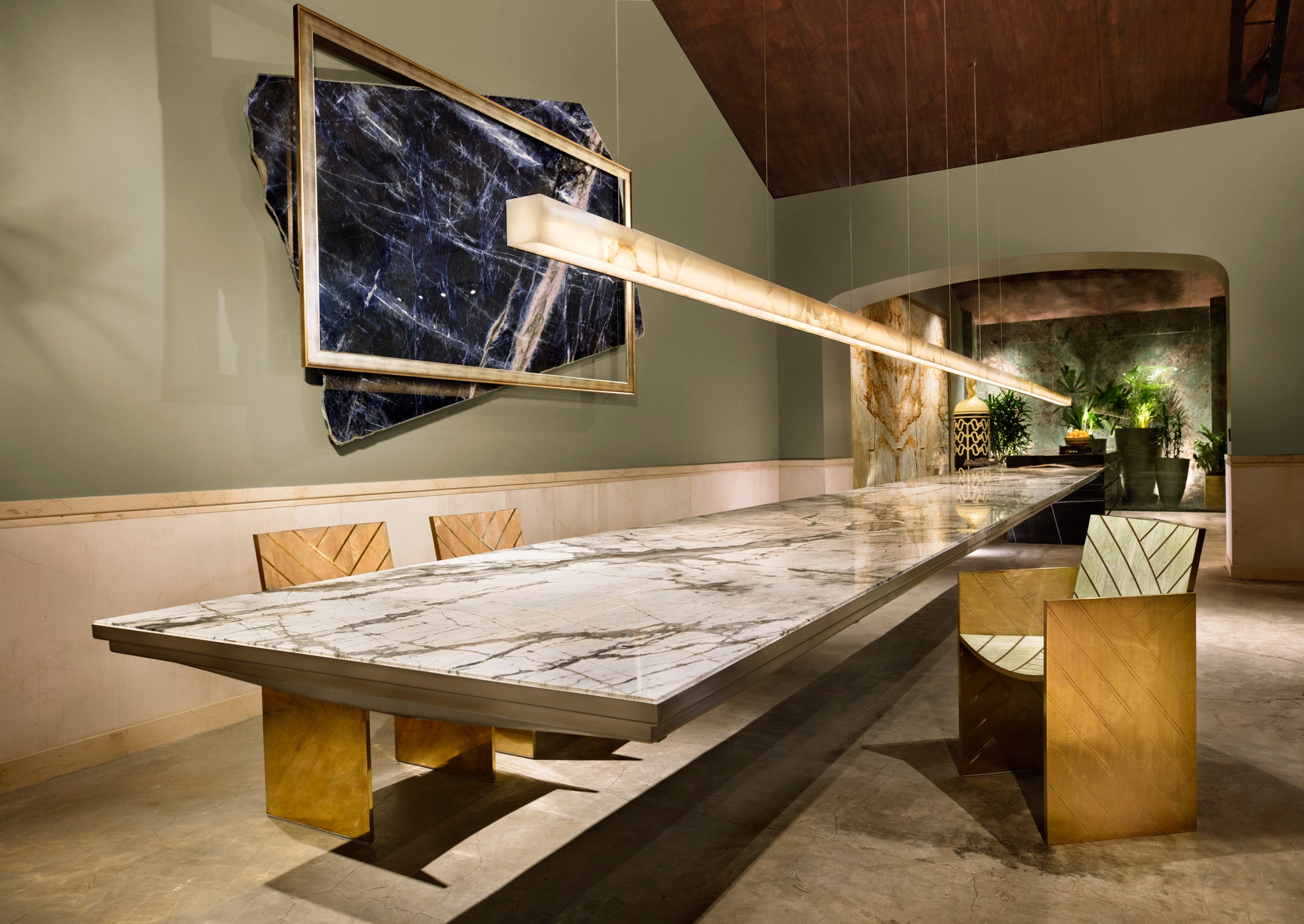 Nesso Dining Chair Beige is a beautiful chair in pearly resin with geometric brass inlay. It can be matched well with the Nesso Dining Table.