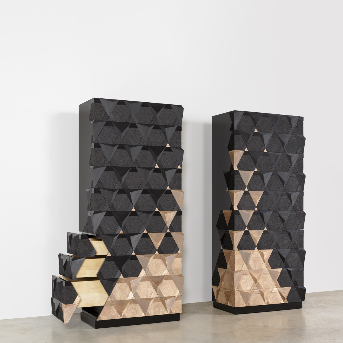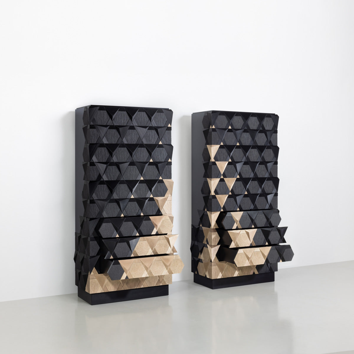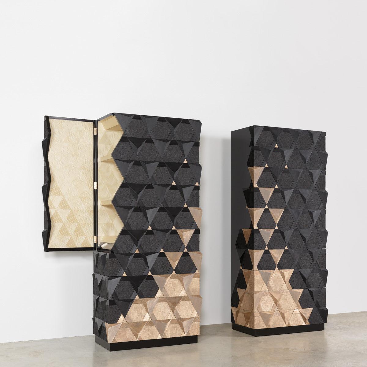 Inspired by the graphic design of a concrete wall of a building photographed in New York, these cabinets with unique geometric motifs are a creation imagined after Jean-Luc Le Mounier’s first trip to the United States