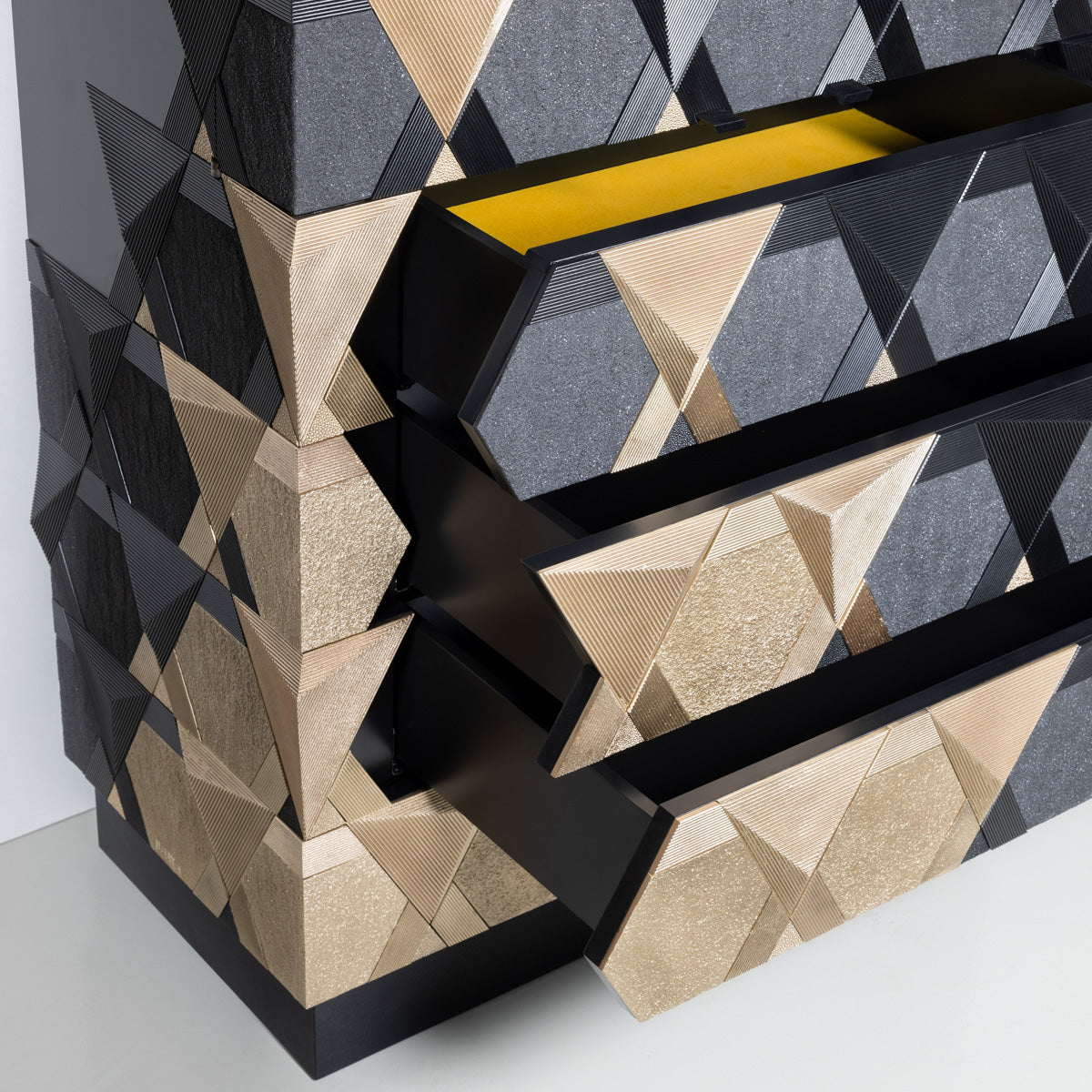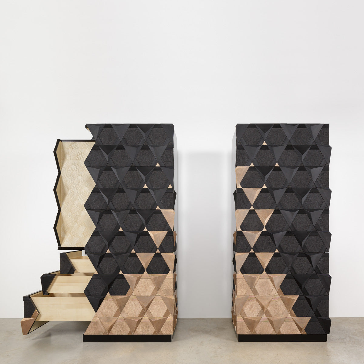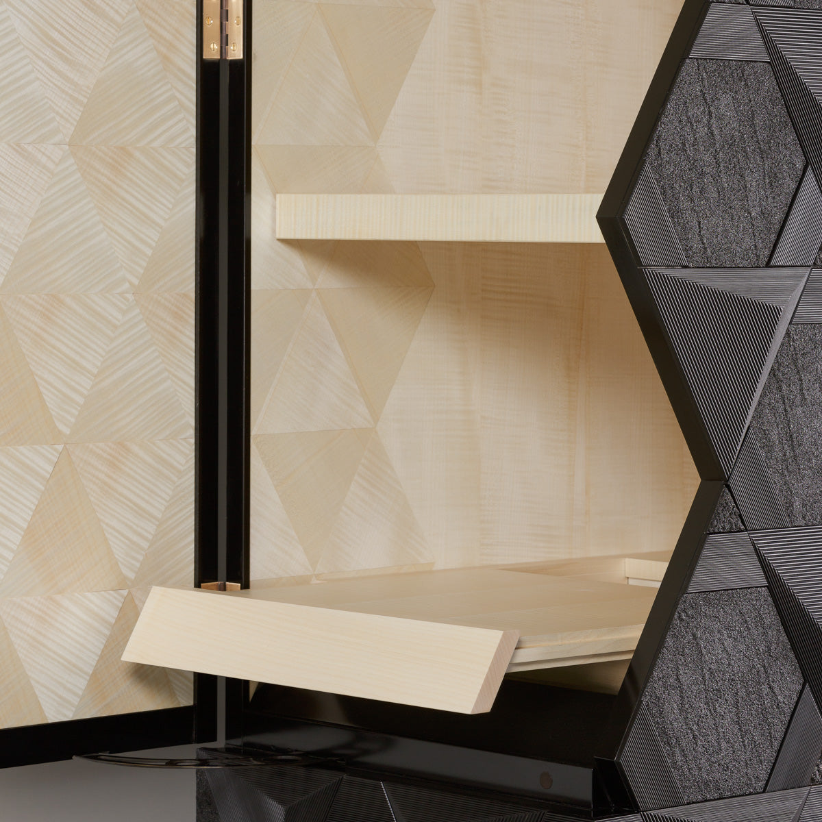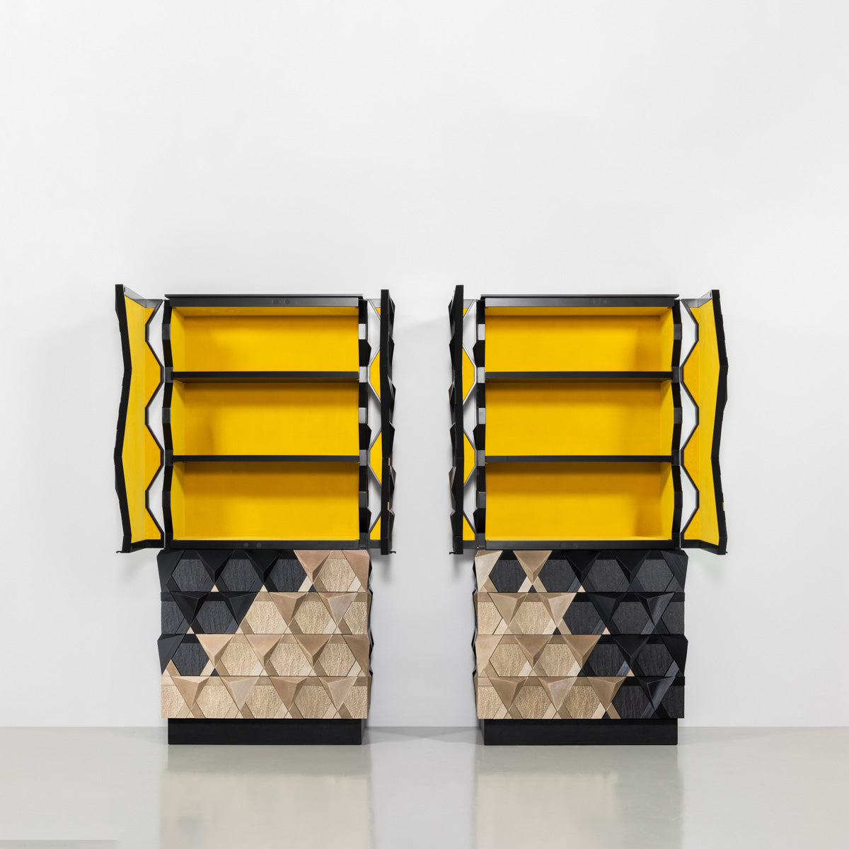 Inspired by the graphic design of a concrete wall of a building photographed in New York, these cabinets with unique geometric motifs are a creation imagined after Jean-Luc Le Mounier’s first trip to the United States