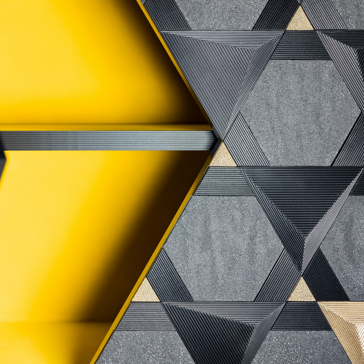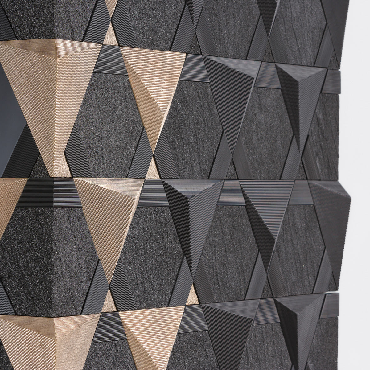 The building’s powerful graphics have led the artist to combine several materials, including the most unique, black sand