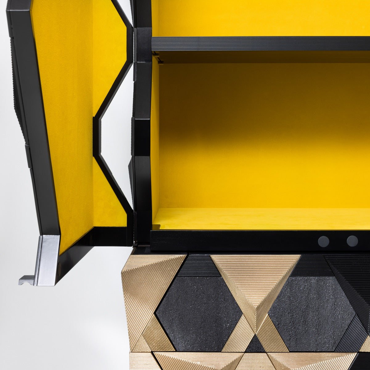 These two monolitic blocks open delicately to reveal an interior finely lined with sunny yellow leather, giving access to different storage, custom configurations by commission only, please enquire with our gallery
