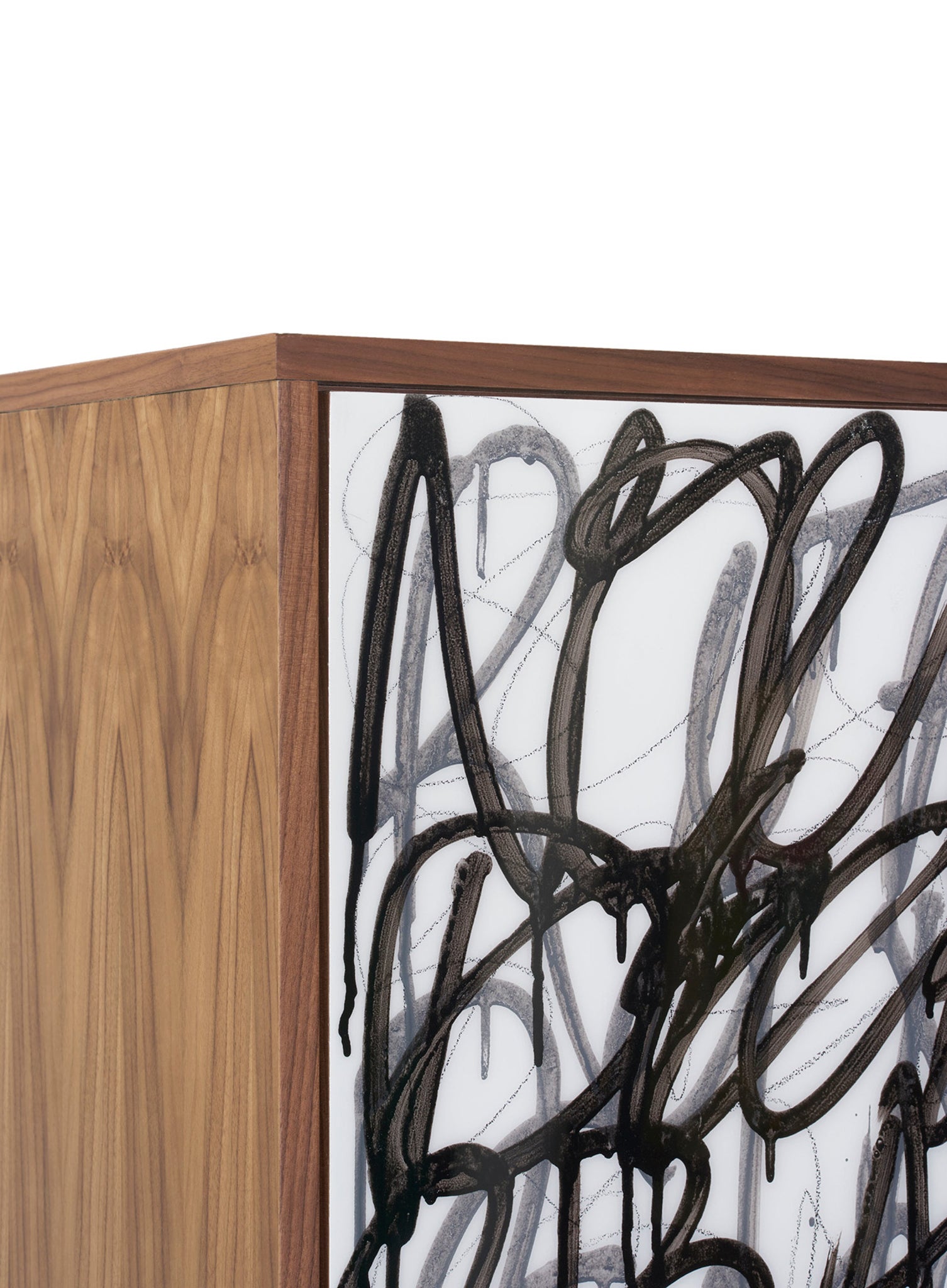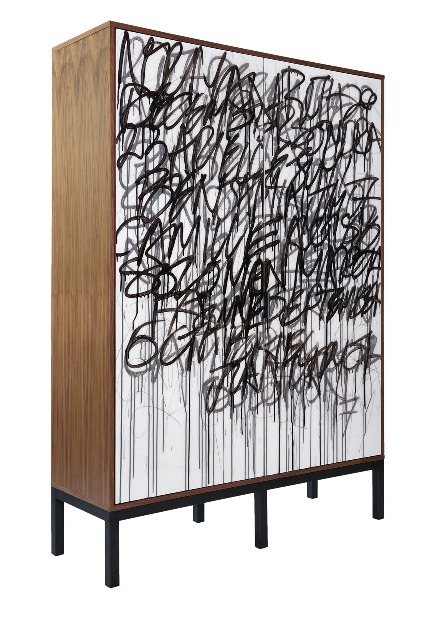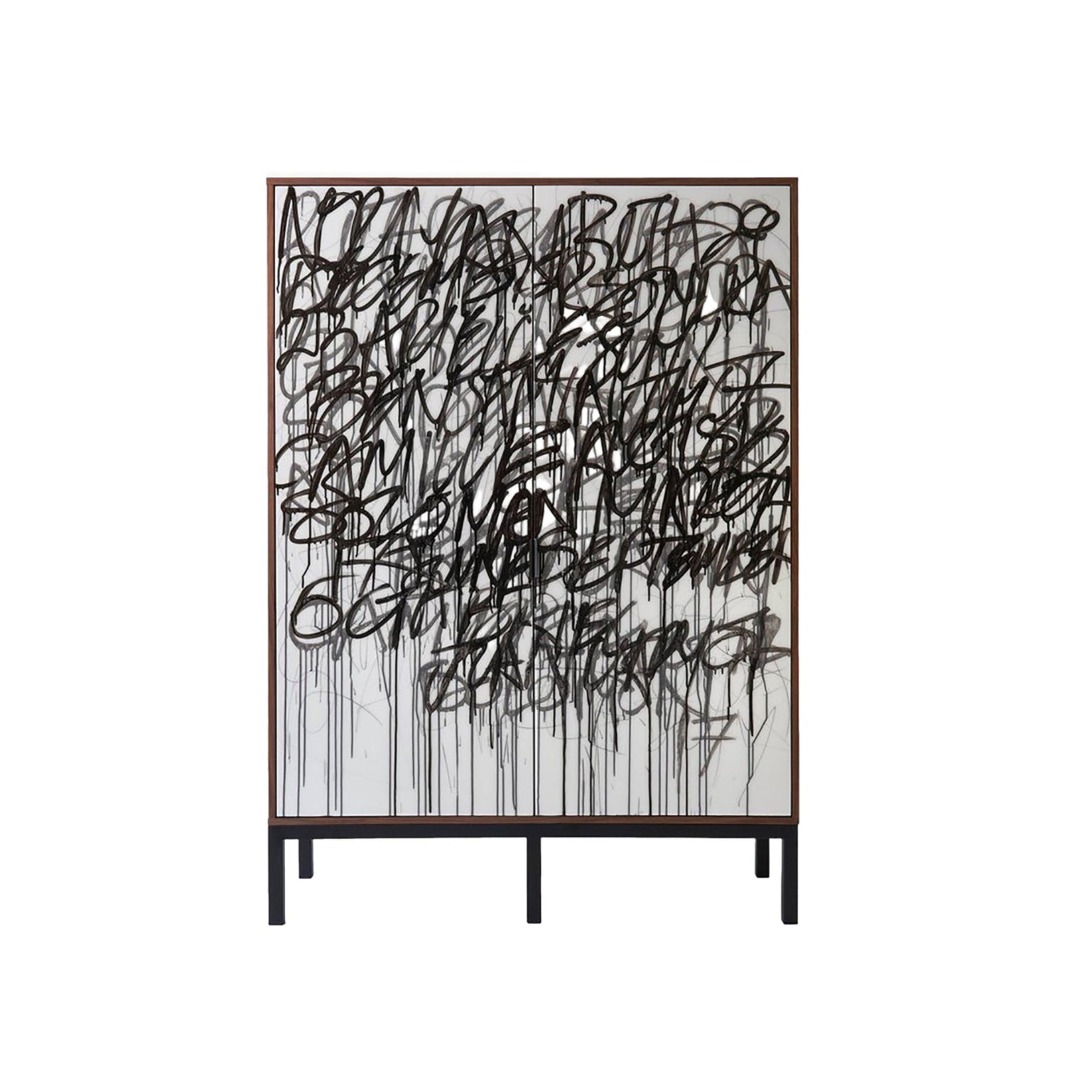 The armoire is created using graphic, calligraphy inspired, graffiti artwork. The artwork is a form of visual communication, texted base artwork. The artist has developed his own style of graffiti, by using overlapping letters, highlights, shadows, variety in line weights and paint drips.