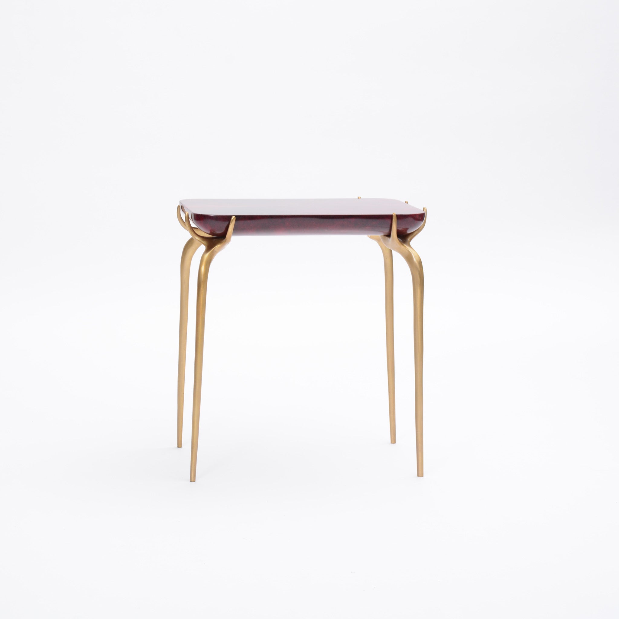Inspired by jewelry designs. Inverted cabochon gem-shaped top available finished in burnt wood, gold leaf, goatskin parchment, or stingray shagreen