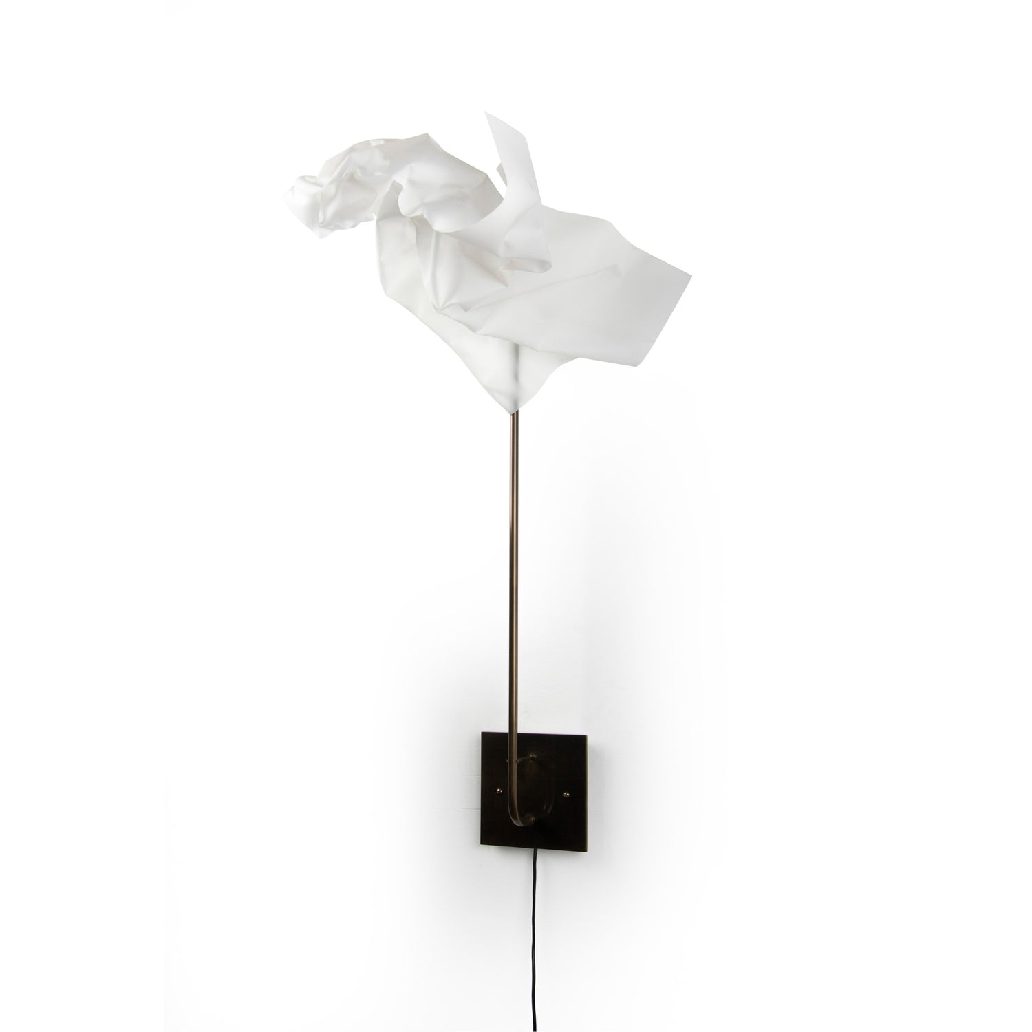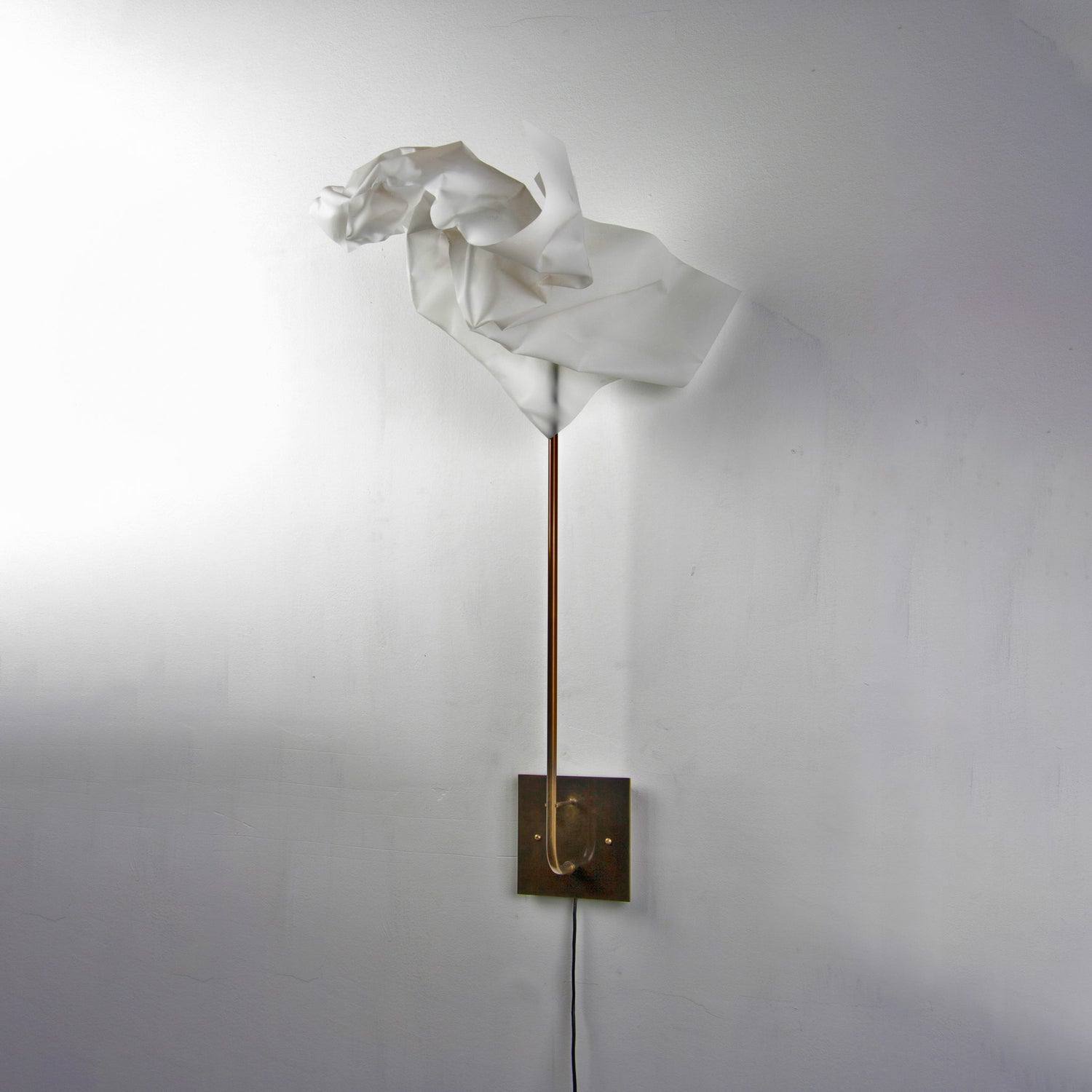 Made of brass and a special plastic, the Paper Wall Sconce is available in either darkened brass or polished tarnished brass finishes