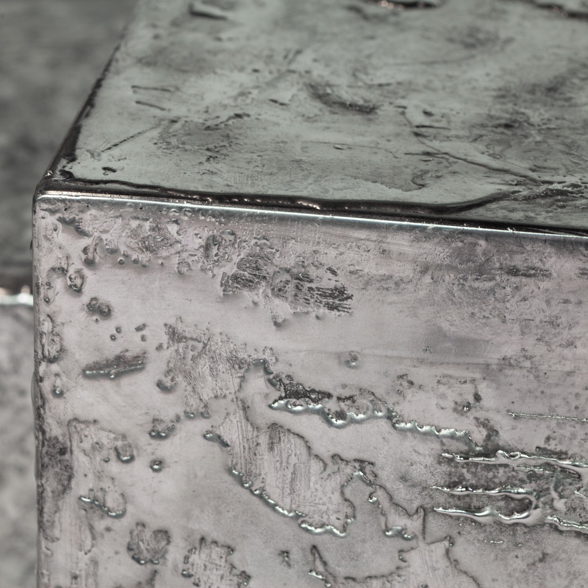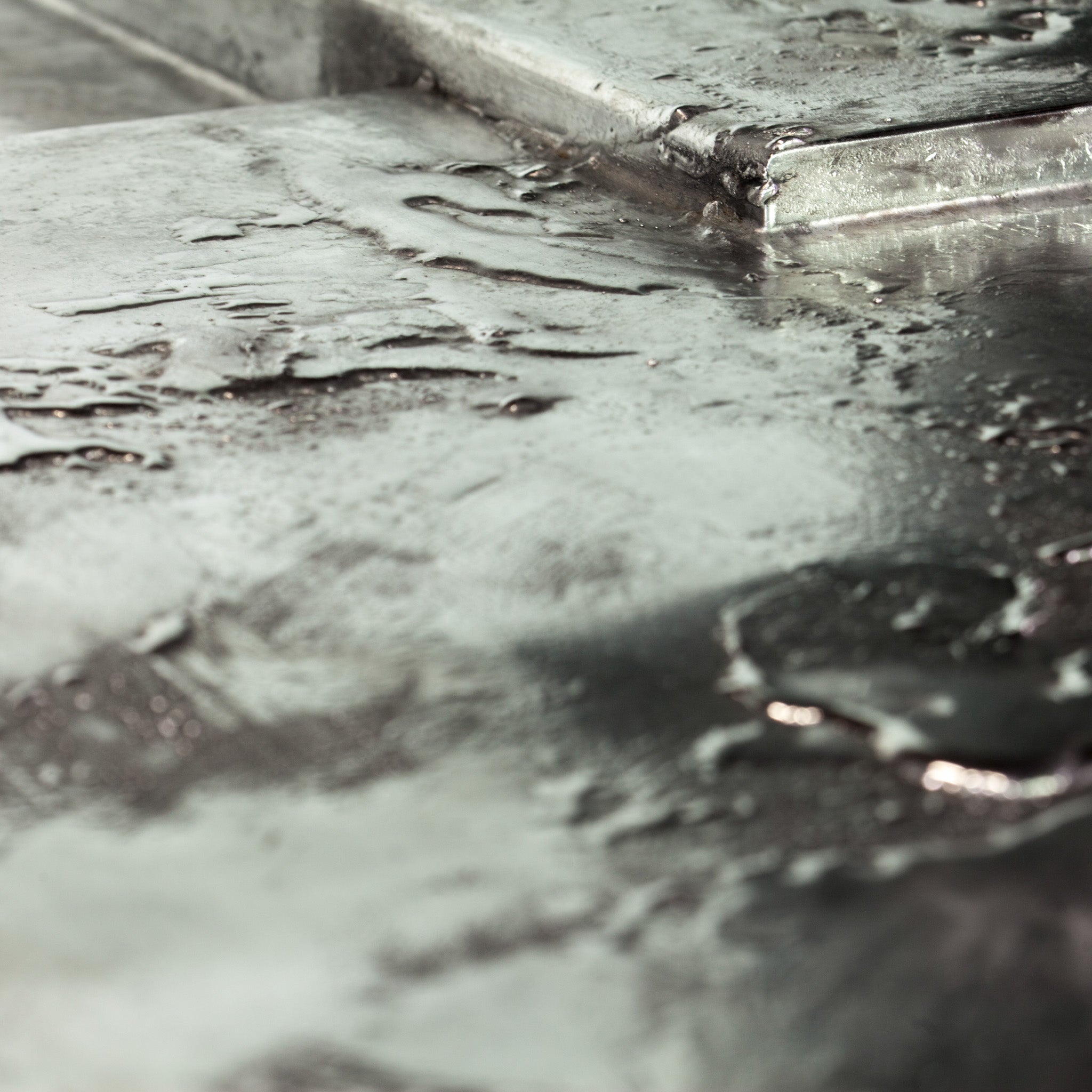 One crucible at a time, pewter is melted into liquid form and hand coated onto the steel structure, creating the other-worldly surface that makes each handcrafted pewter table unique