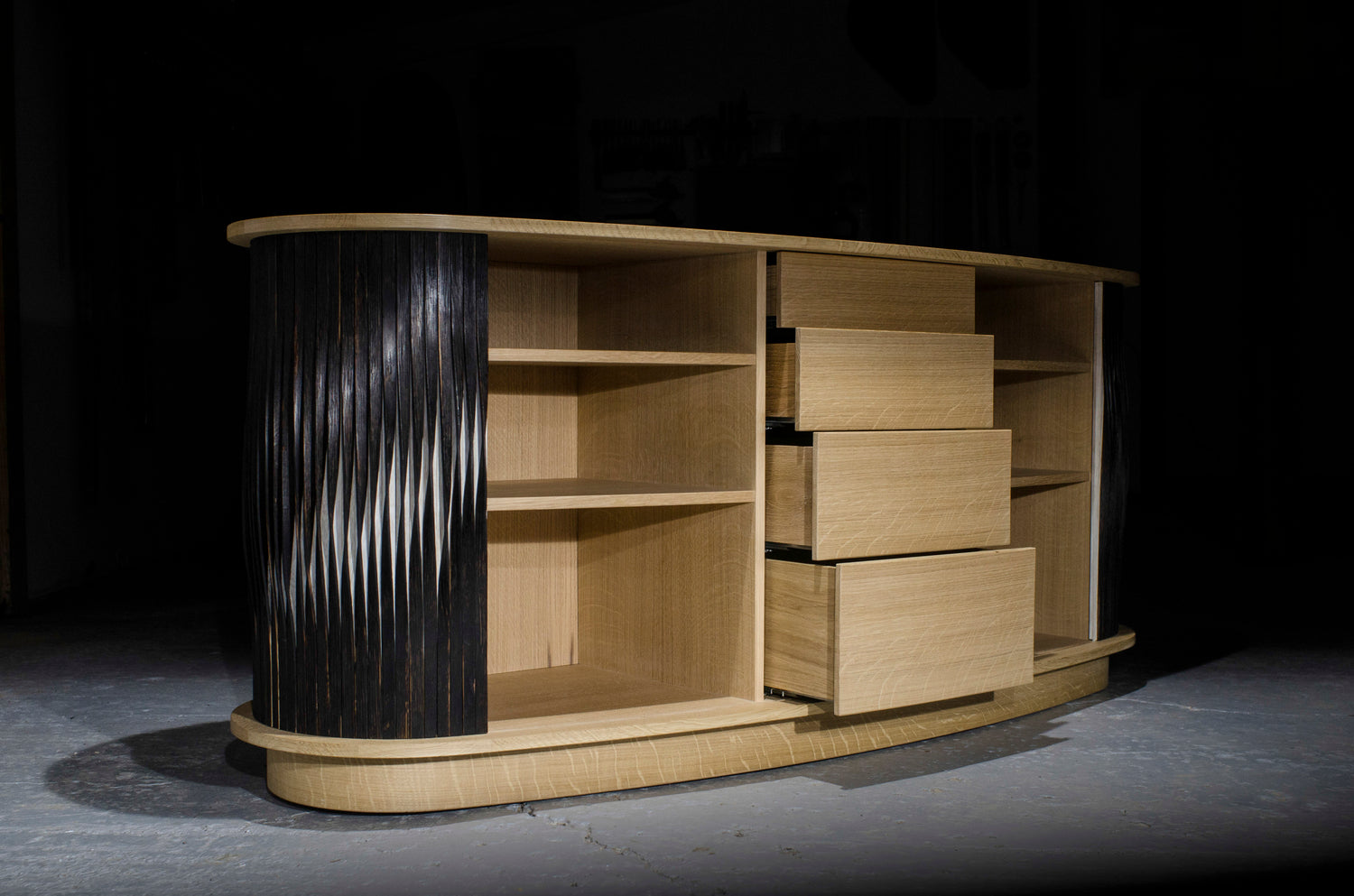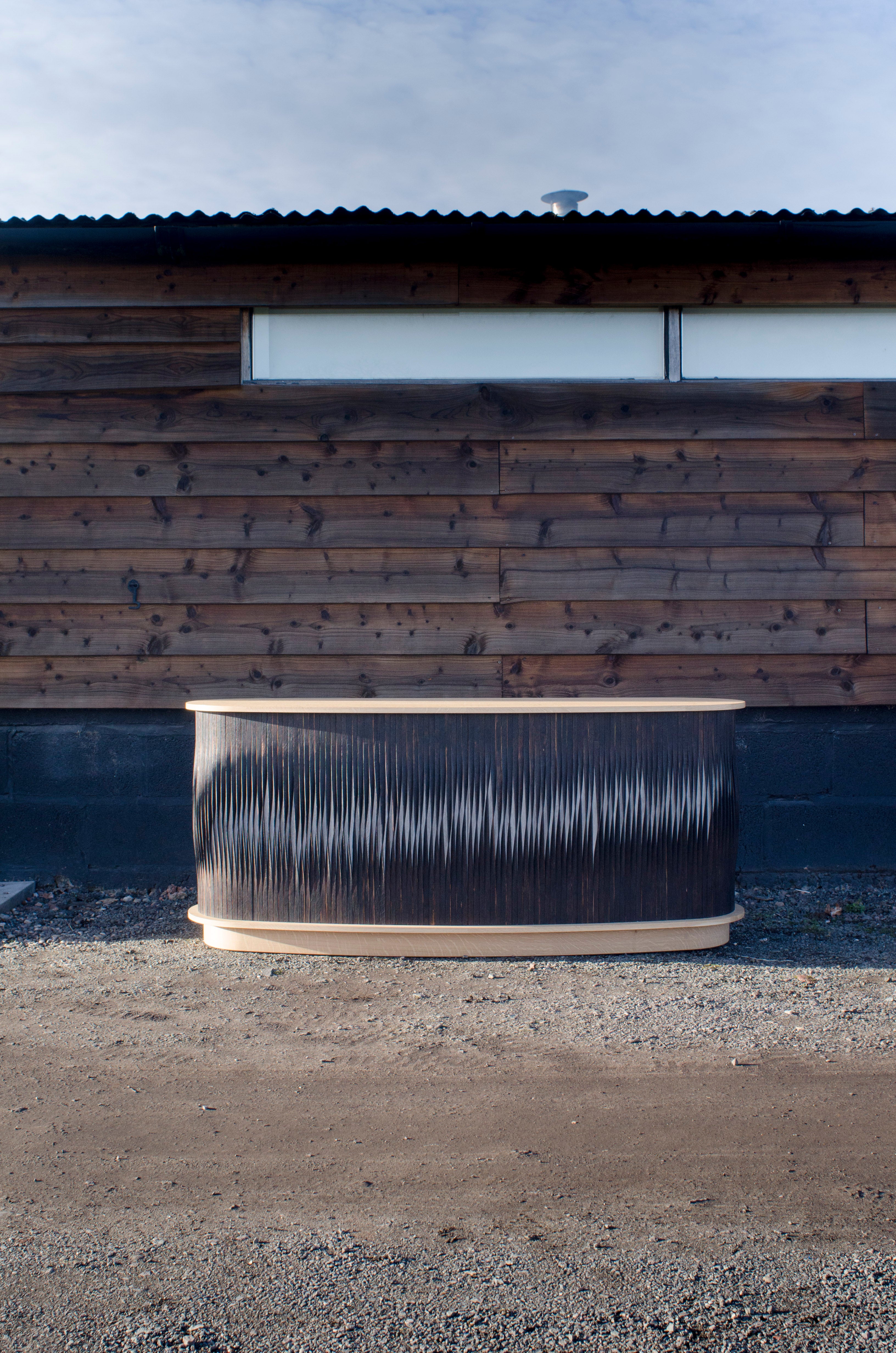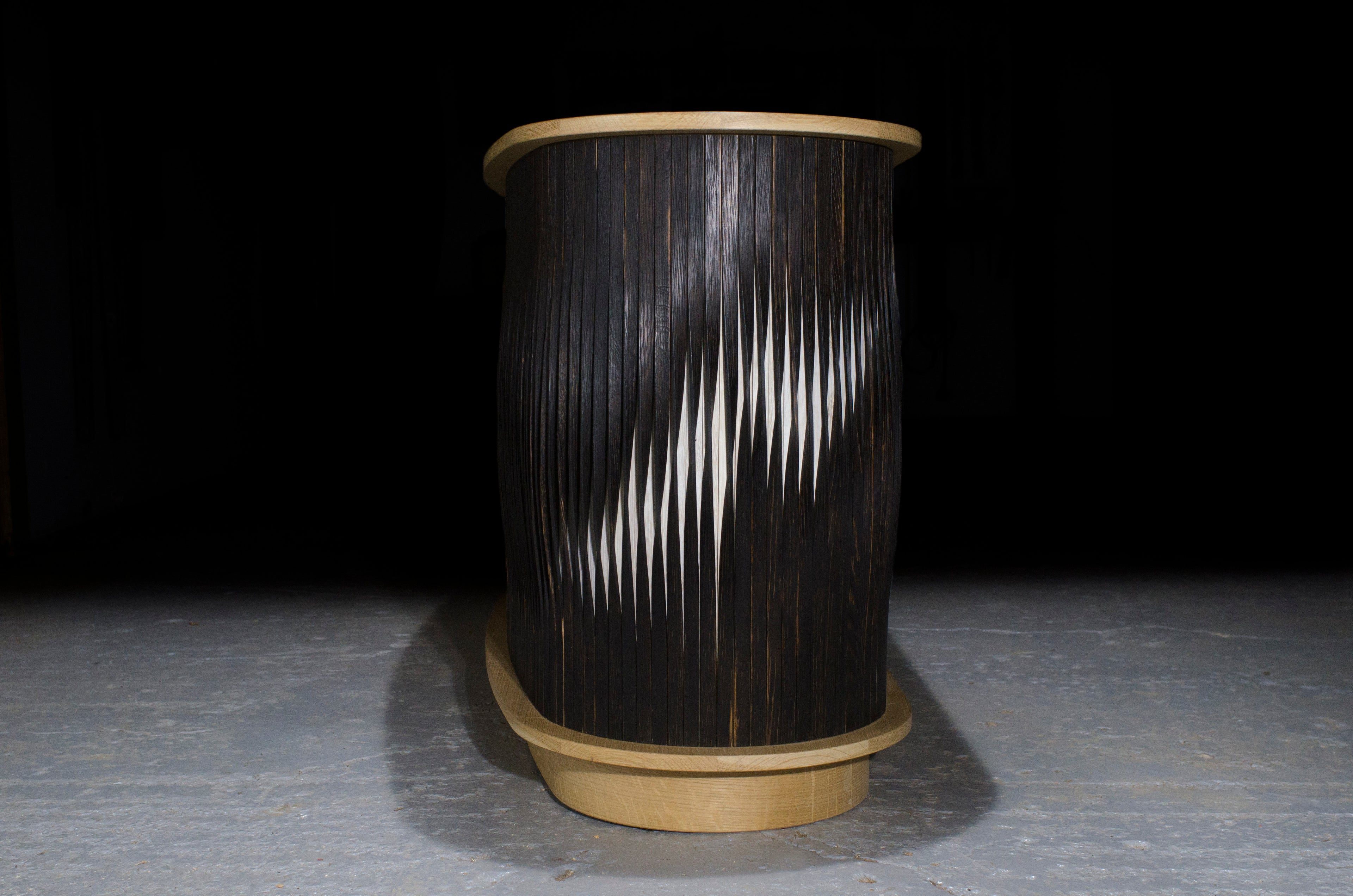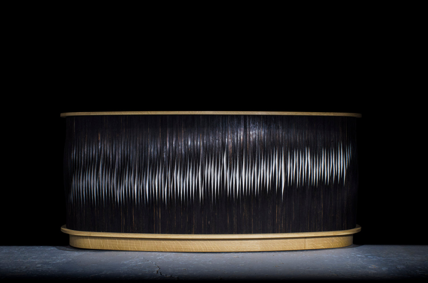 Pleats ever changing tambour pattern utilises the unpredictable nature of steam bending Oak. Each piece is steamed and bent by hand, springing back to its own unique shape, the pieces are then Shou Sugi Ban scorched and scrubbed to create an open grain texture organic to the touch. The supporting Oak is bleached to create the subtle grain white canvas for the pattern. When placed together the sliding tambour door is created, hiding the cabinets functional interior.