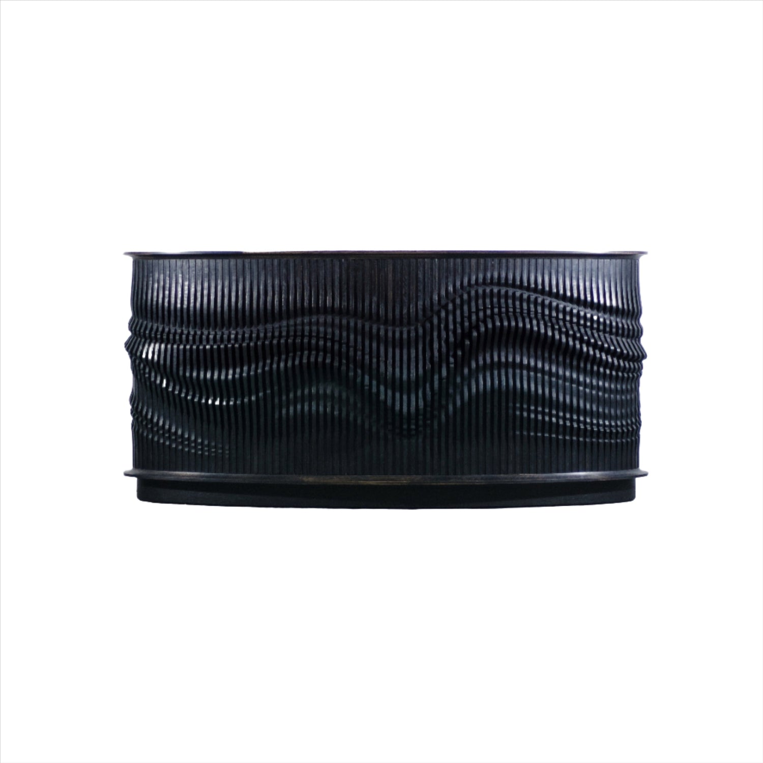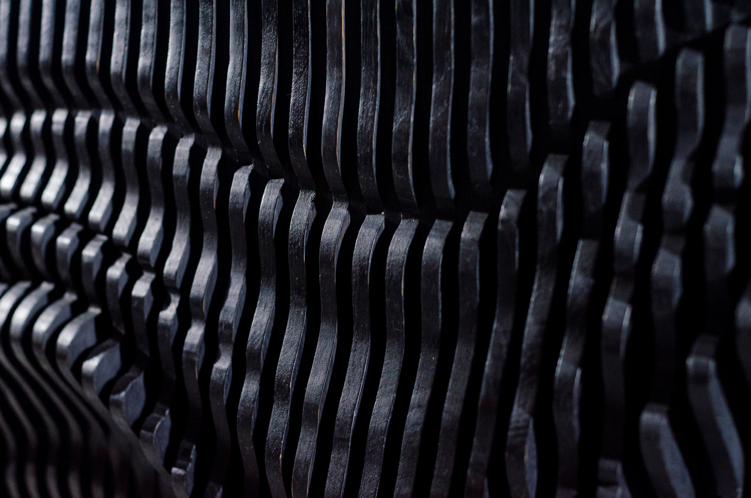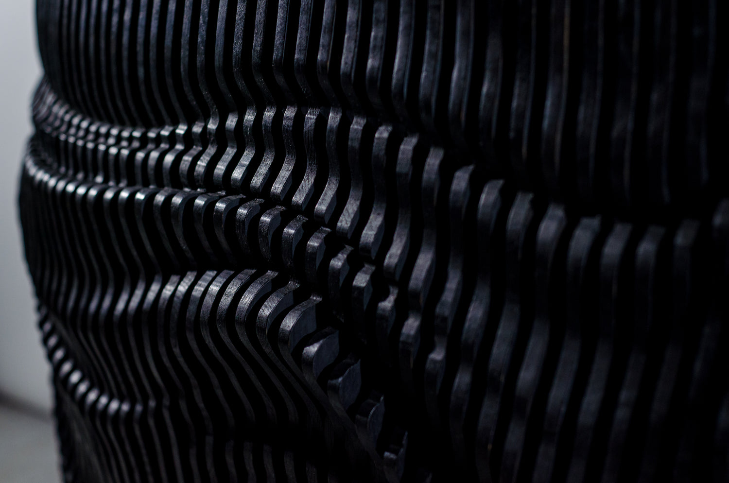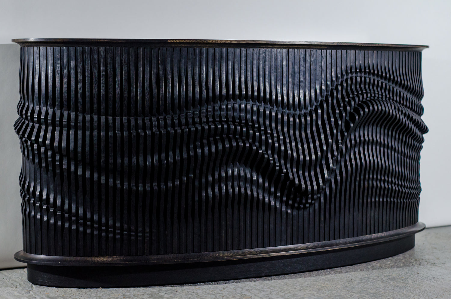 The graphic exterior of Self Portrait is created by taking profile photos of my own face in various rotations, which are then stretched, squashed, mirrored, and finally lofted to construct a surface between them. Each slice of oak is then cut and shaped by hand using traditional spokeshaves and cabinet scrapers and assembled horizontally in corresponding order.