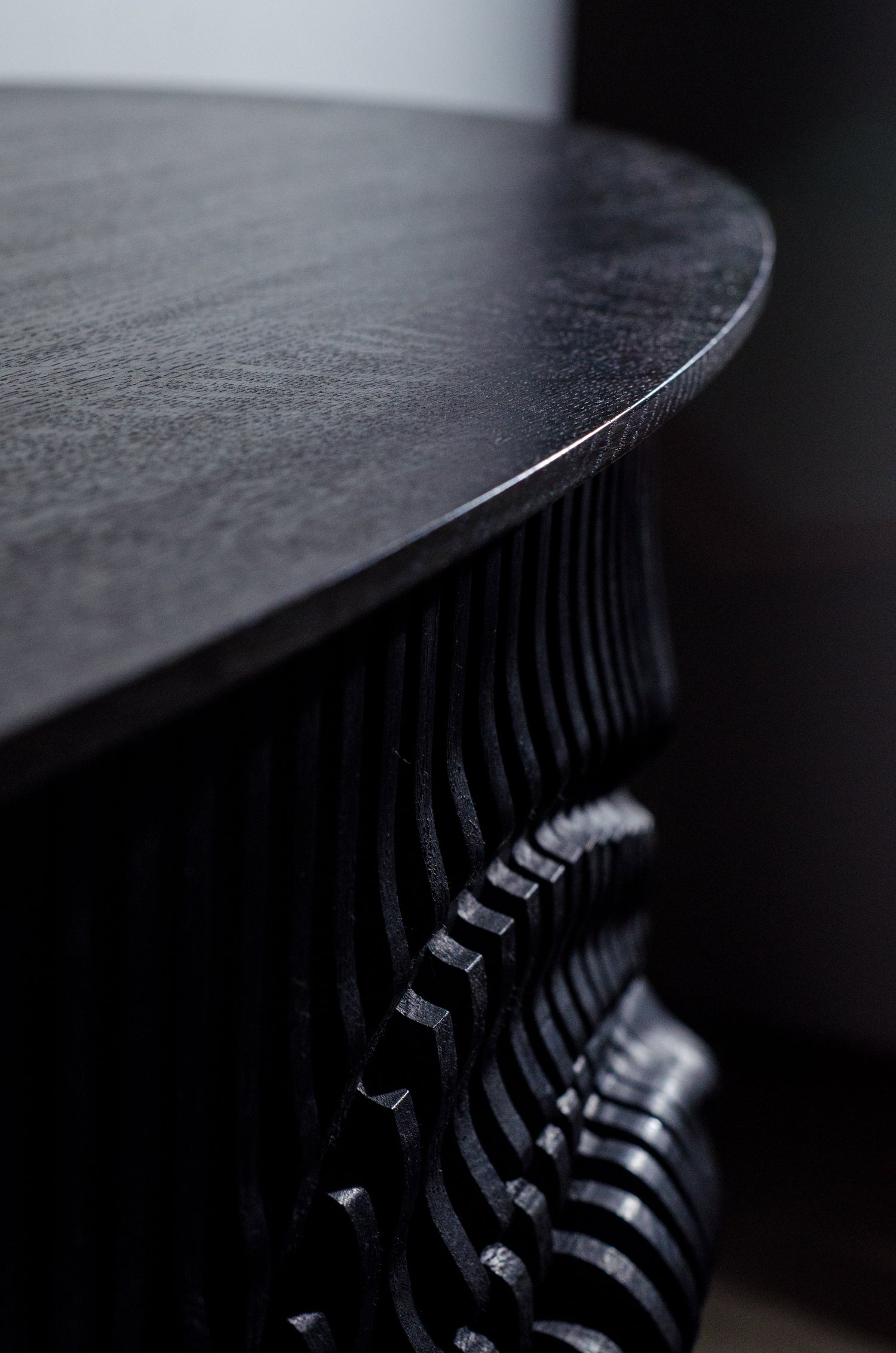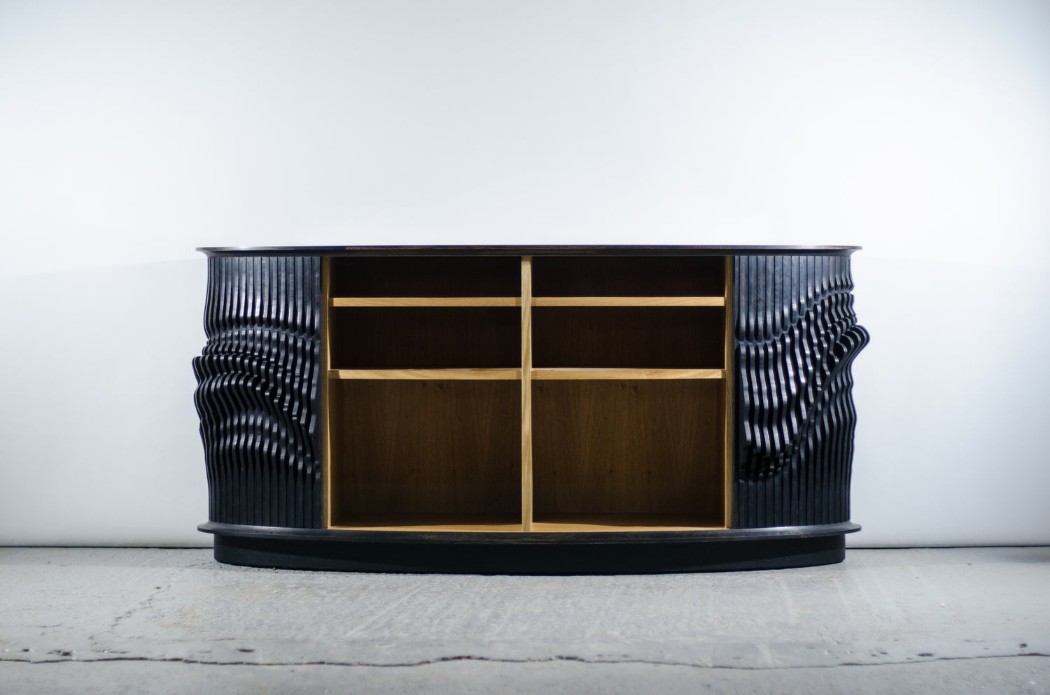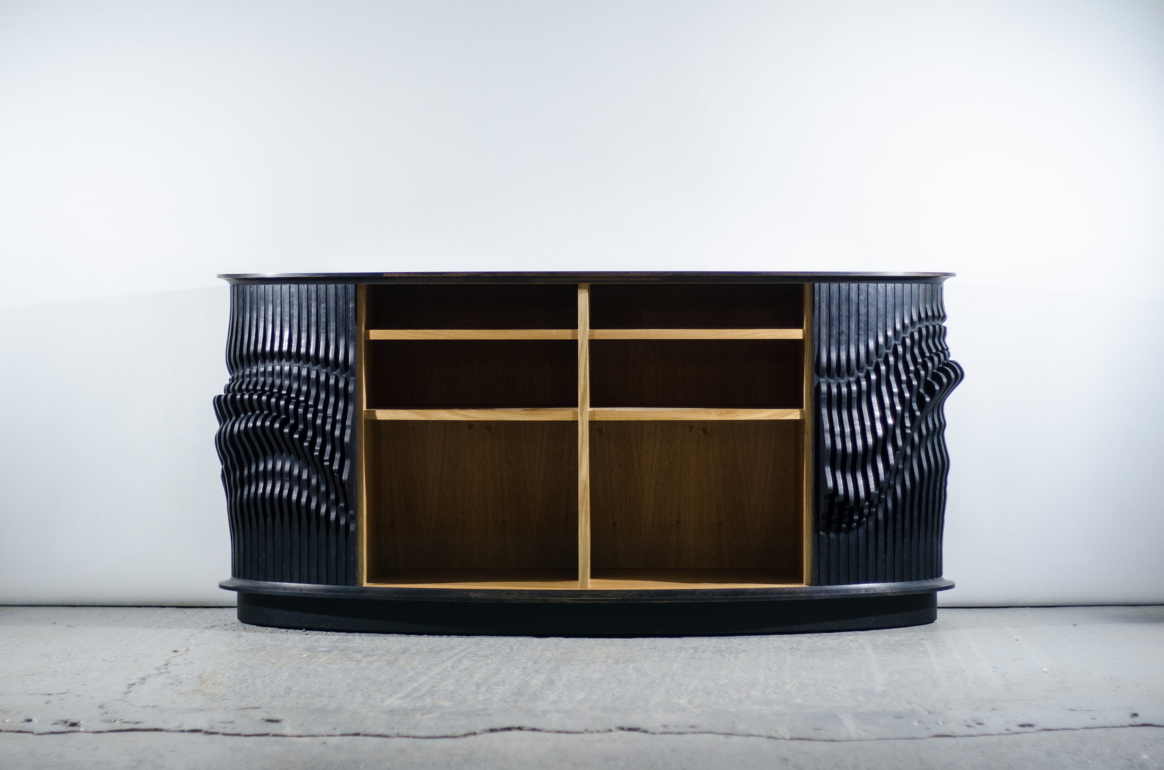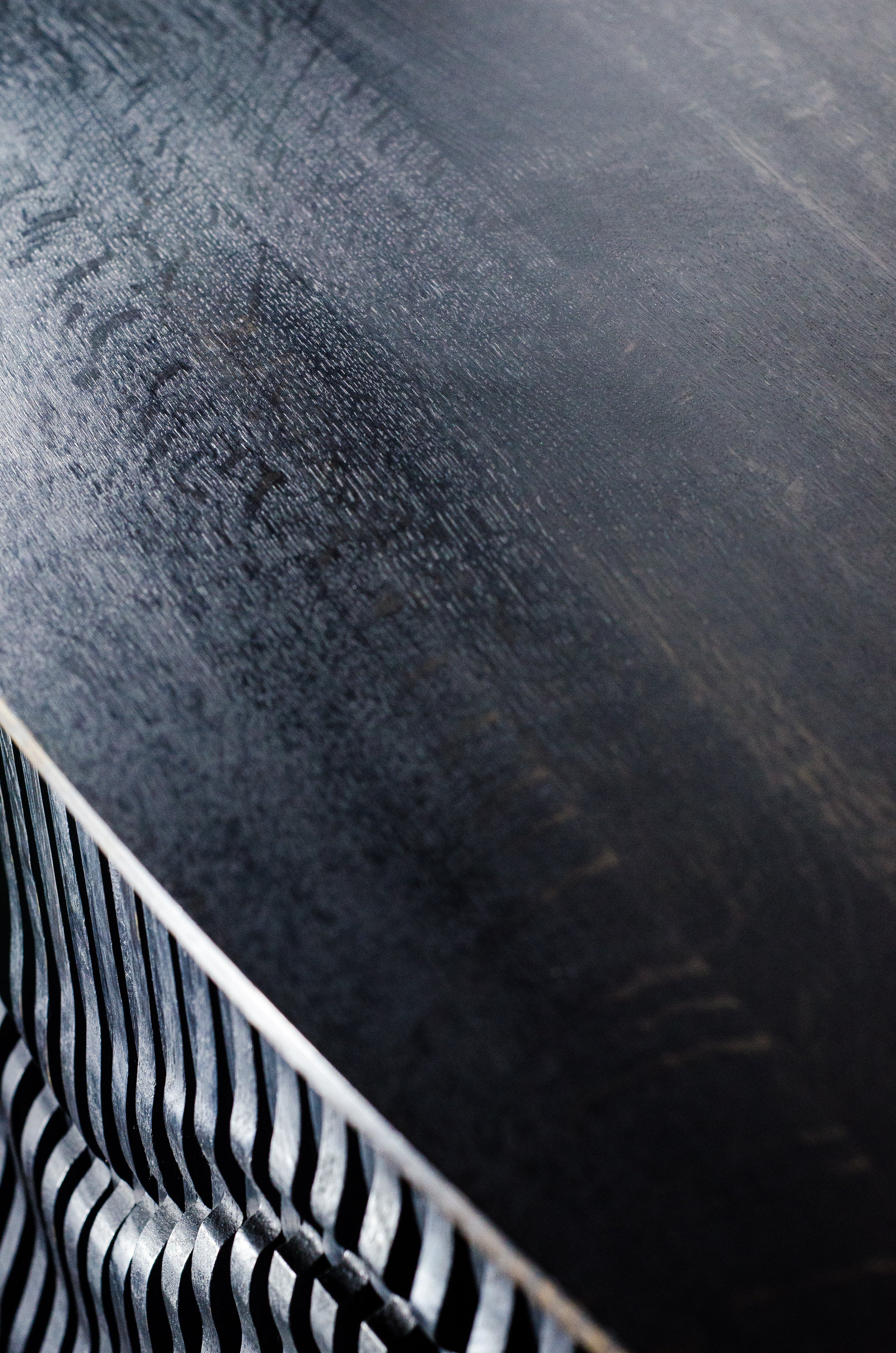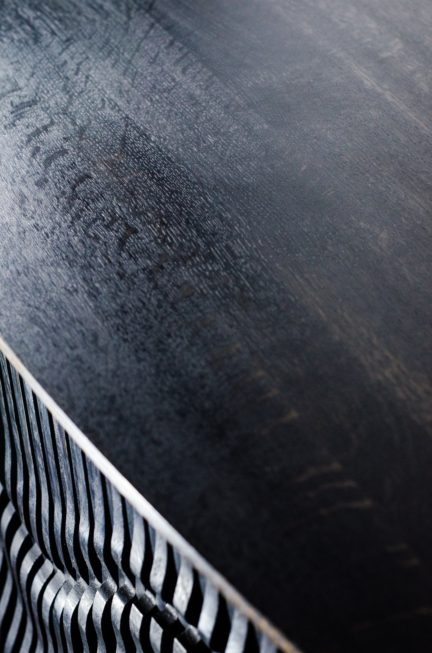 The rich black of the final piece is developed using a traditional staining process in which acids react with the natural tannins of the Oak to produce a black surface that subtly varies in tone, with a wax finish applied to amplify the final depth of shade. Inside the cabinet is Oak in its natural colour, contrasting with black exterior.