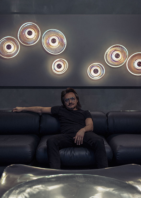 Since 1999, John has cultivated his multi-disciplinary studio, assembling a talented crew of over fifty creatives who collaborate with him to bring his lighting, furniture, and sculptural objects to life. More recently, his exploration of surfing has revealed a newfound love for the ocean, which has come full circle, reigniting his connection to that initial encounter with molten glass. Inspired by the fluidity of both fire and water, he crafts bodies of work that find their place in the universe, as well as within his own artistic journey.