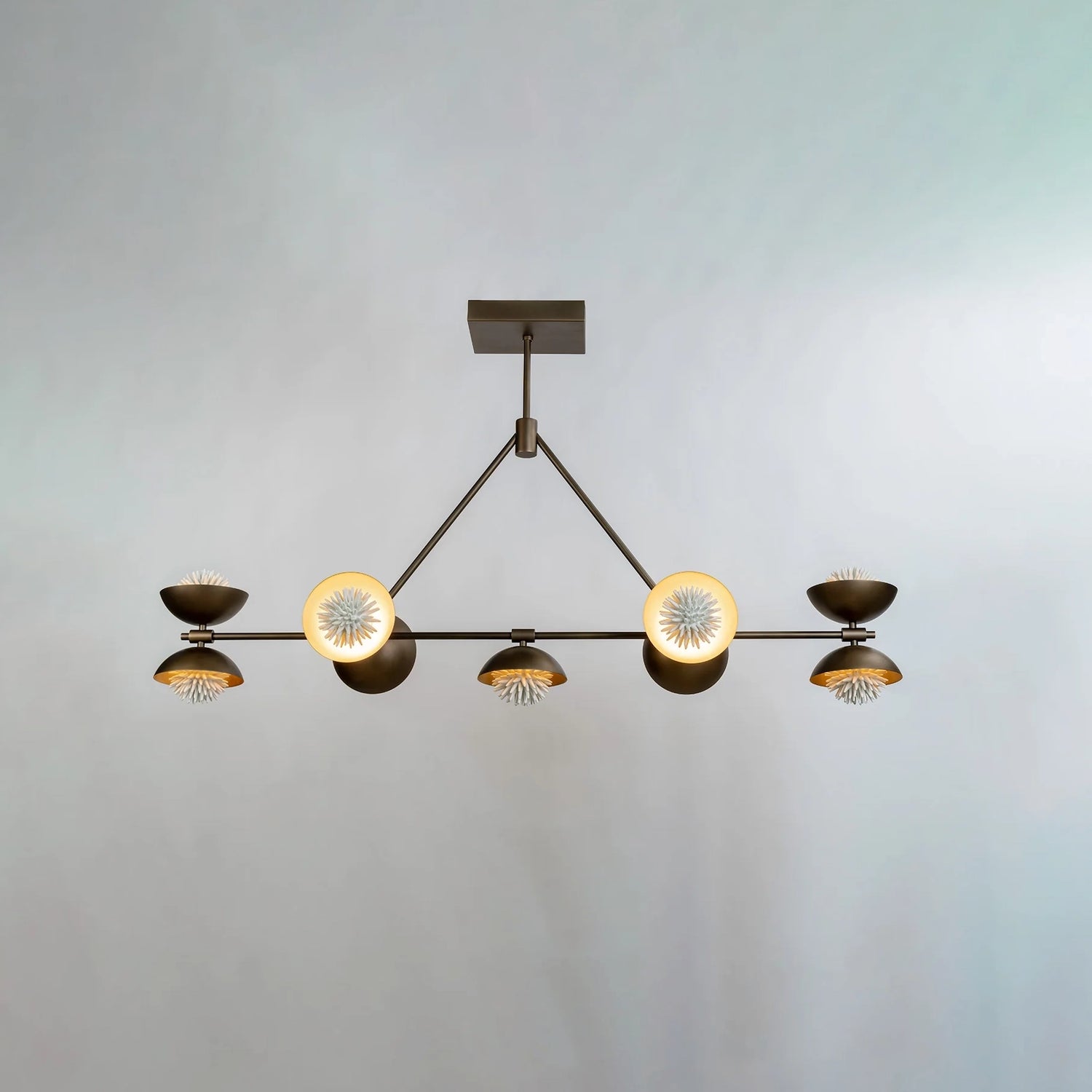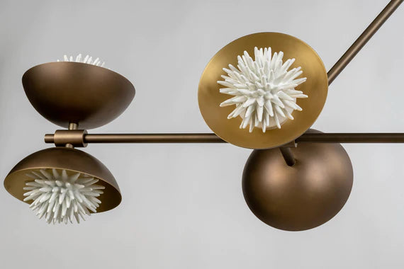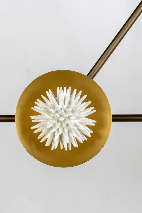 The Abysse chandelier in brass and white lacquer appears to be suspended, diffusing a soft, subdued light, like a myriad of pure, enveloping jewel cases revealing mysterious sculptures reminiscent of a sea urchin
