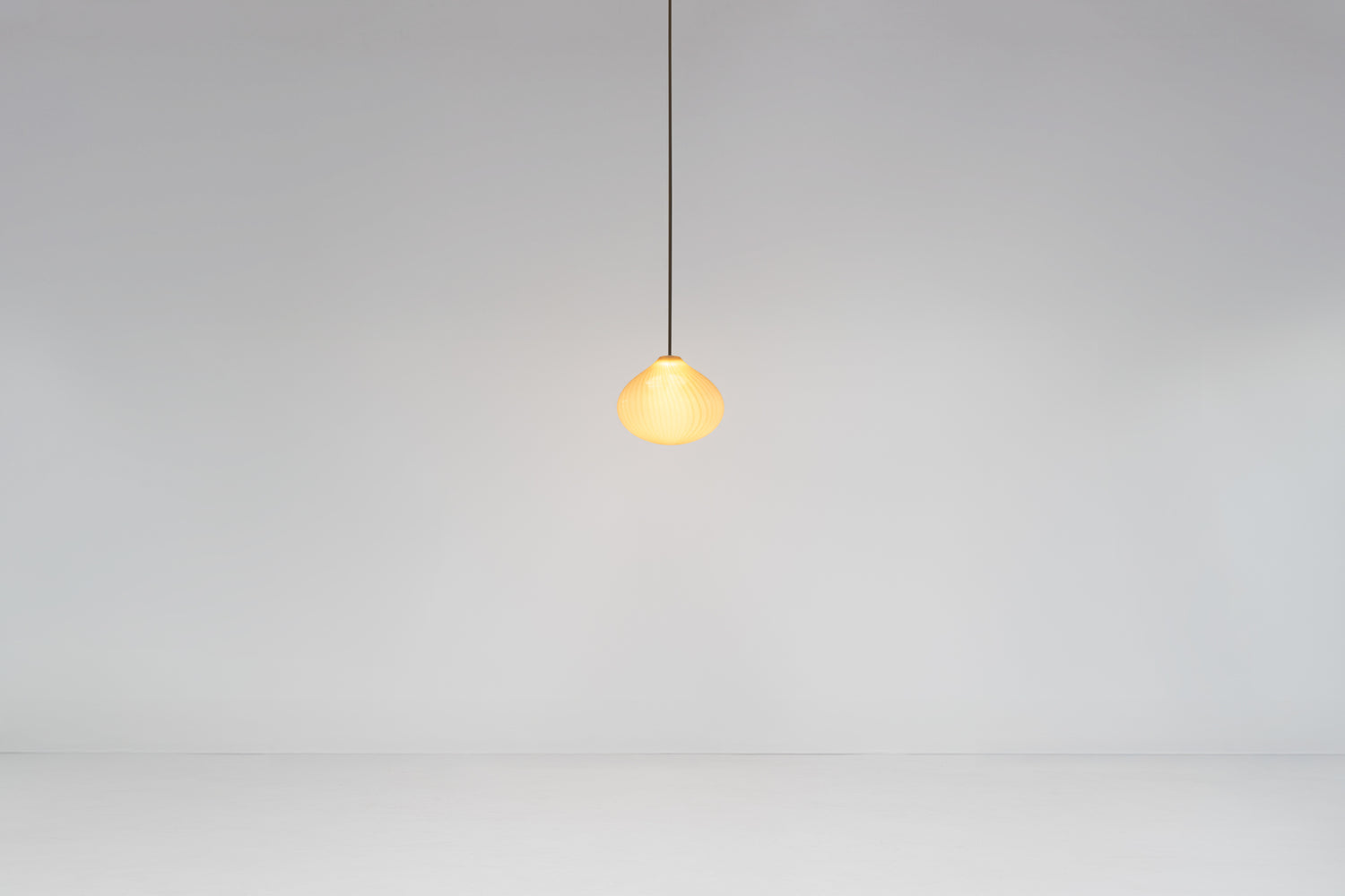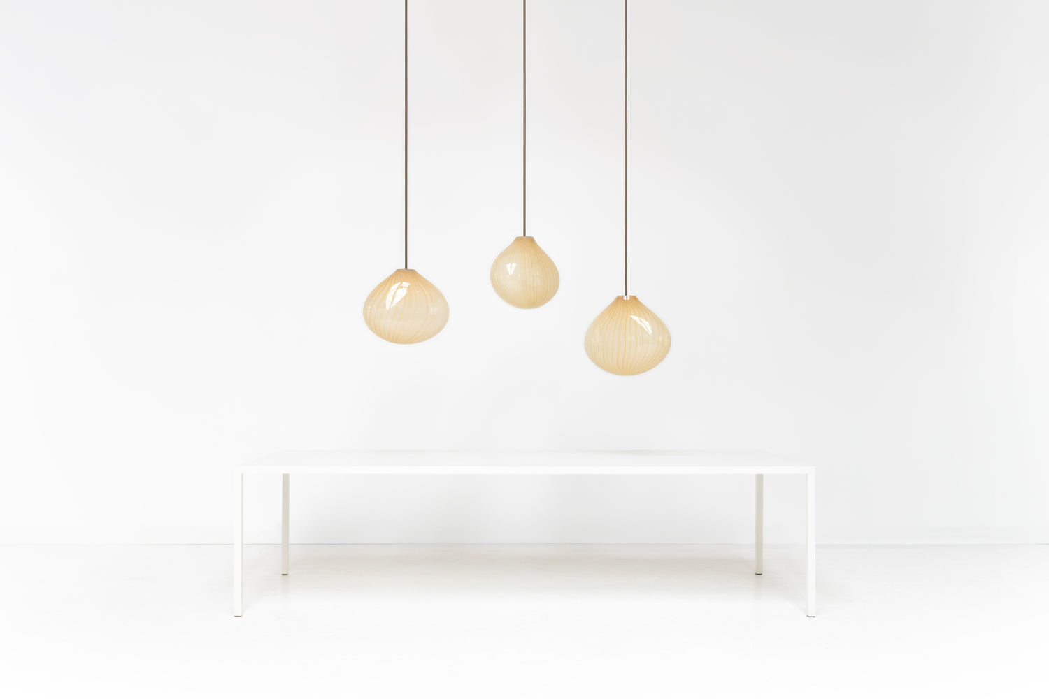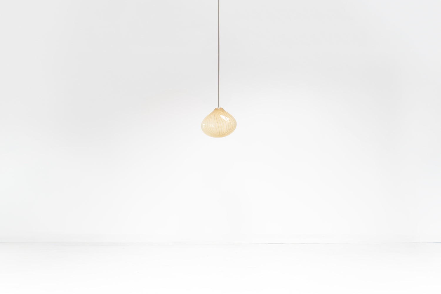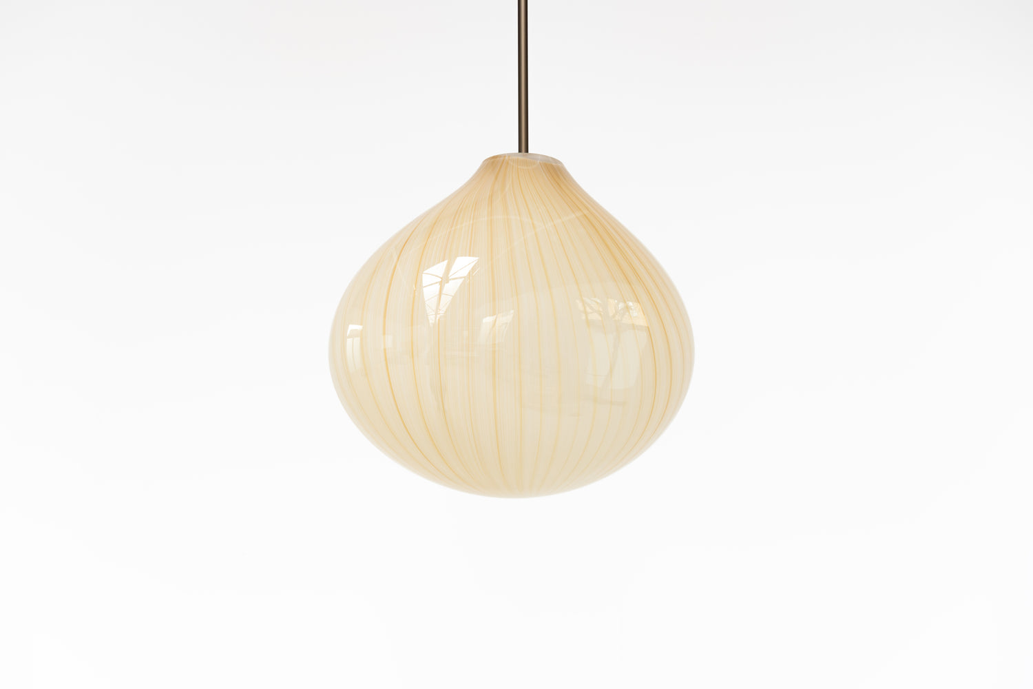 Our glassblowers draw linear, ocher and opaque glass threads. They are applied hot around an ivory glass bubble.