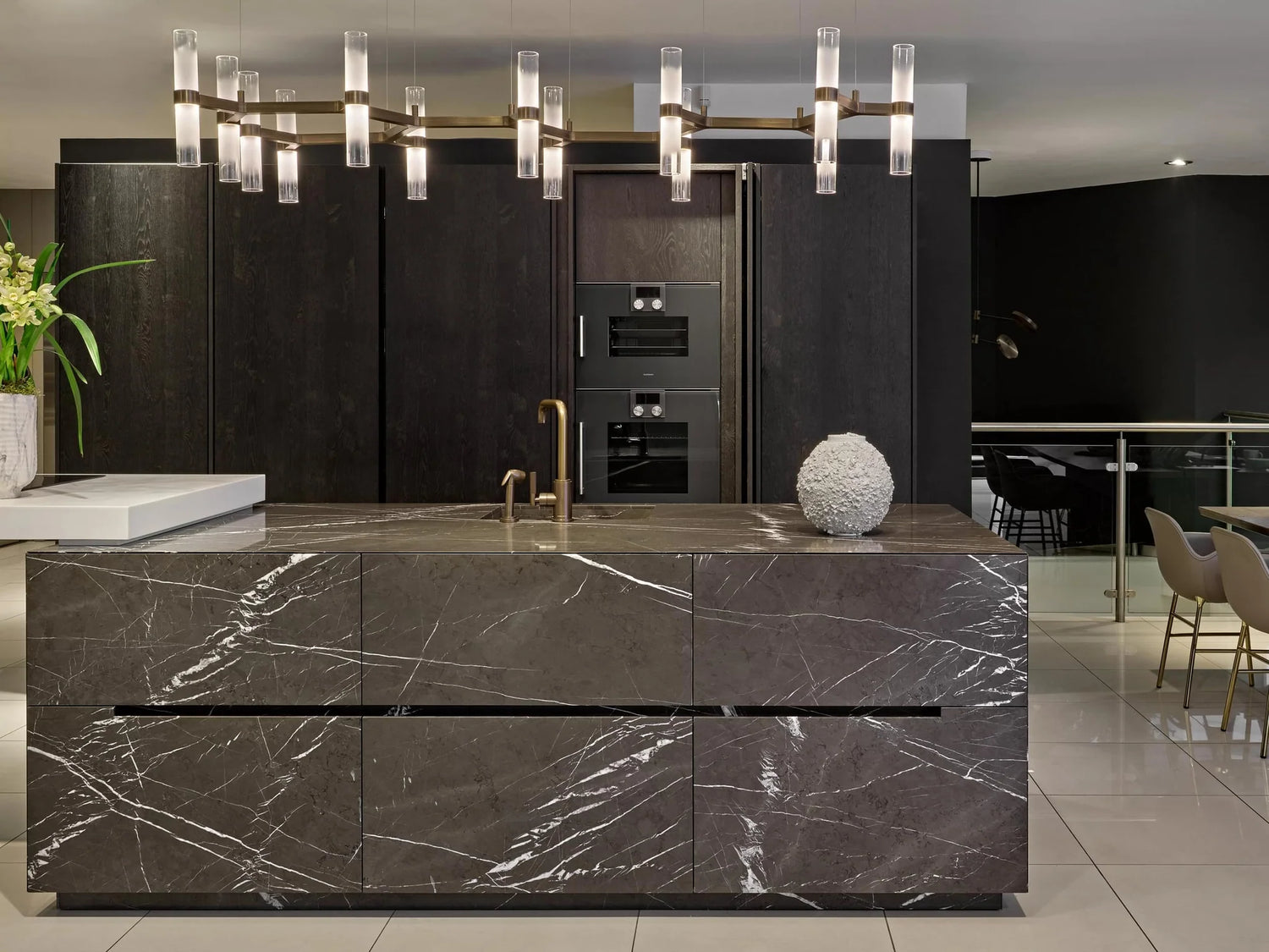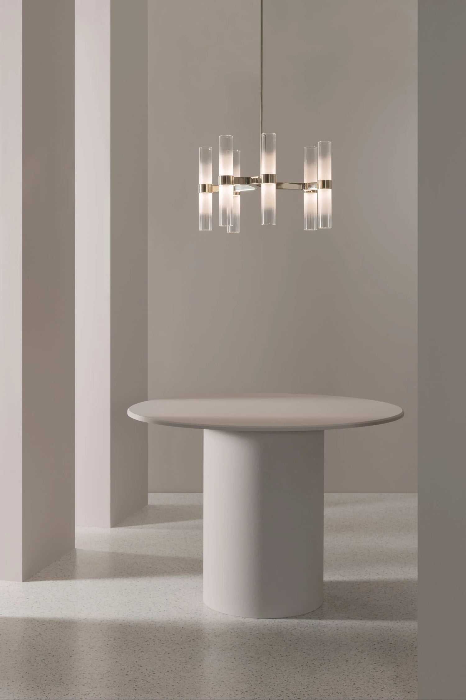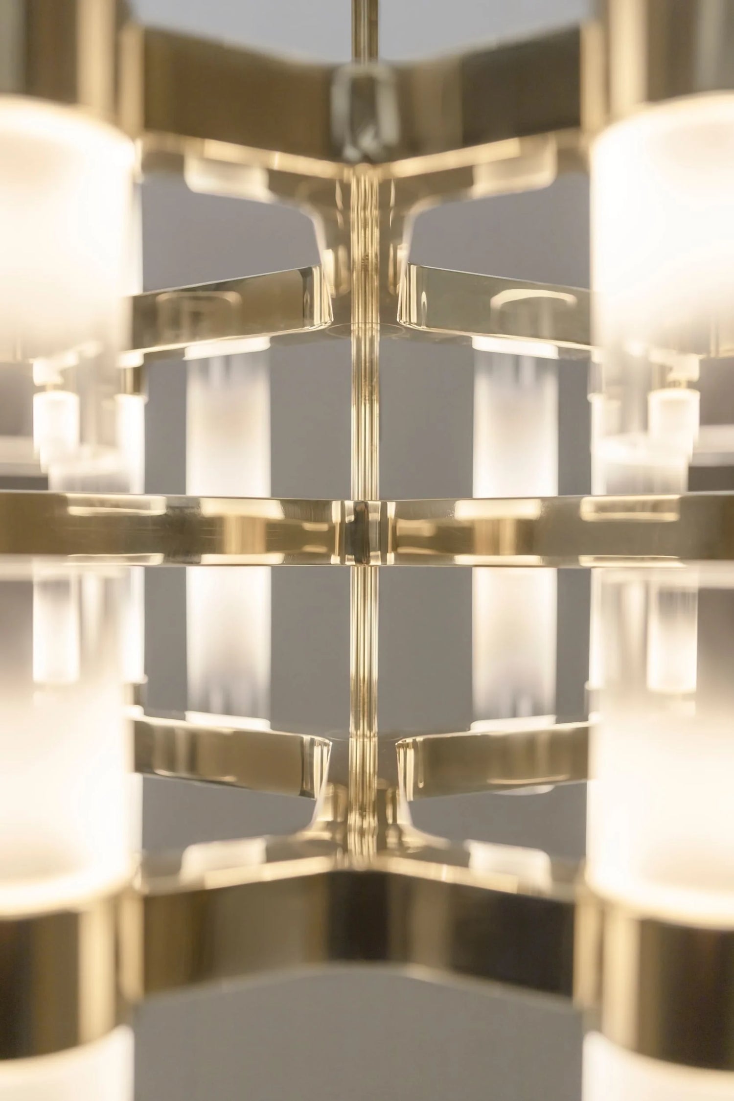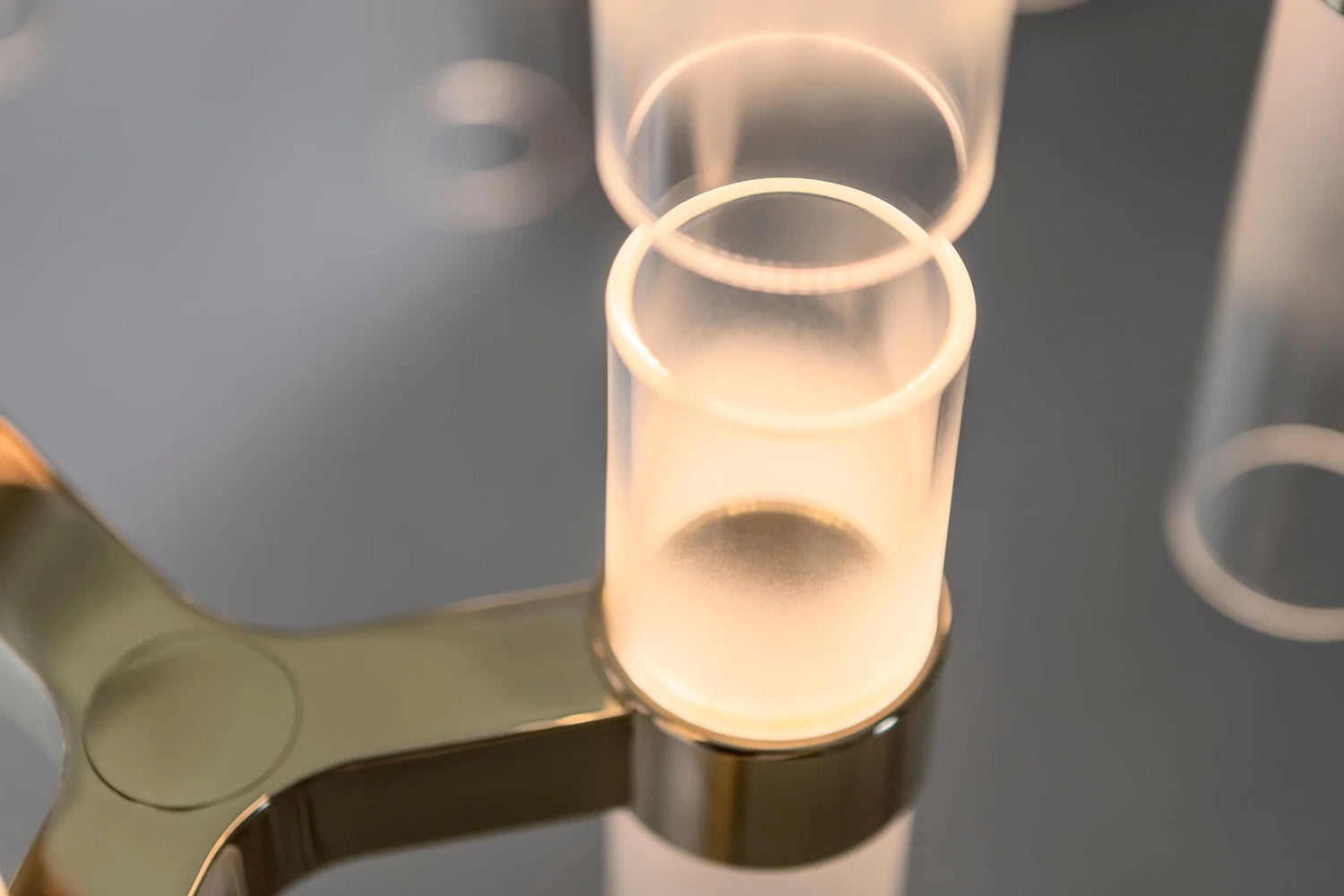Frosted cylindrical glass tubes sit within a tiered brass structure.