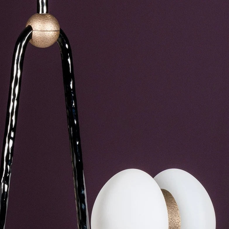 This low two-arm chandelier, somewhere between a chandelier and a sculpture, combines materials such as brass, hammered aluminum and glass