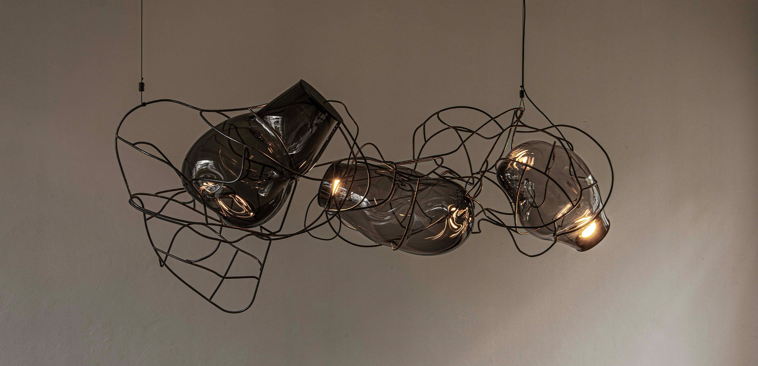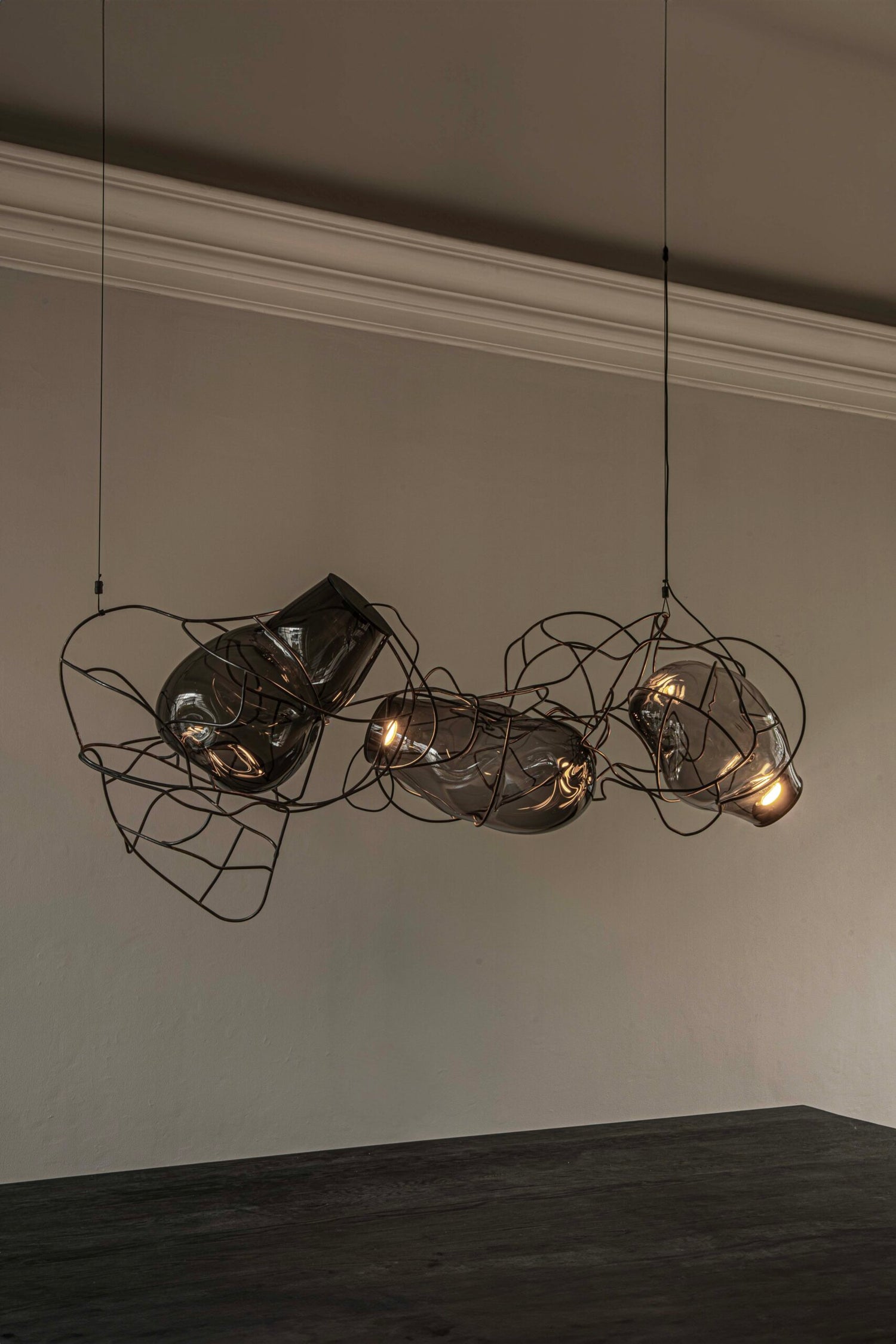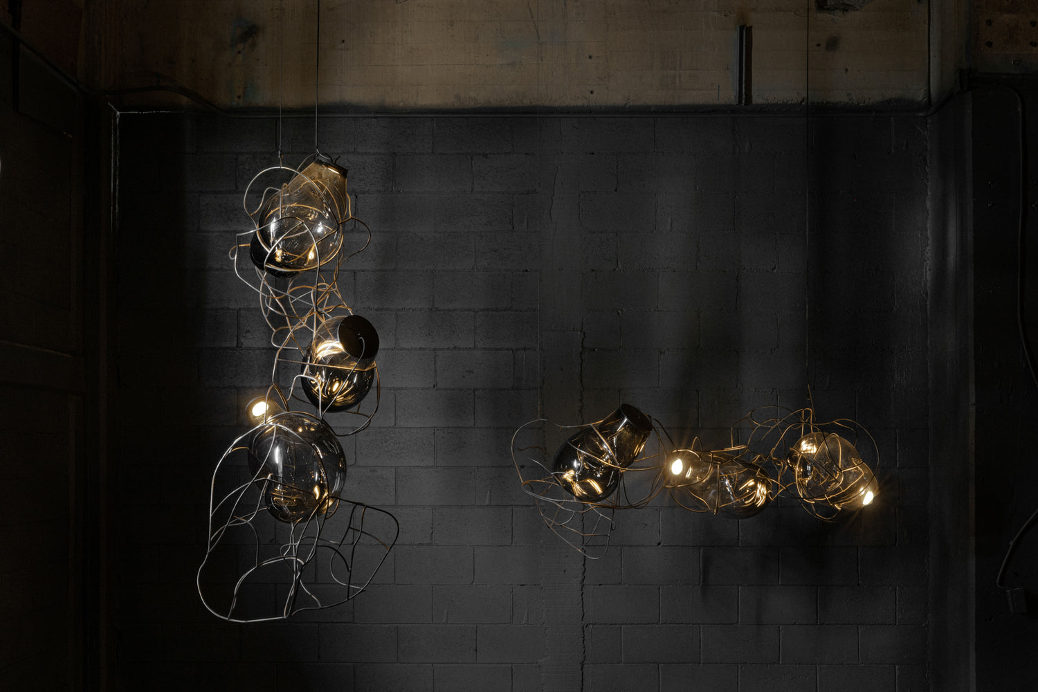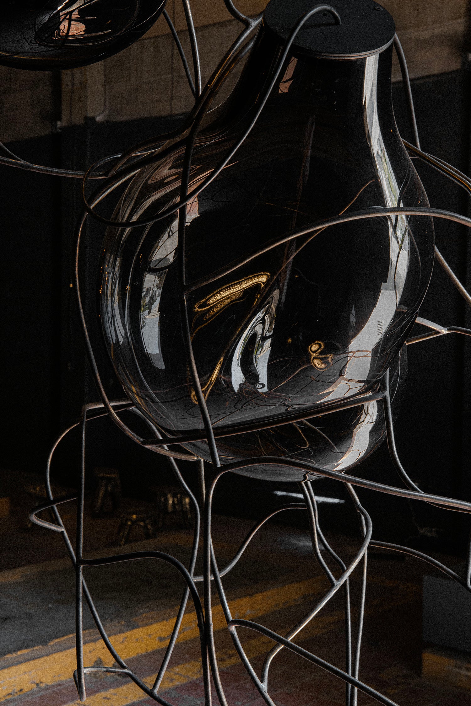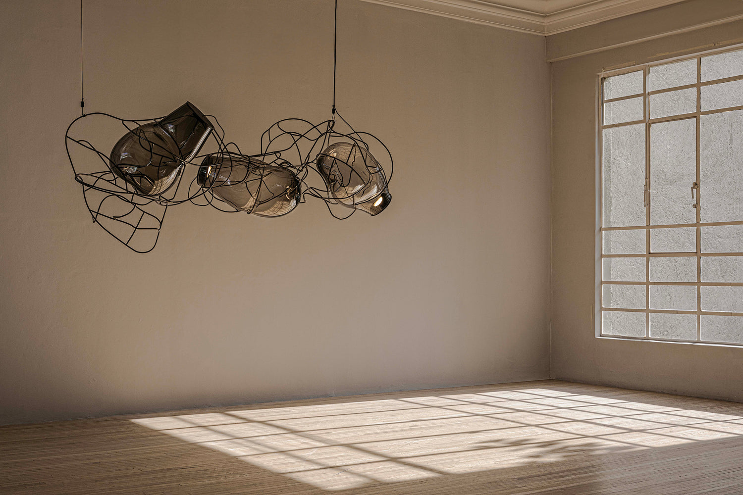 Cumulo is EWE Studio’s first chandelier lighting sculpture, a work that finds inspiration in cloud formations. Like its simile, it integrates glass and metal into a single floating structure, defying its own visual and spatial balance. The work’s sculptural character permits it to be positioned vertically or horizontally, allowing a 360º view in whichever space it inhabits. The intricate metal structure cages a series of blown glass bubbles with a smart lighting system that create subtle patterns of light.