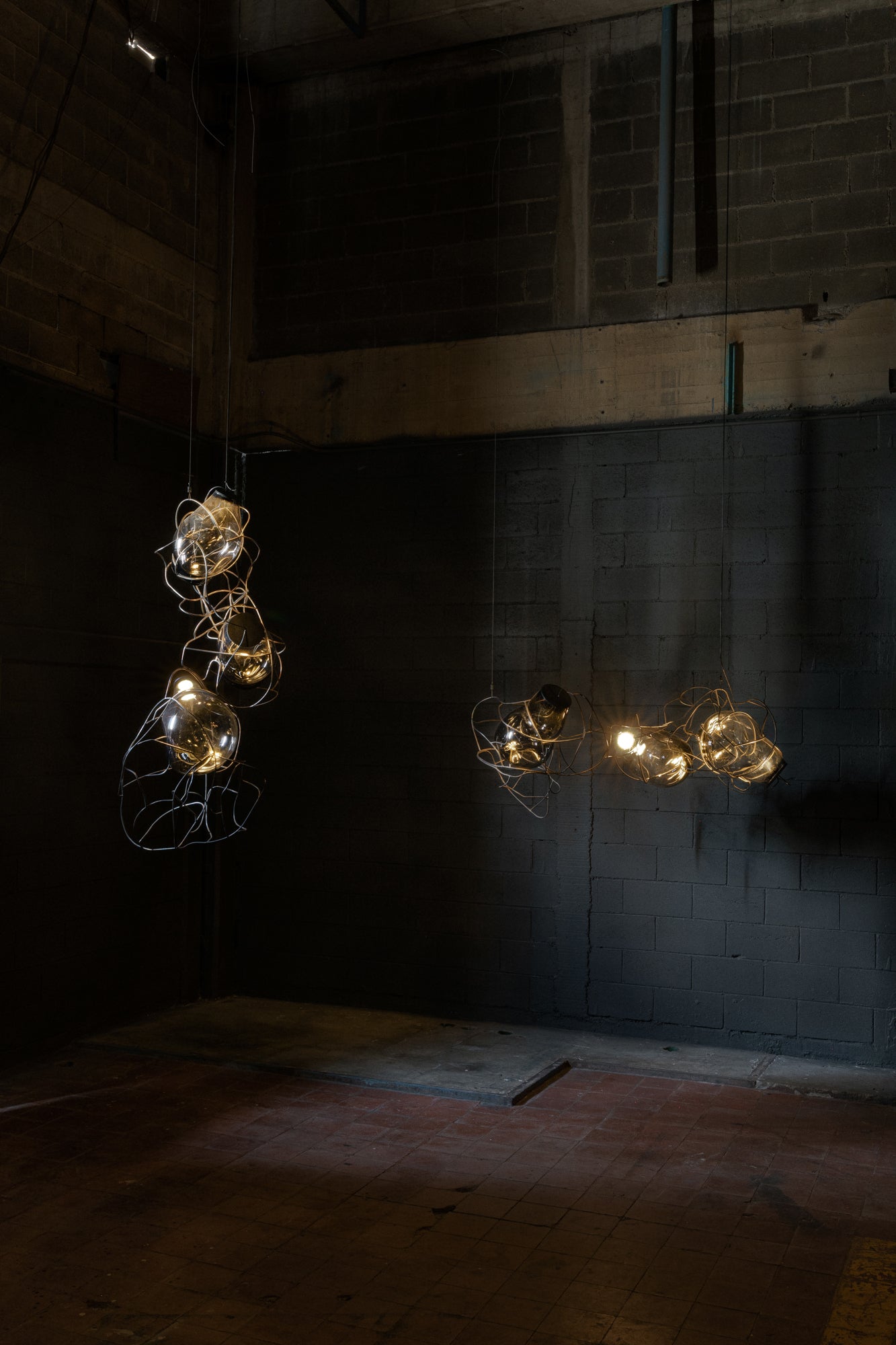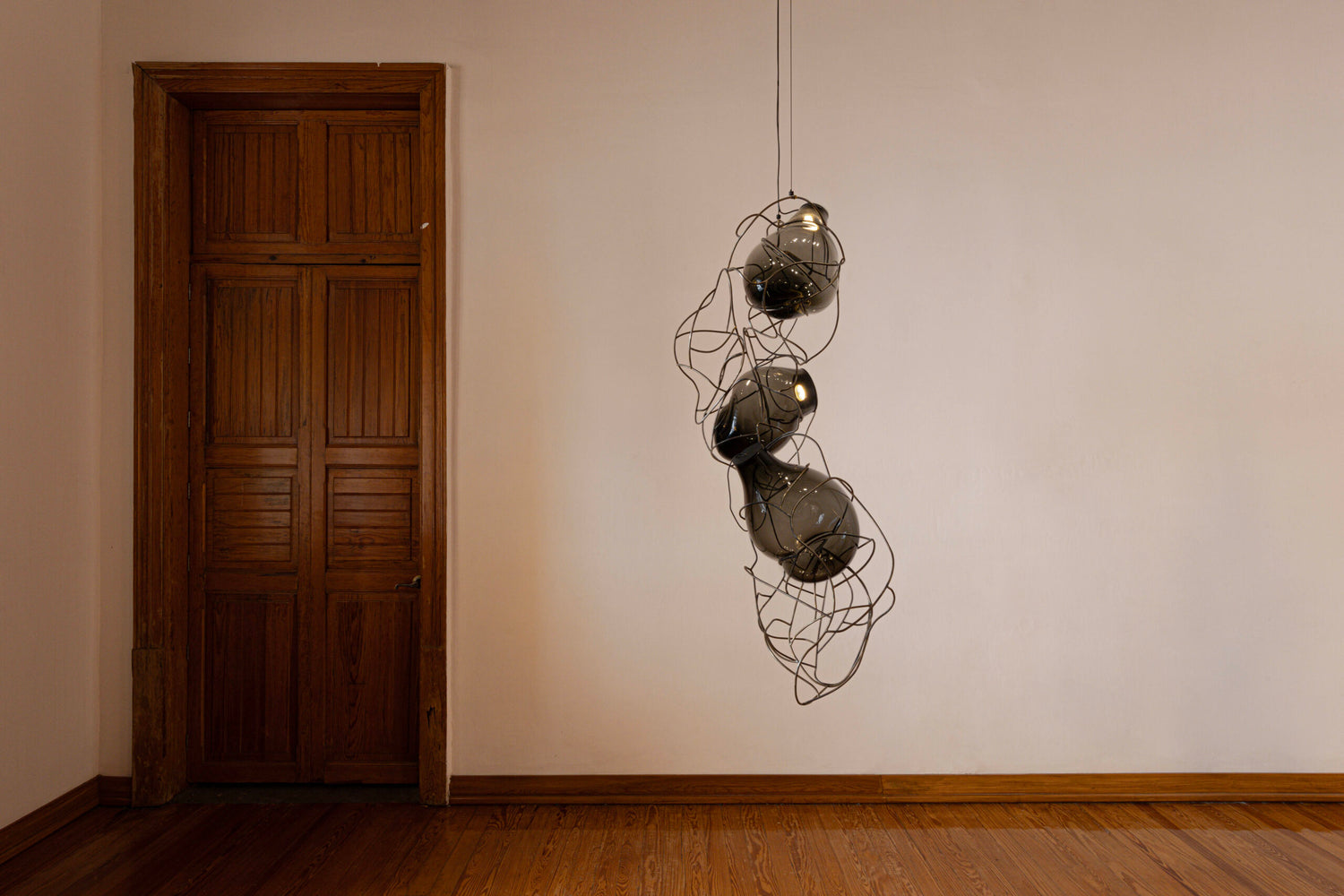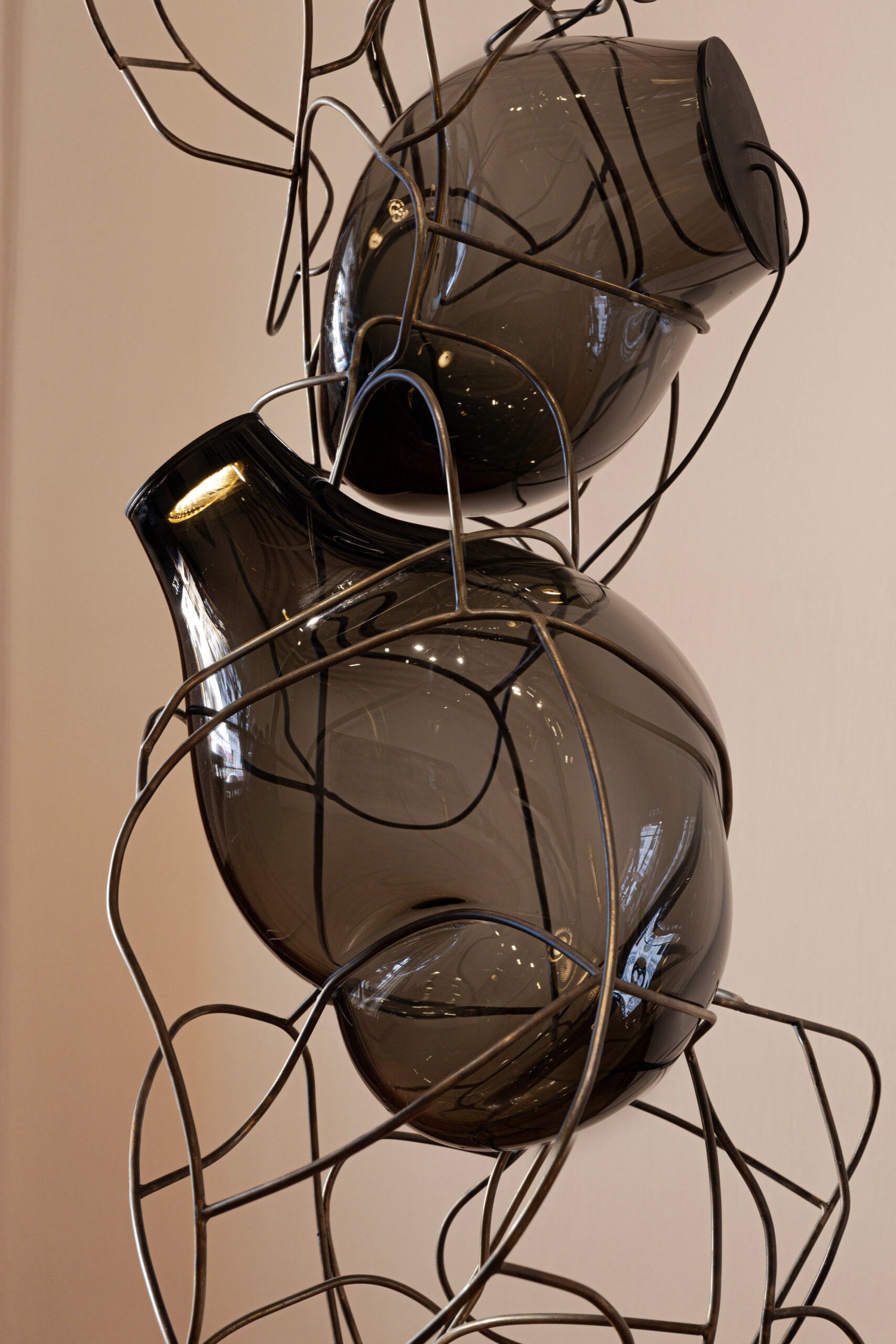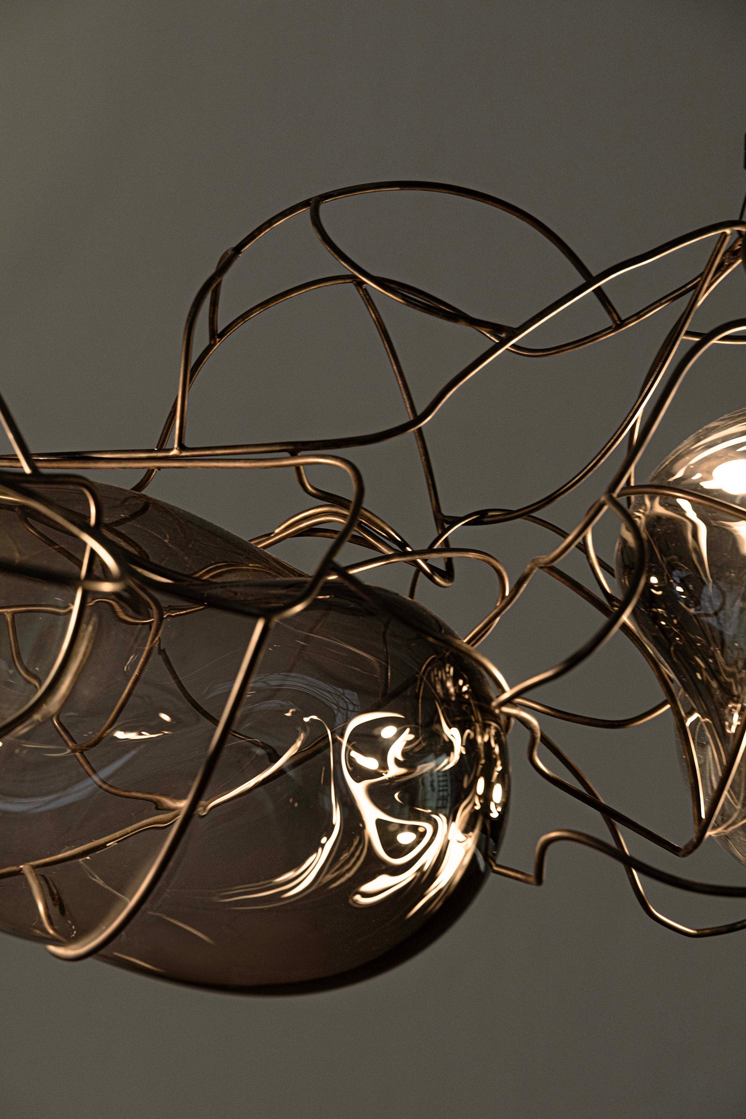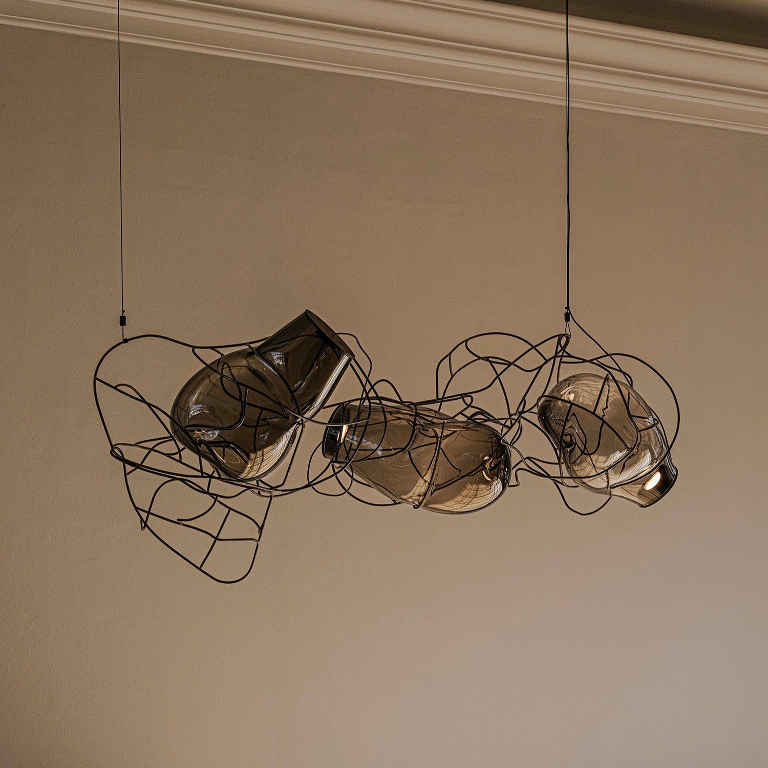 Cumulo is EWE Studio’s first chandelier lighting sculpture, a work that finds inspiration in cloud formations. Like its simile, it integrates glass and metal into a single floating structure, defying its own visual and spatial balance. The work’s sculptural character permits it to be positioned vertically or horizontally, allowing a 360º view in whichever space it inhabits. The intricate metal structure cages a series of blown glass bubbles with a smart lighting system that create subtle patterns of light.