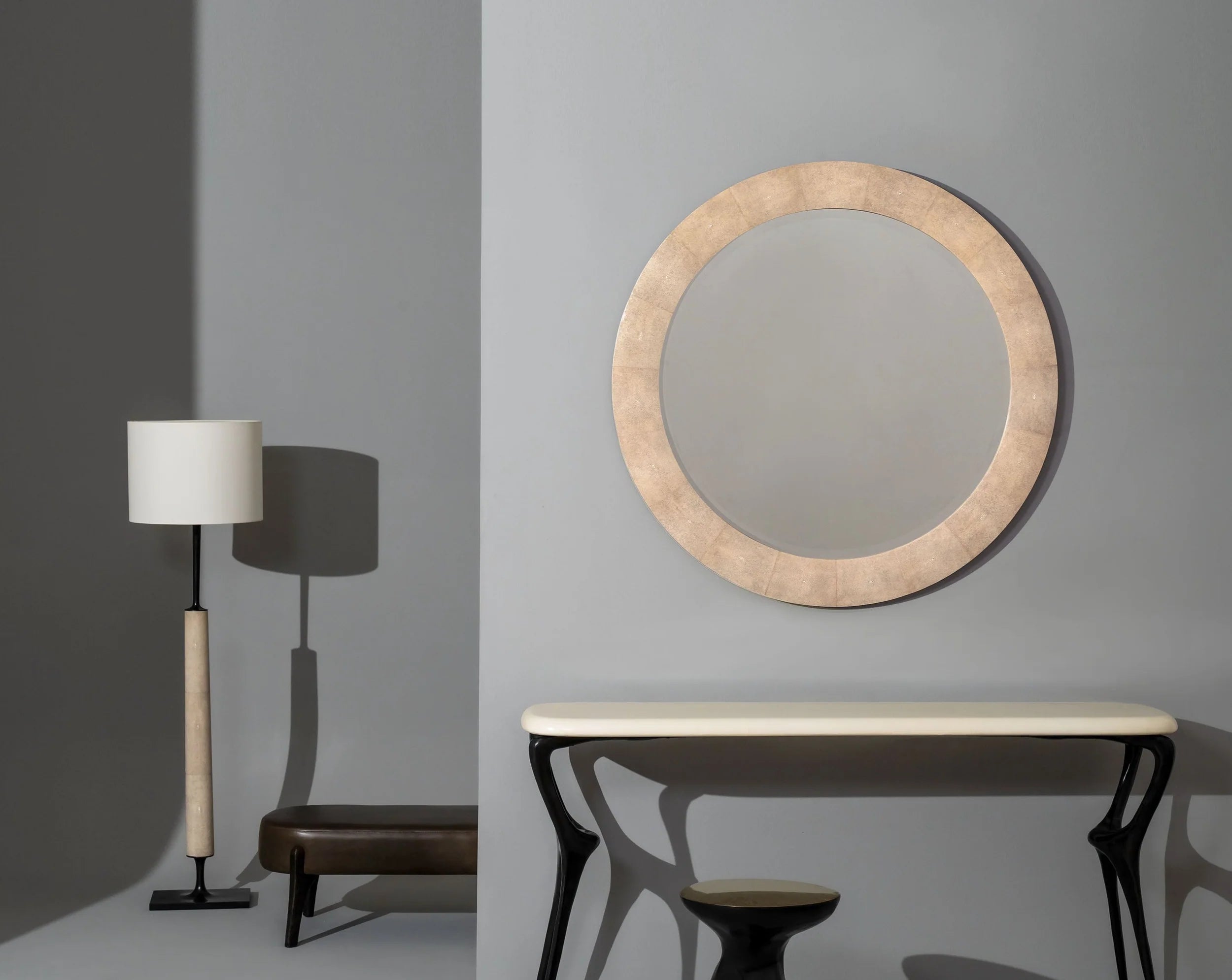 The Galucha is round and minimal, showcasing stingray shagreen