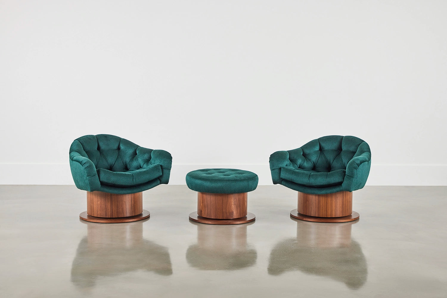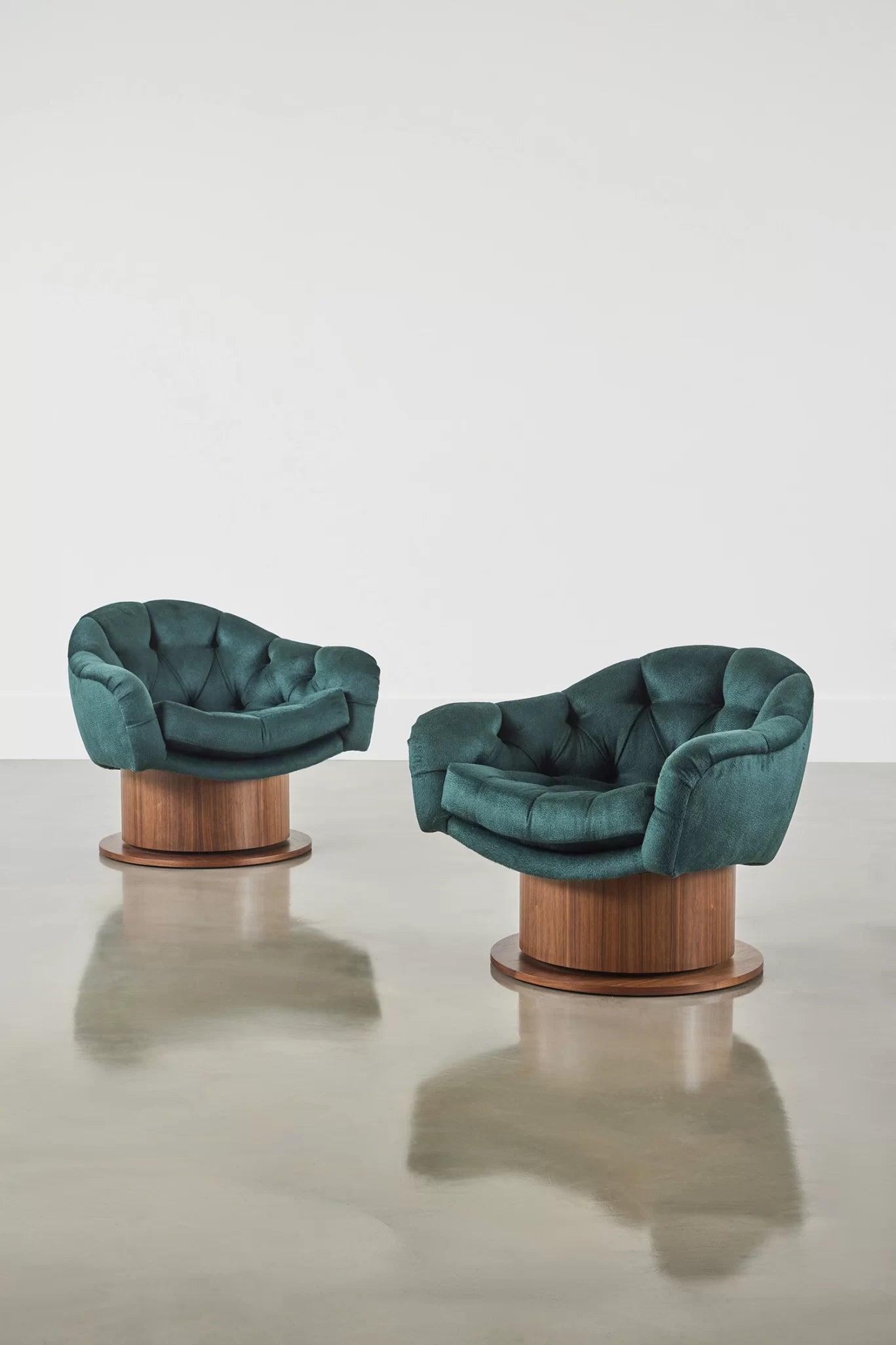 Upholstered chair with tufted seat and cushion with brass or wood veneered swivel base.