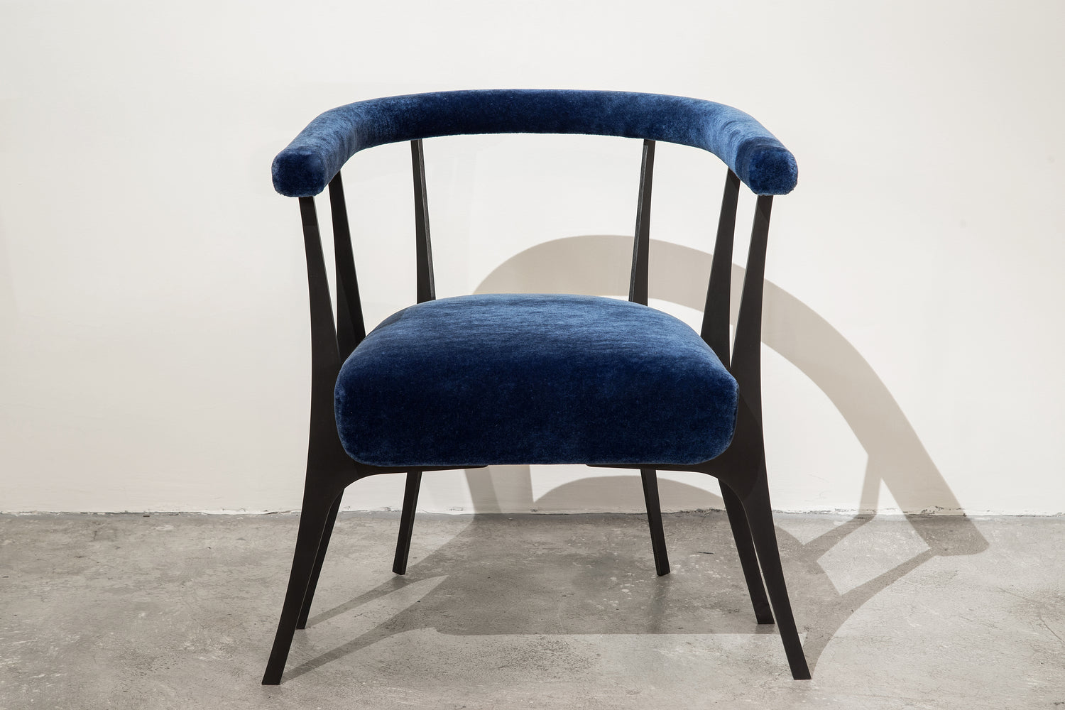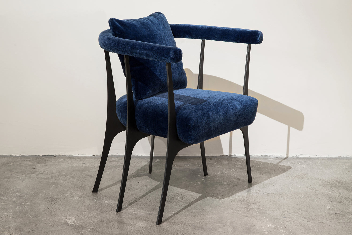 A ring setting for a jewel, Ulysse is a spidery armchair in slate steel with twelve or six legs (with "scratched" edges) and a velvet seat