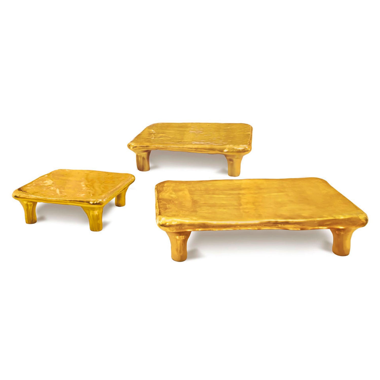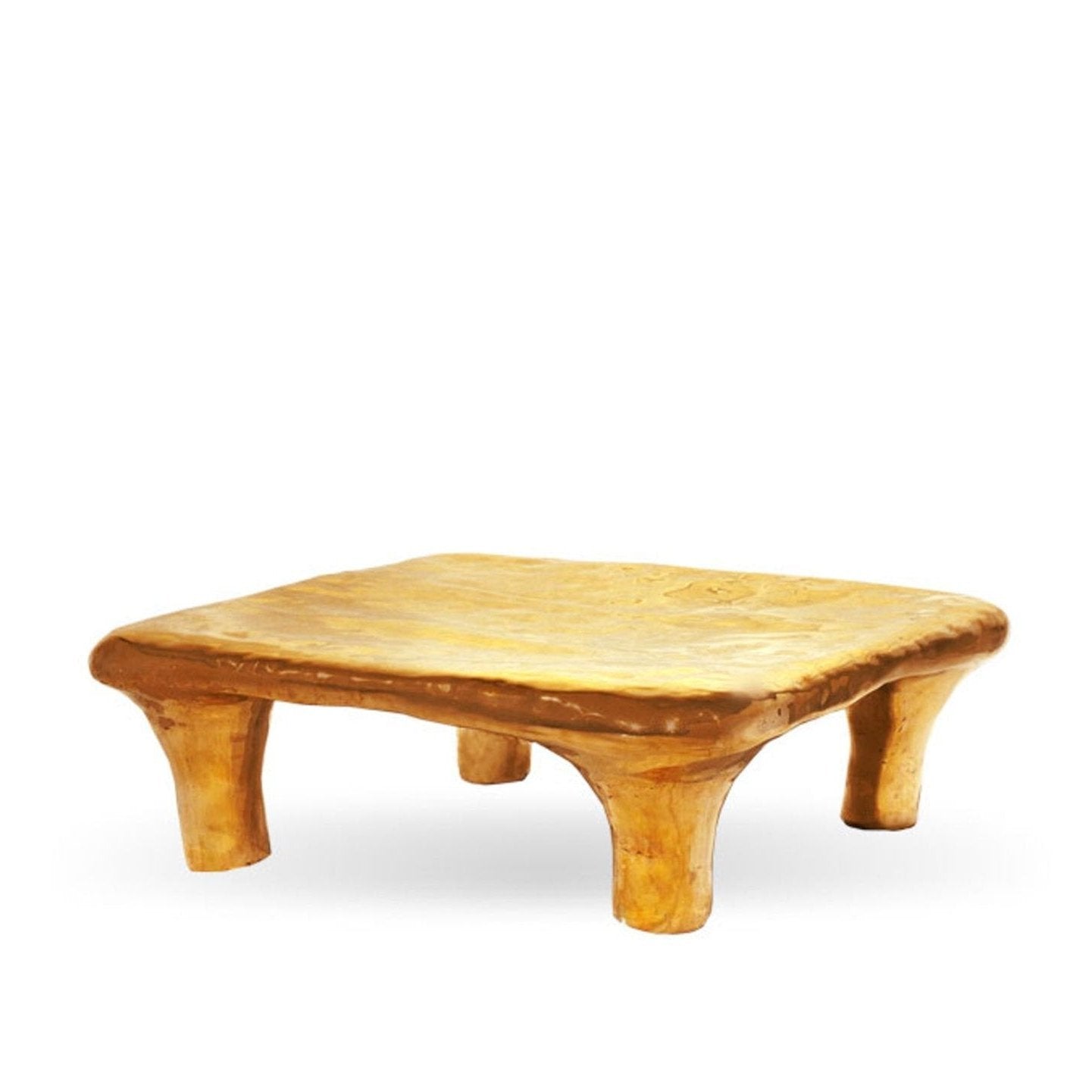 Illusion is a large square coffee table handcrafted in gleaming brass. Its undulating top and organic form makes it a showstopper in your home.