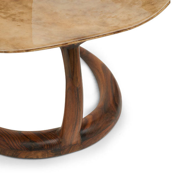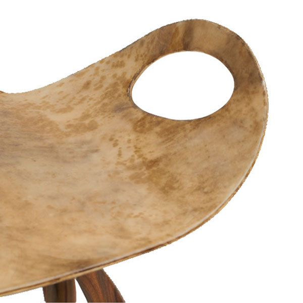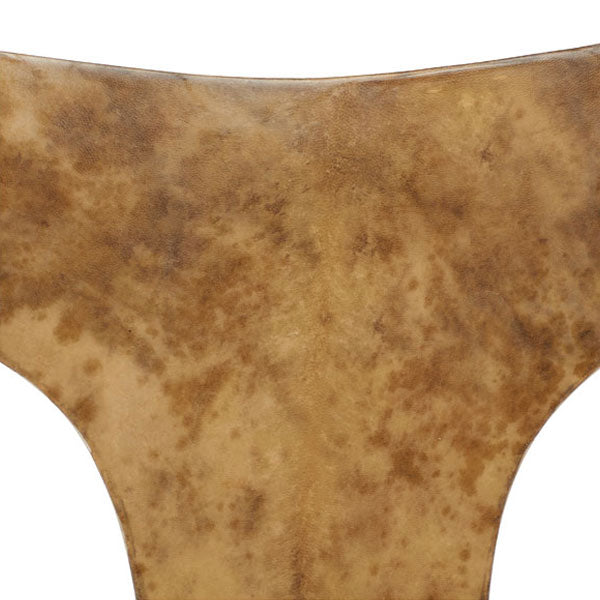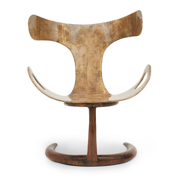 This bold sculptural seat is mantled in a hand-dyed goatskin finished with a high-gloss resin glaze