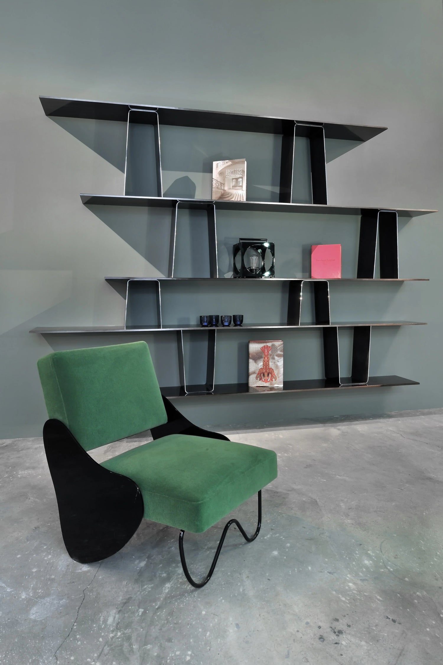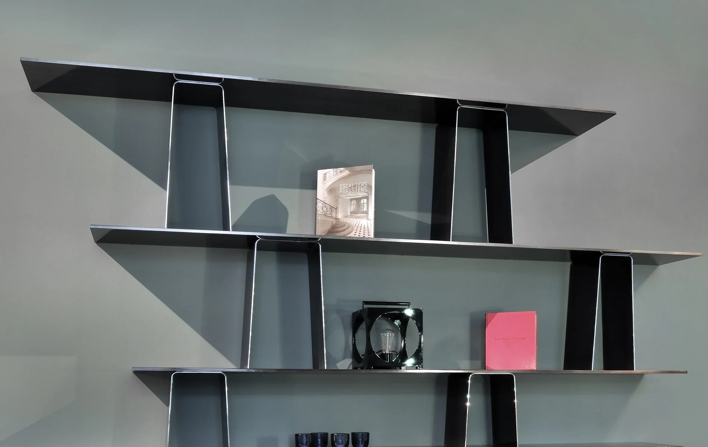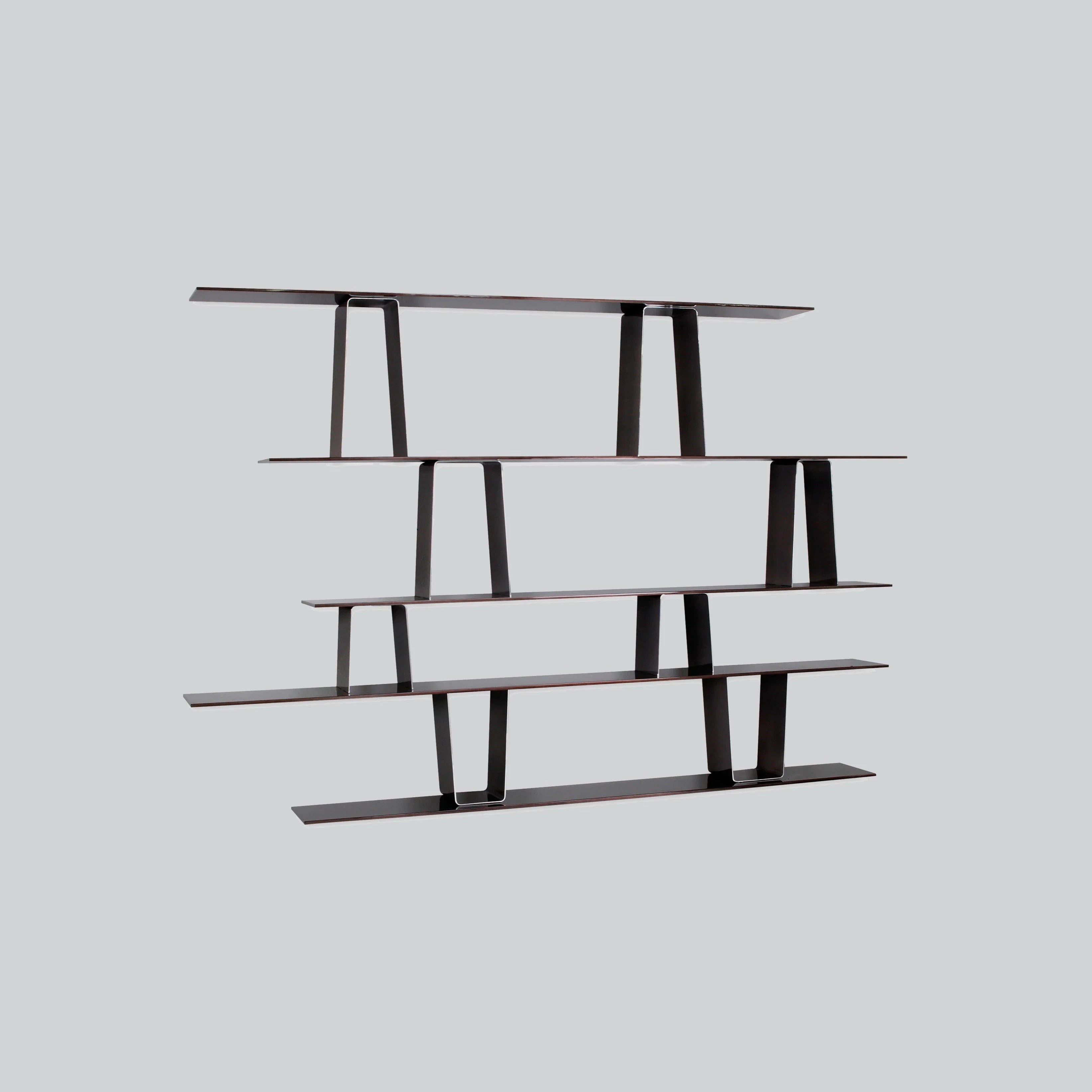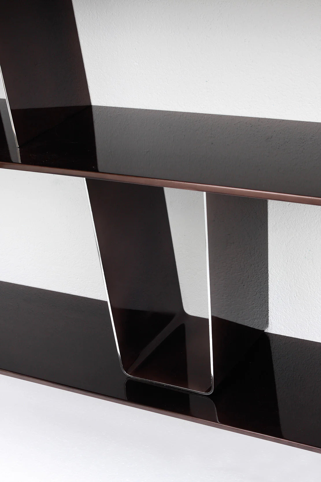 Designed as an unstructured wall composition with a streamlined look, the Sydney bookcase is available in brushed aluminum, varnished in smoky gray or smoky brown