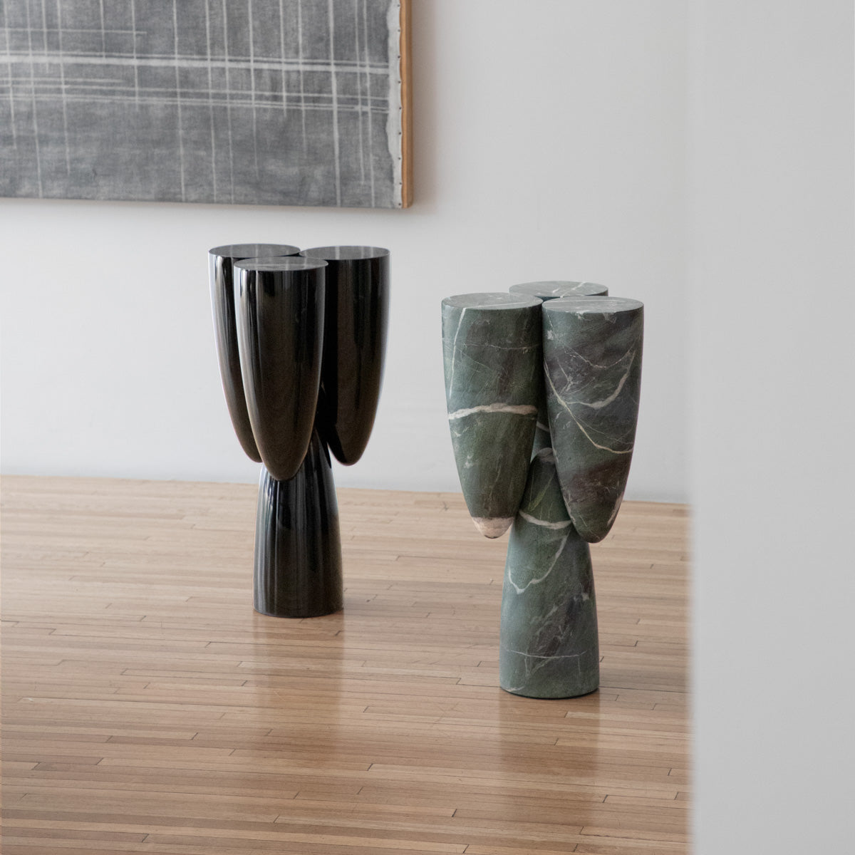 The EWE Studio Copal side tables are composed by four identical pieces linked together with hidden locks, making the observer feel like three out of the four parts of the table are just touching and hovering in the air